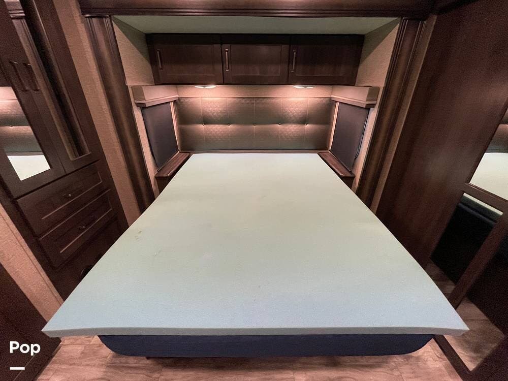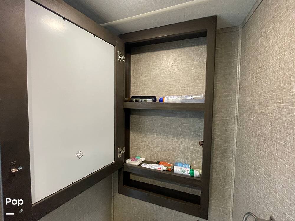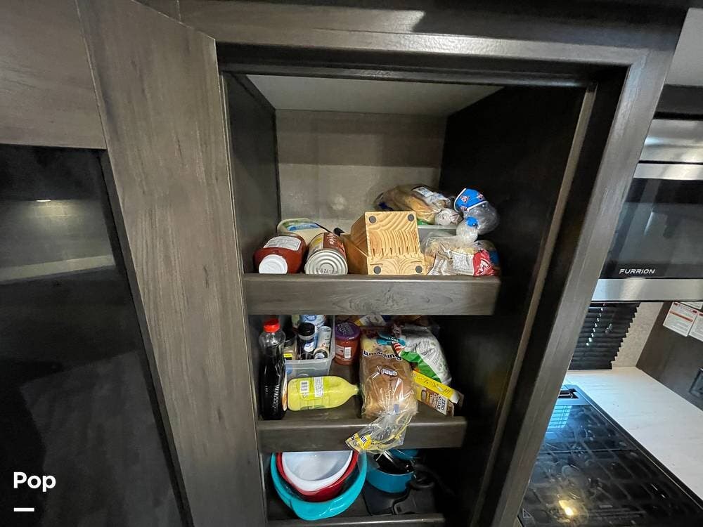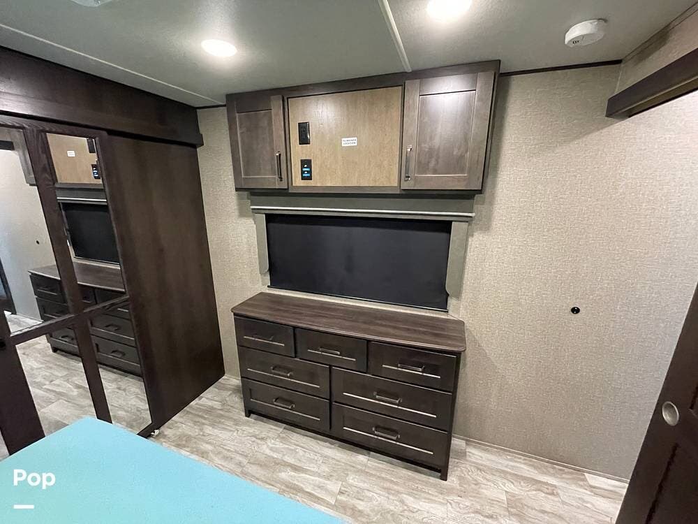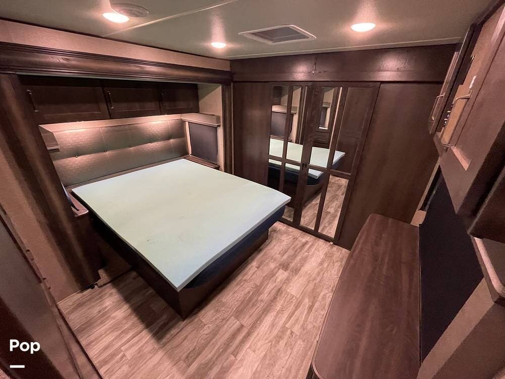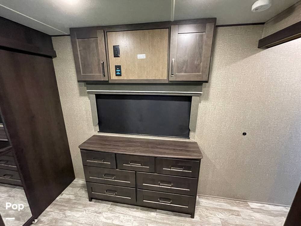 Running along the front of the RV is a large closet with mirrored doors providing much storage. The closet features built-in shelving, motion-activated lights, and is washer/dryer prepped.