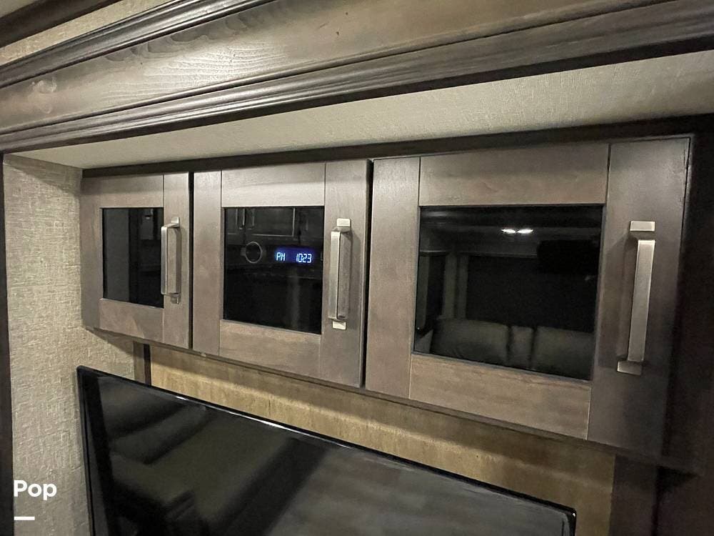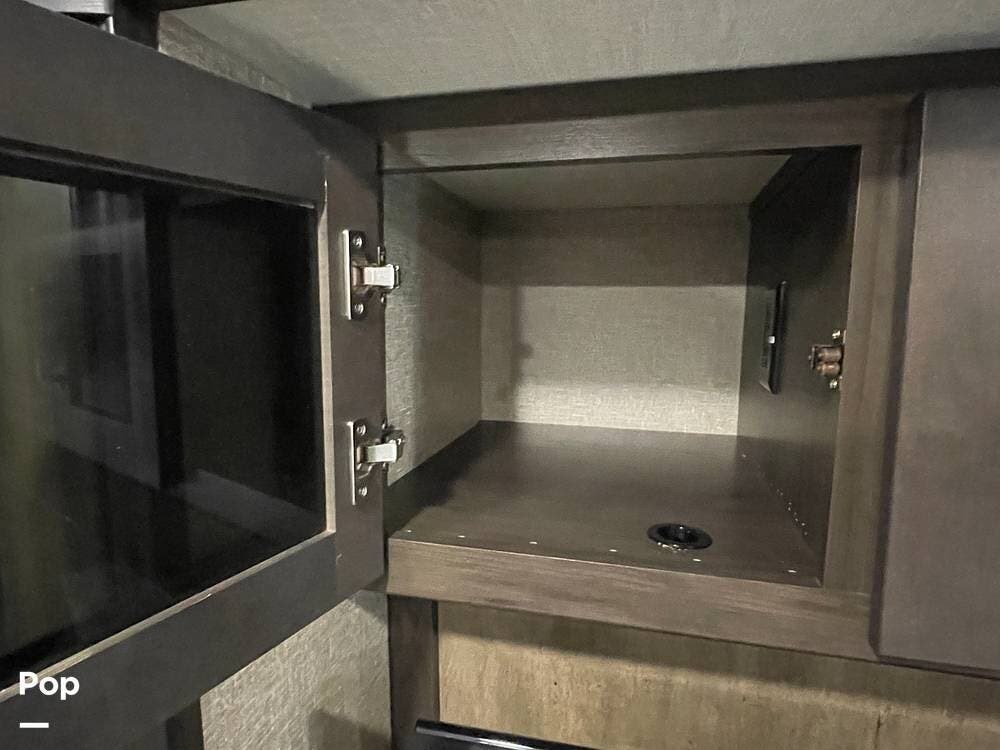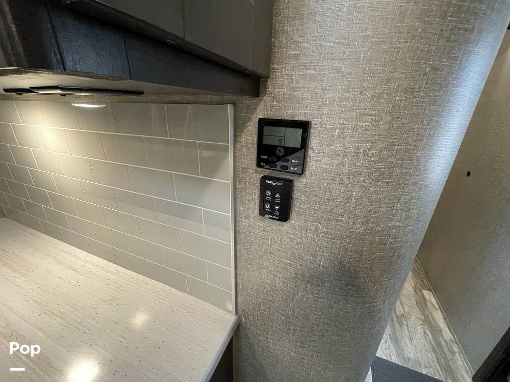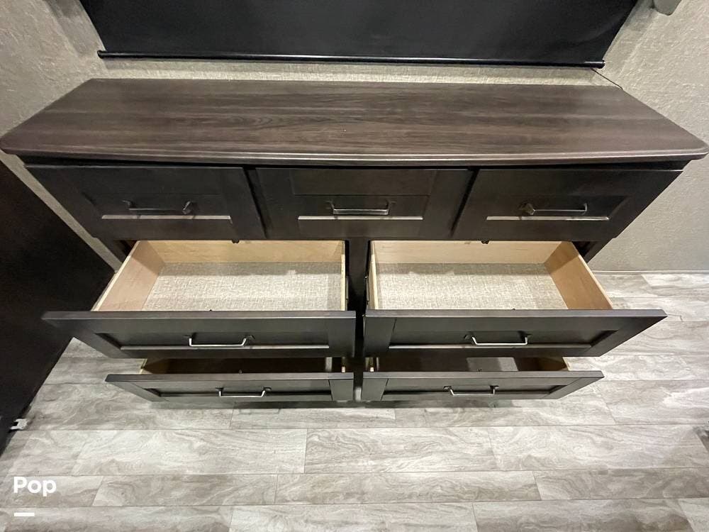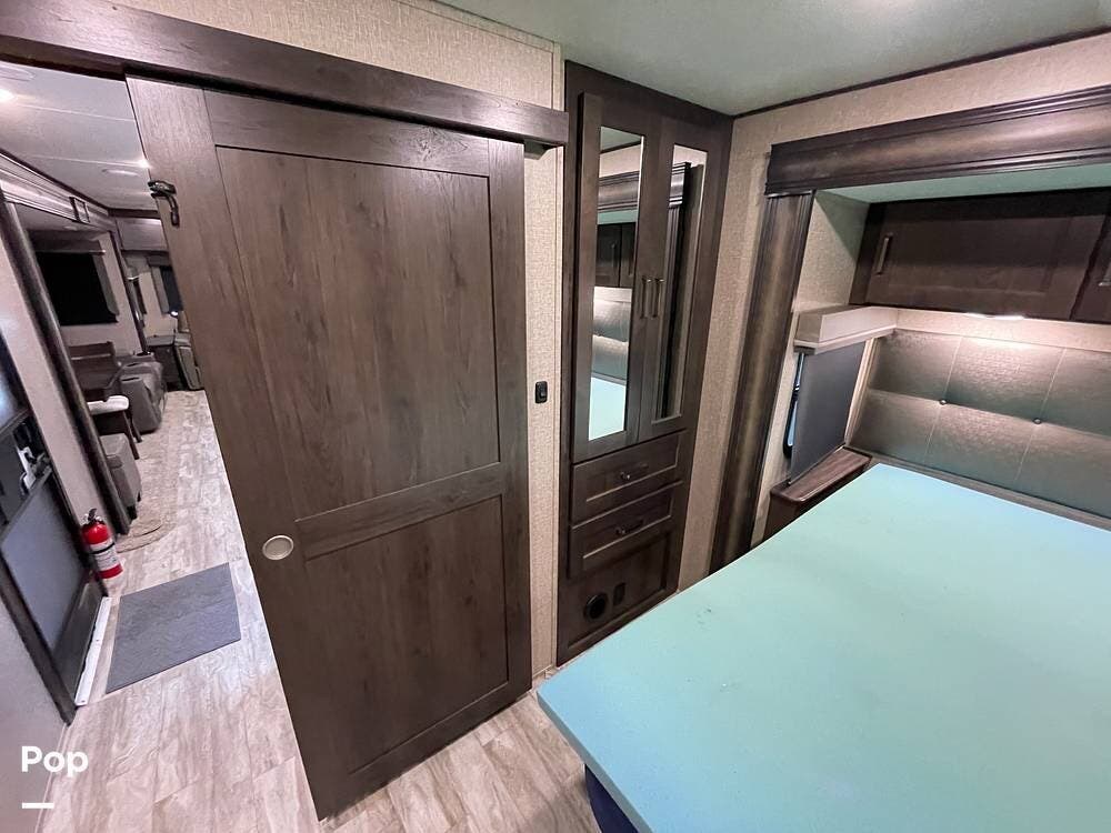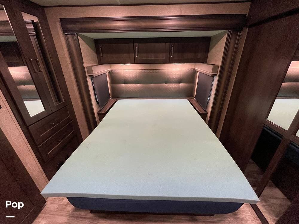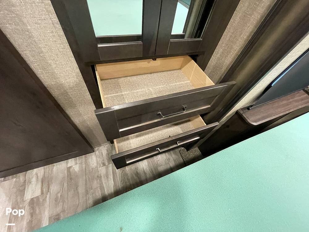 Running along the front of the RV is a large closet with mirrored doors providing much storage. The closet features built-in shelving, motion-activated lights, and is washer/dryer prepped.