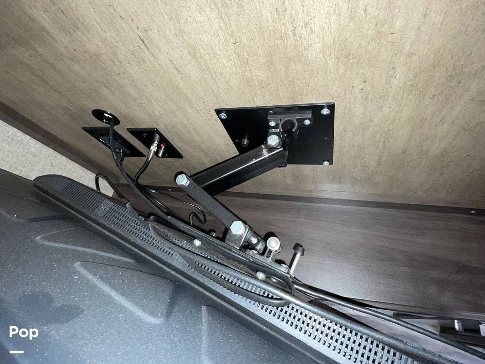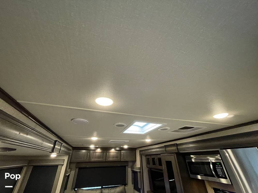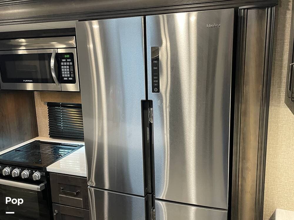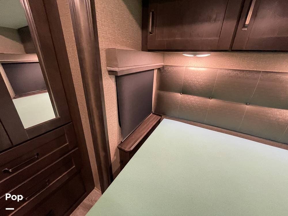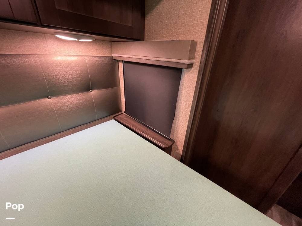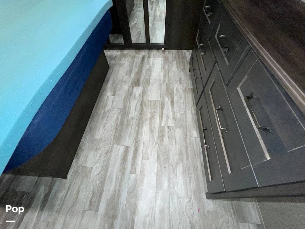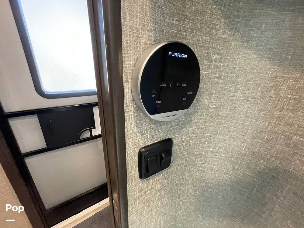 Running along the front of the RV is a large closet with mirrored doors providing much storage. The closet features built-in shelving, motion-activated lights, and is washer/dryer prepped.