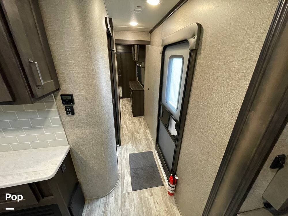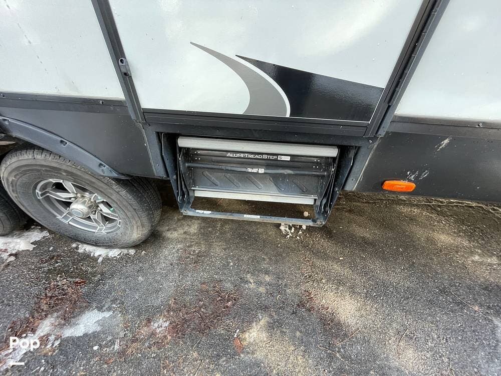 Upon entering, the manual fold-out steps lead to a short hallway to the right, which leads to the full bathroom and main bedroom.