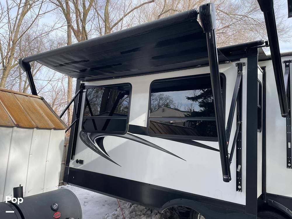Two exterior features include two awnings. One awning covers the patio area, while the other is located on the right rear slide.