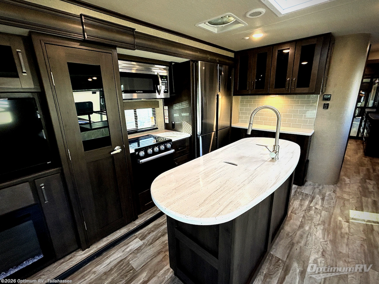 The chef of the group will love the gourmet kitchen including the 16 cu. ft. refrigerator that will hold lots of cold ingredients, beverages and leftovers, the center island when preparing and serving meals, and the hutch with overhead cabinets to display decor and store dishes and such. This area also includes two slide outs for more floor space and furniture to relax on including theatre seating with cupholders for your drinks, a booth dinette to dine at and work from or choose a free standing dinette option, and a rear tri-fold sofa that offers sleeping space for two at night. There is a 40" LED HDTV with fireplace below to enjoy while inside, plus there are two awnings outdoors to relax under. When you are ready to call it a night, get cleaned up in the full bathroom, and retire to your front bedroom with a slide out queen bed or choose a king option, a front full-wall wardrobe with washer/dryer prep, a dresser and an additional wardrobe with drawers.