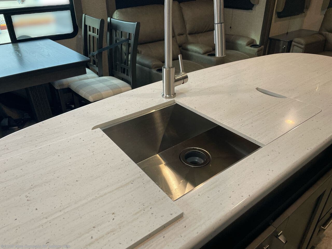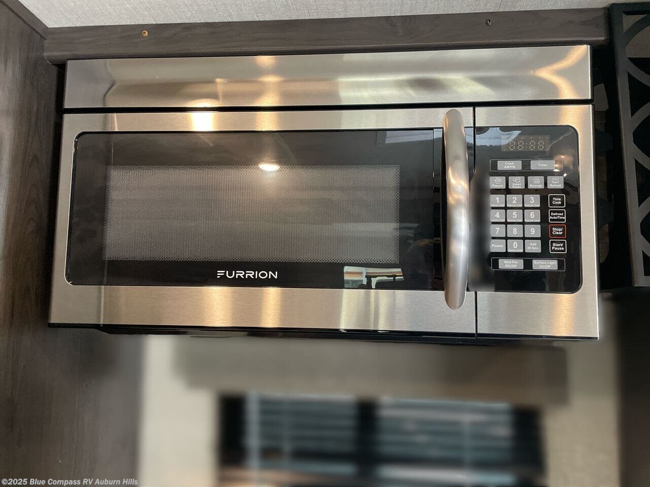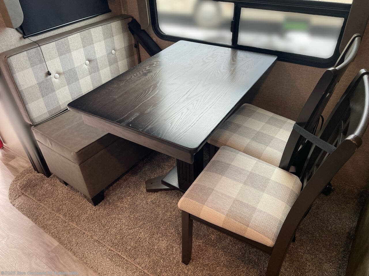 The chef of the group will love the gourmet kitchen including the 16 cu. ft. refrigerator that will hold lots of cold ingredients, beverages and leftovers, the center island when preparing and serving meals, and the hutch with overhead cabinets to display decor and store dishes and such. This area also includes two slide outs for more floor space and furniture to relax on including theatre seating with cupholders for your drinks, a booth dinette to dine at and work from or choose a free standing dinette option, and a rear tri-fold sofa that offers sleeping space for two at night. There is a 40" LED HDTV with fireplace below to enjoy while inside, plus there are two awnings outdoors to relax under. When you are ready to call it a night, get cleaned up in the full bathroom, and retire to your front bedroom with a slide out queen bed or choose a king option, a front full-wall wardrobe with washer/dryer prep, a dresser and an additional wardrobe with drawers.