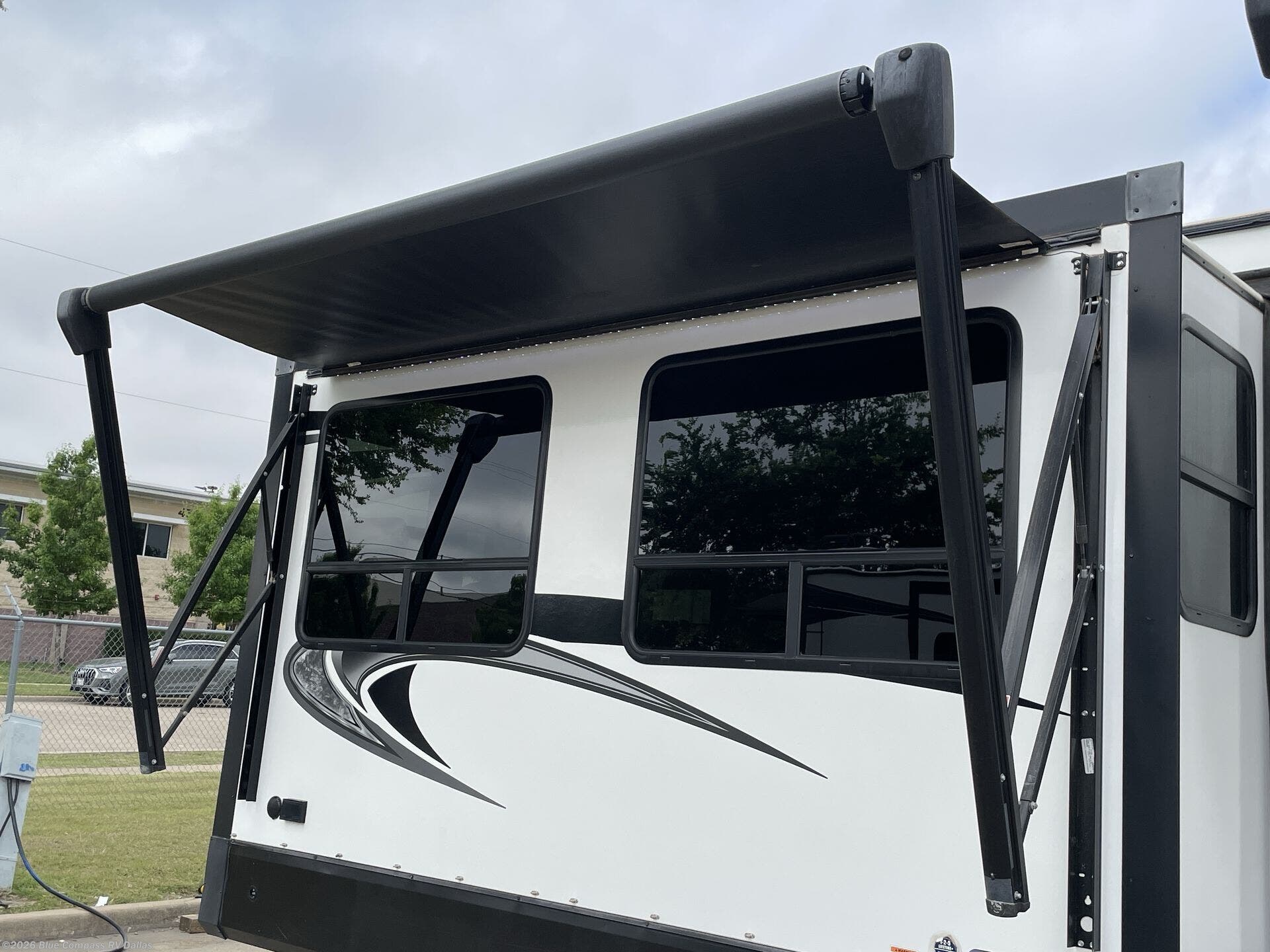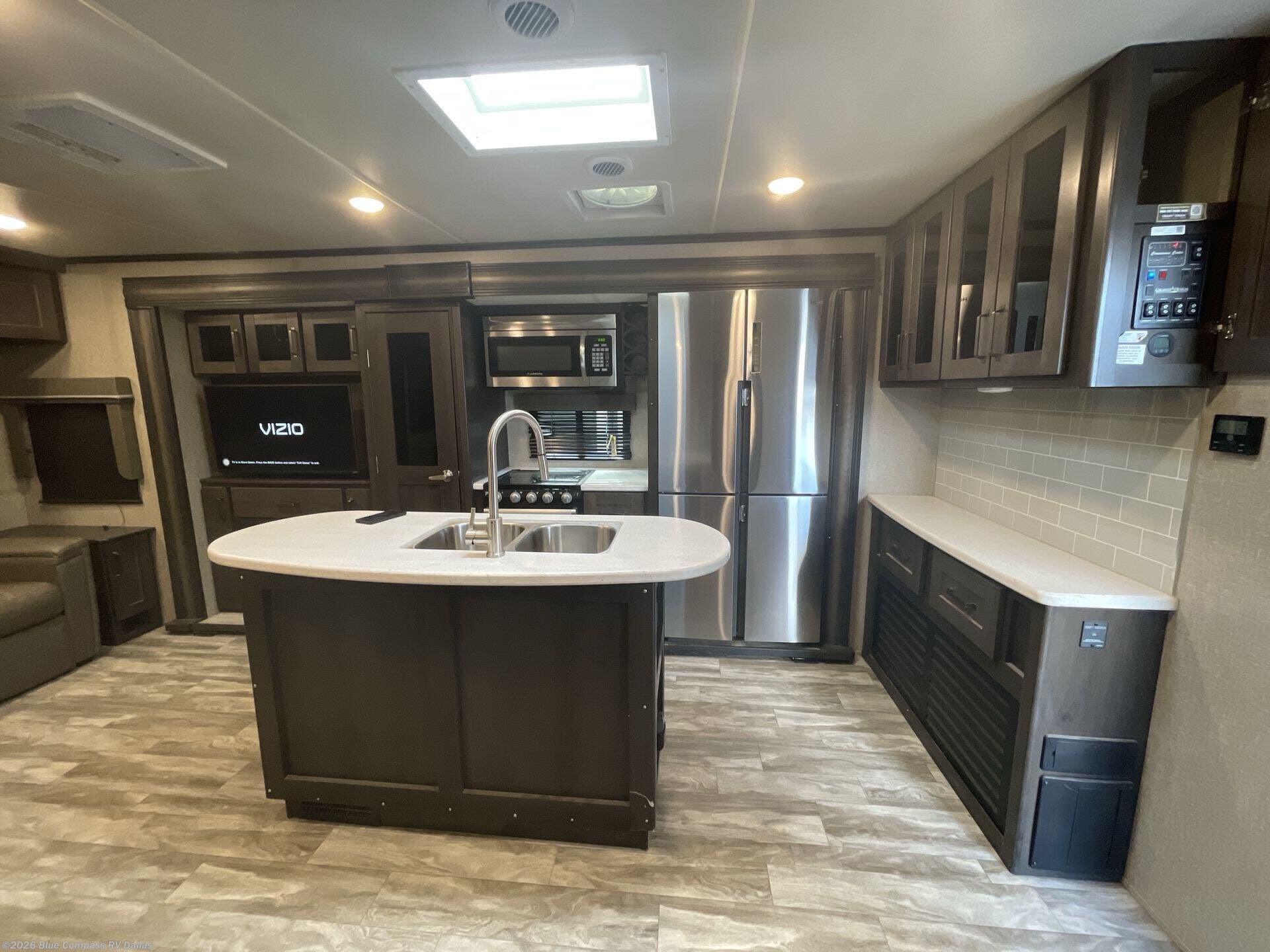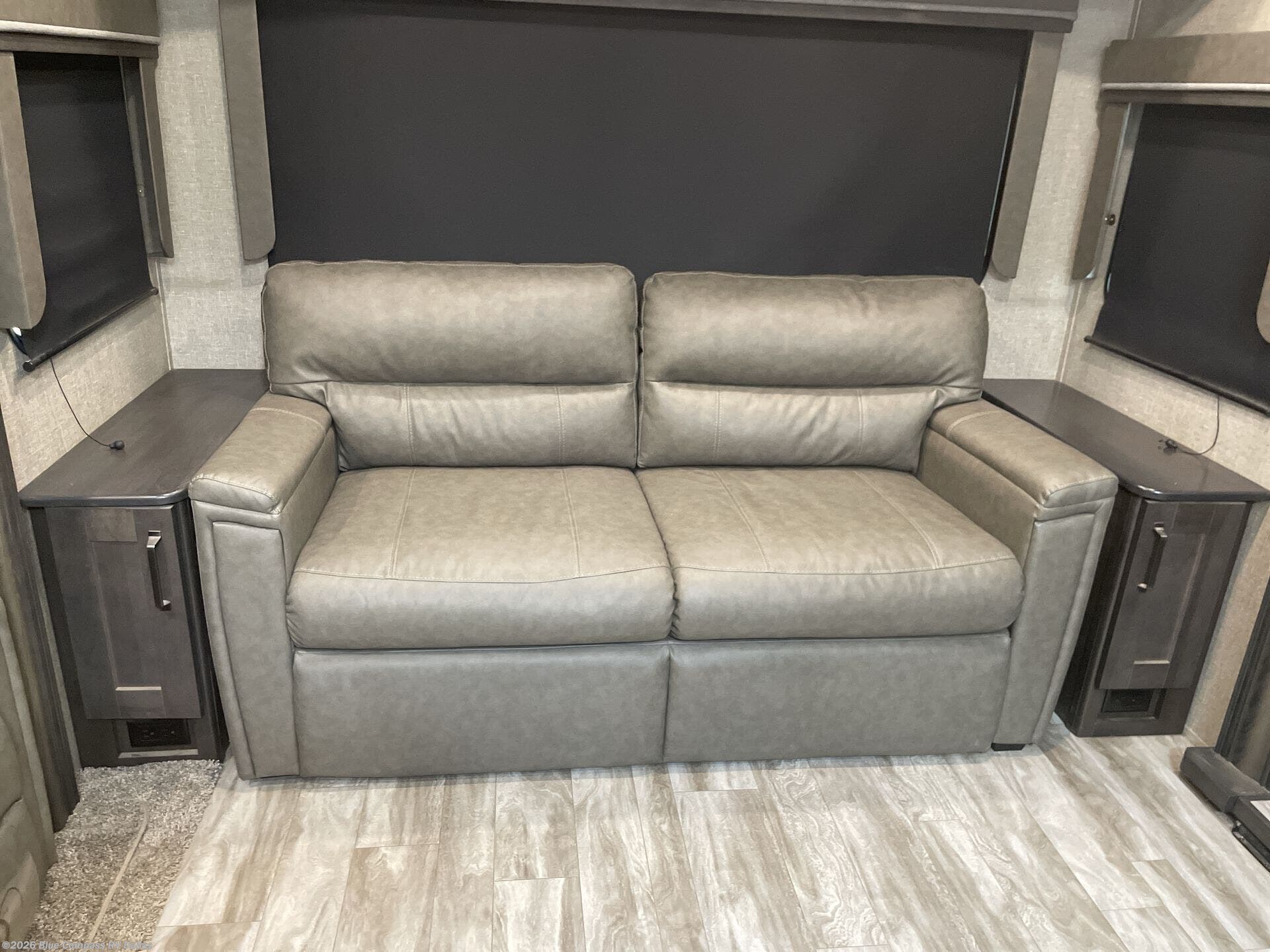 The chef of the group will love the gourmet kitchen including the 16 cu. ft. refrigerator that will hold lots of cold ingredients, beverages and leftovers, the center island when preparing and serving meals, and the hutch with overhead cabinets to display decor and store dishes and such. This area also includes two slide outs for more floor space and furniture to relax on including theatre seating with cupholders for your drinks, a booth dinette to dine at and work from or choose a free standing dinette option, and a rear tri-fold sofa that offers sleeping space for two at night. There is a 40" LED HDTV with fireplace below to enjoy while inside, plus there are two awnings outdoors to relax under. When you are ready to call it a night, get cleaned up in the full bathroom, and retire to your front bedroom with a slide out queen bed or choose a king option, a front full-wall wardrobe with washer/dryer prep, a dresser and an additional wardrobe with drawers.