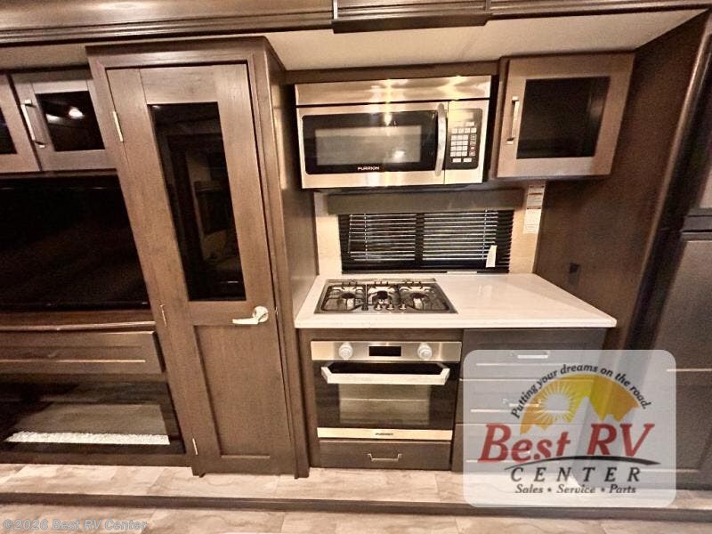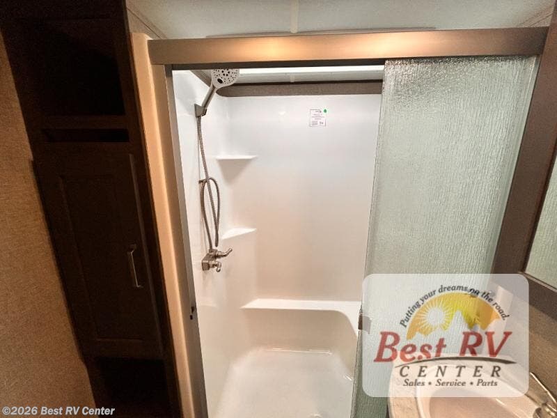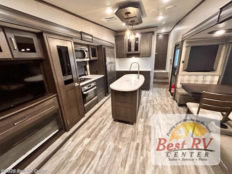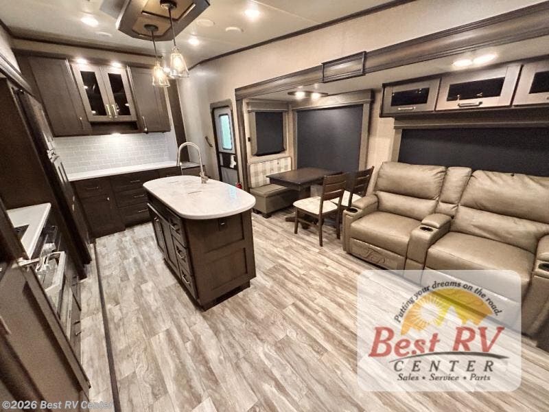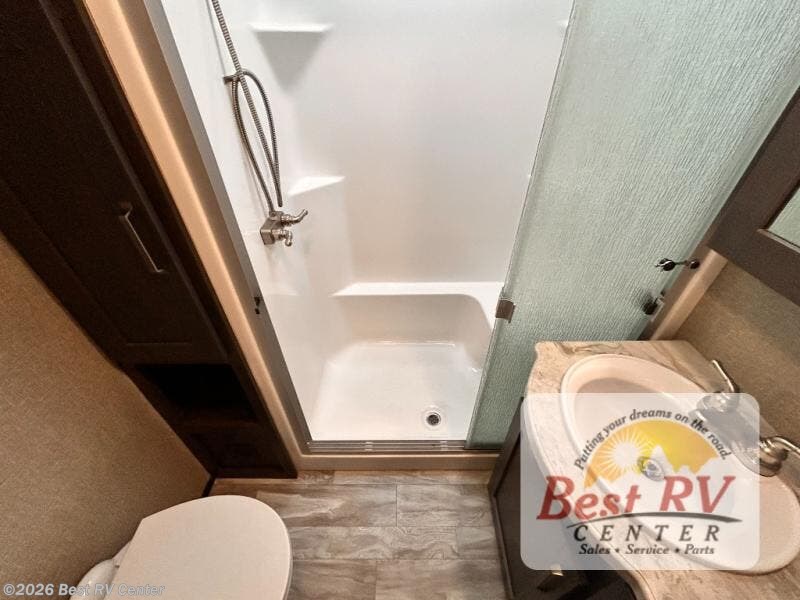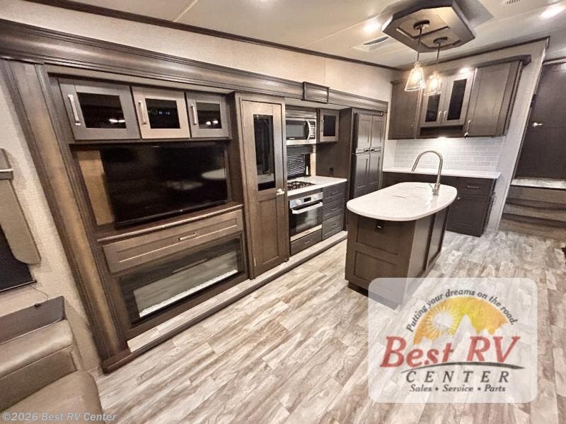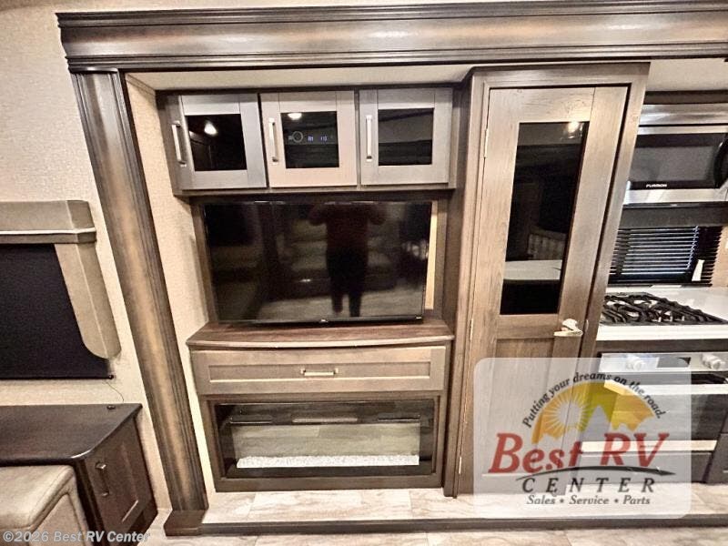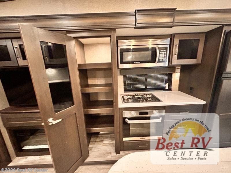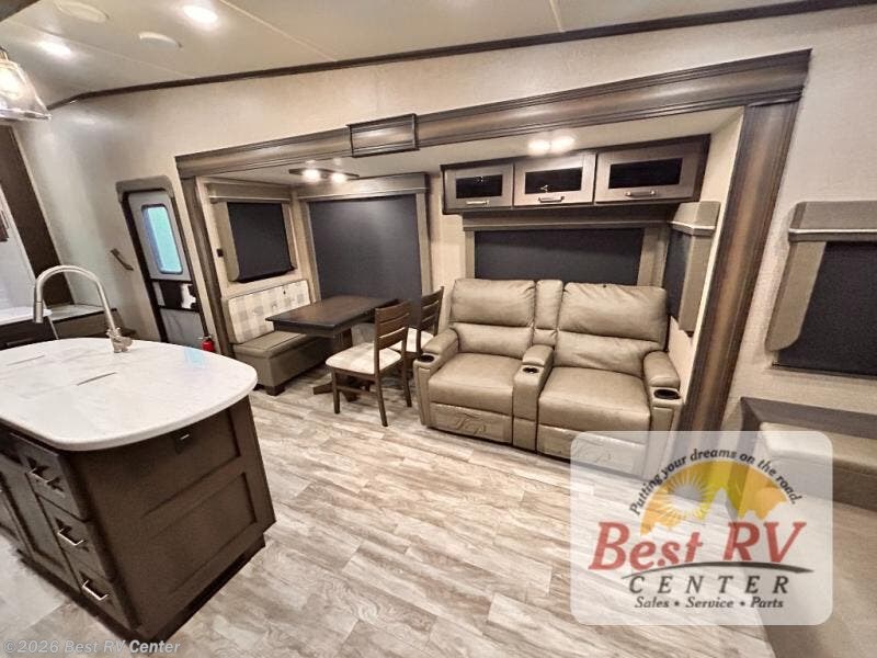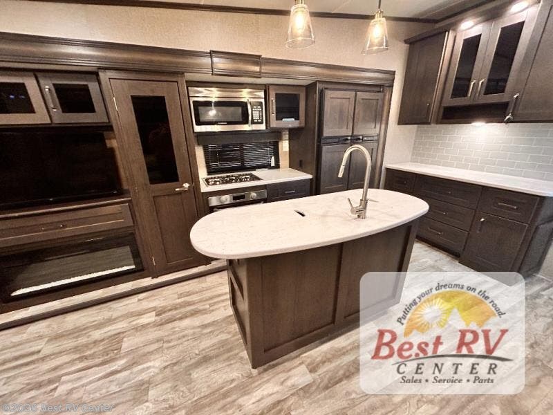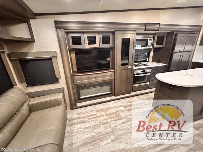 You can enjoy a spacious rear living area in this RV with dual opposing slides offering you entertainment, kitchen amenities, seating and windows for great views! The rear tri-fold sofa also converts into extra sleeping space for an extra guest or two, just like the booth dinette does. Yet you might like to add the free standing dinette option. There are theatre seats to enjoy while you place your drinks in the cupholders and watch the entertainment center with a 40" LED HDTV and fireplace. The pantry is big enough to store your favorite snacks, and the kitchen island will make meal prepping easier, plus there is a 16 cu. ft. refrigerator to store any leftovers. The full bathroom has a 30" x 48" fiberglass shower with a skylight above for natural lighting as you get ready and a linen closet to store your towels. The front private bedroom has a comfortable queen bed slide that can be switched out for the optional king bed, a dresser with overhead cabinets, and a full wall wardrobe that is prepped to add the optional washer and dryer so that you can extend your camping trip with clean clothes!