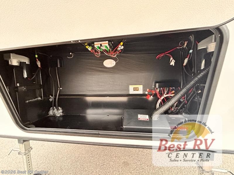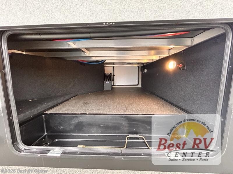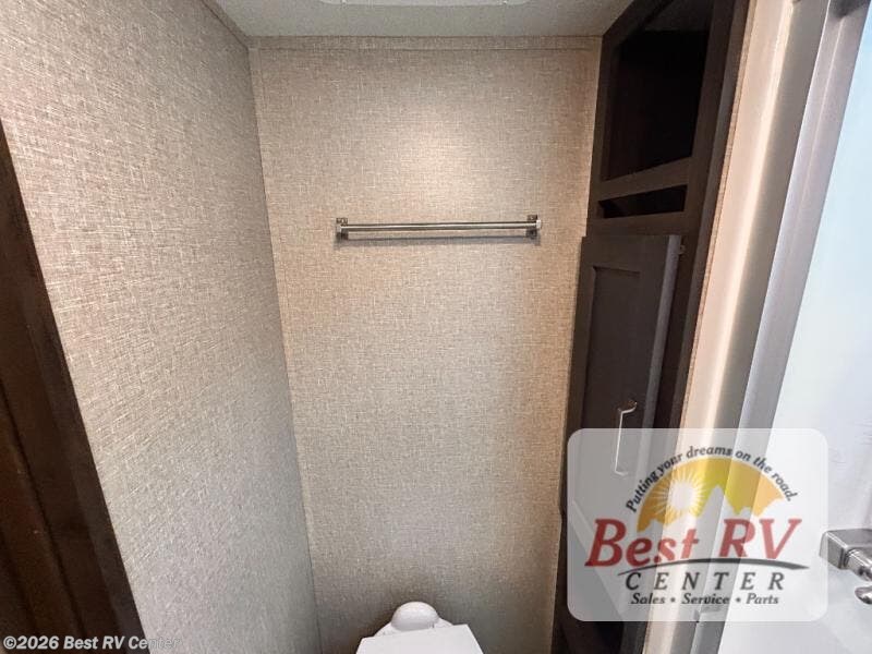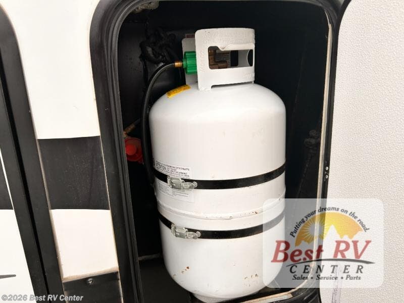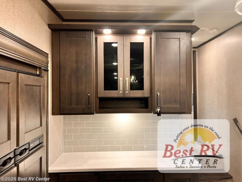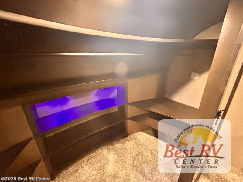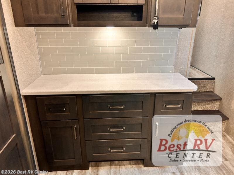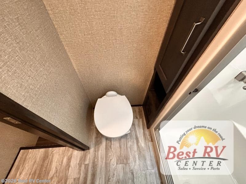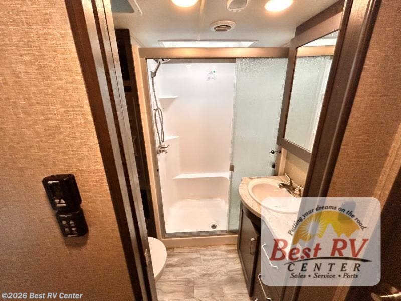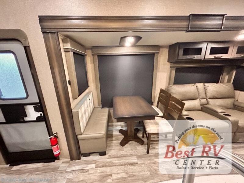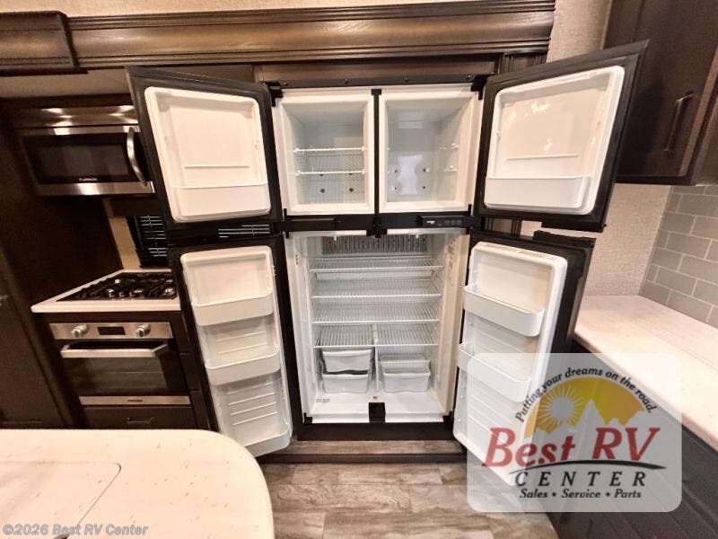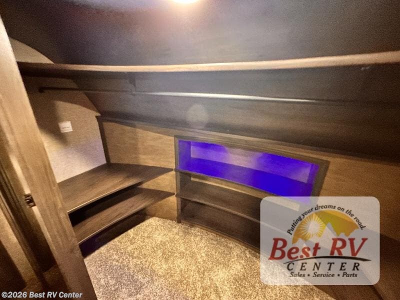 You can enjoy a spacious rear living area in this RV with dual opposing slides offering you entertainment, kitchen amenities, seating and windows for great views! The rear tri-fold sofa also converts into extra sleeping space for an extra guest or two, just like the booth dinette does. Yet you might like to add the free standing dinette option. There are theatre seats to enjoy while you place your drinks in the cupholders and watch the entertainment center with a 40" LED HDTV and fireplace. The pantry is big enough to store your favorite snacks, and the kitchen island will make meal prepping easier, plus there is a 16 cu. ft. refrigerator to store any leftovers. The full bathroom has a 30" x 48" fiberglass shower with a skylight above for natural lighting as you get ready and a linen closet to store your towels. The front private bedroom has a comfortable queen bed slide that can be switched out for the optional king bed, a dresser with overhead cabinets, and a full wall wardrobe that is prepped to add the optional washer and dryer so that you can extend your camping trip with clean clothes!