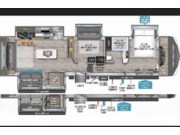 Moving back, you'll see the main living area with a kitchen island, large pantry, fridge/freezer, microwave, stove, and then the entertainment center and fireplace directly to the left. Surrounding this area is a dinette, theatre seating, and a tri-fold sofa.