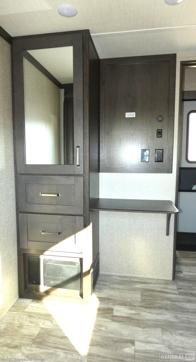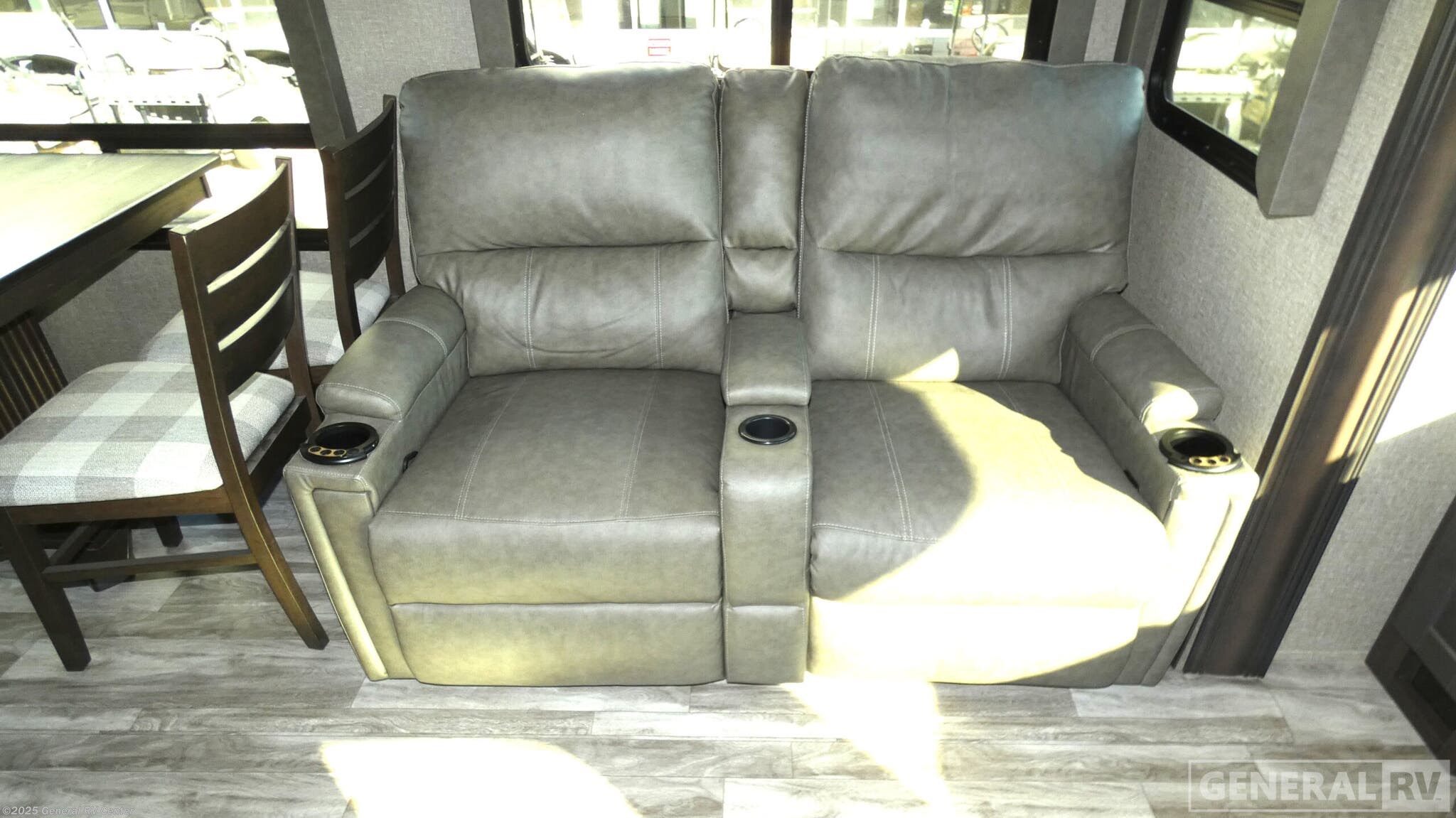 Travel to see new state parks, RV resorts or your family in other states as you tow this fifth wheel to each destination to enjoy comfort and convenience, plus a place to work and be able to offer extra sleeping space for friends and family when they visit! The middle extra room provides a tri-fold sofa slide, a desk, a wardrobe, plus a 64" x 88" upper bed loft area with access from the hallway, which provides two different places to accommodate overnight guests. The full bathroom will keep everyone refreshed, and the front bedroom allows you to sleep on a queen bed slide. And you will love the front wardrobe, the dresser, and the option to add a washer/dryer. The main living and kitchen area provides plenty of seating from the rear tri-fold sofa, the dinette, and the theatre seats with cupholders. And the kitchen island, the appliances, and the large pantry allow you to take everything you need with you. With any Reflection fifth wheels by Grand Design, you will have a 165W solar panel for off-grid camping and a 50 Amp charge controller and inverter prep, a Max Turn radius front cap for easy towing around town and into your campsite, a Universal All-In-One Docking Station, unobstructed pass-through storage, and Goodyear E-rated tires. Some other top features include a chef's kitchen with a 30" stainless steel microwave and residential cooktop, a USB charging station, and the ductless "Evenflow" heating system with no vents in the floor to collect debris. Each is constructed of high gloss gel coat exterior sidewalls, residential 5" truss rafters, walk-on roof decking, a fiberglass and radiant foil roof and front cap insulation plus laminated aluminum framed side walls, rear wall, roof and end walls in slide rooms. Choose luxury, value and towability over all the others, take home a Reflection of your good taste!