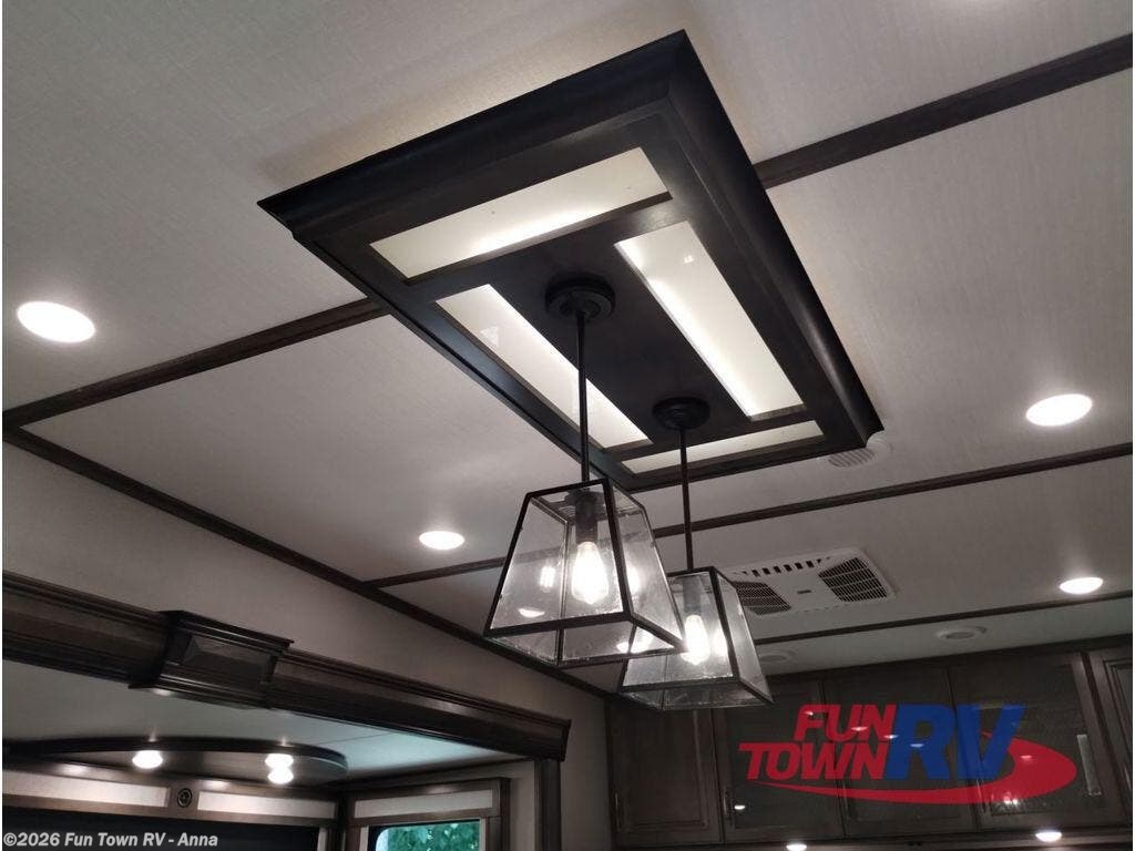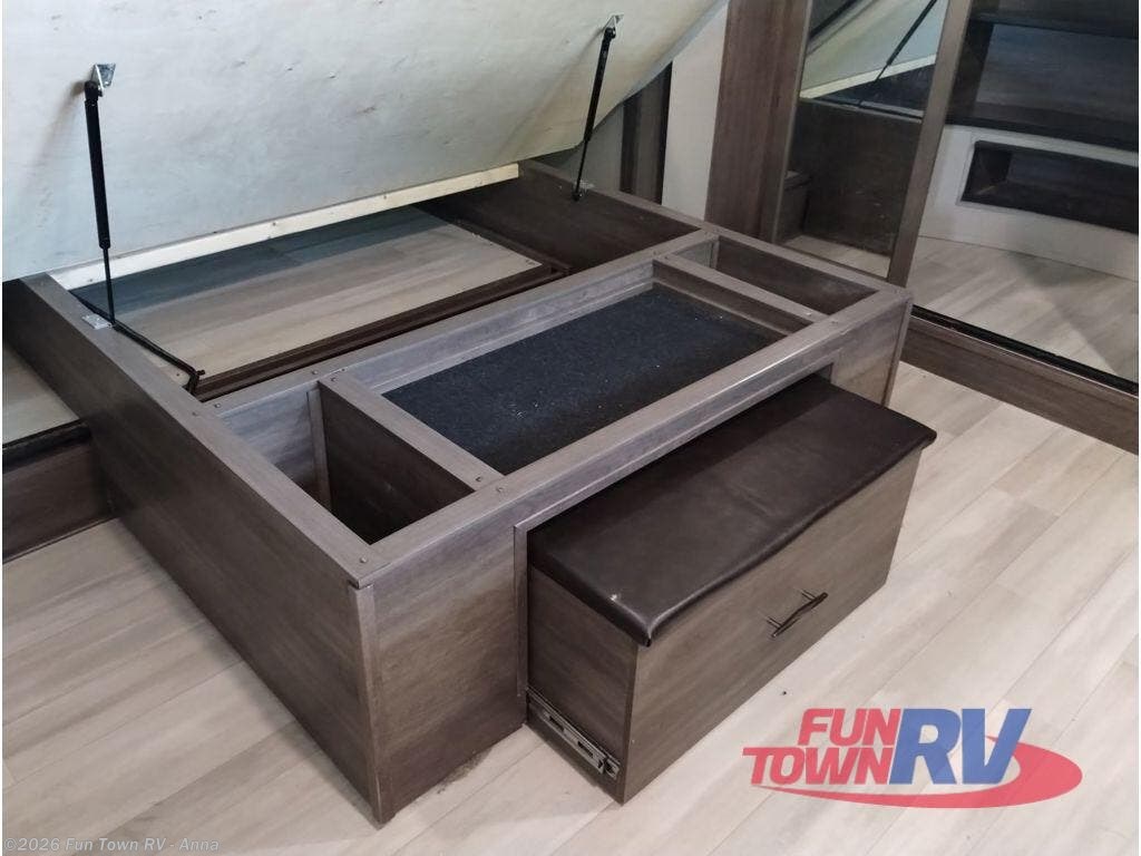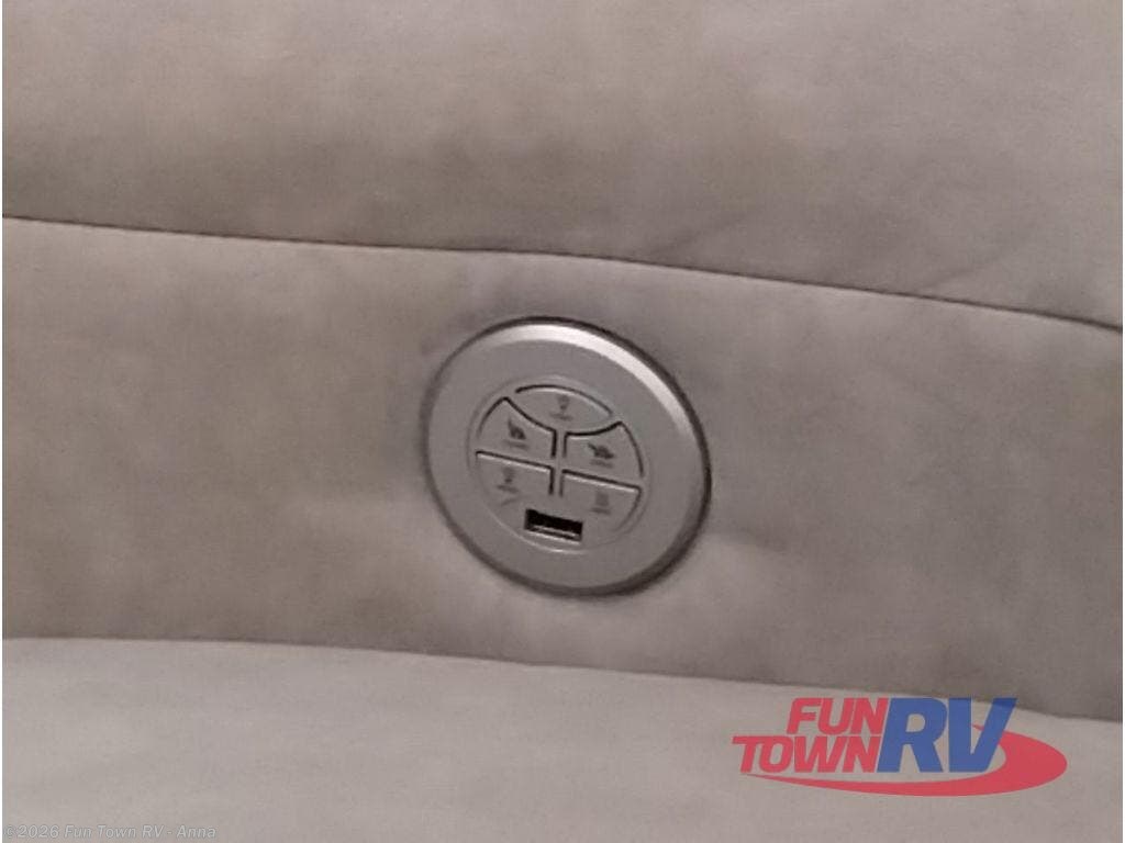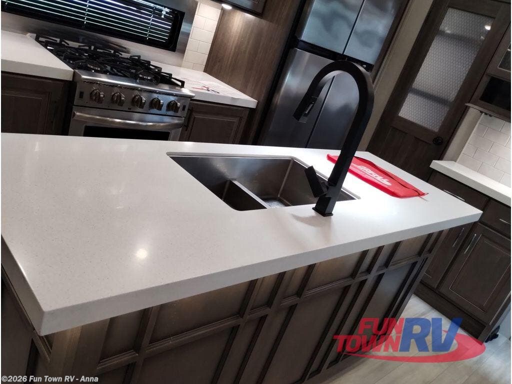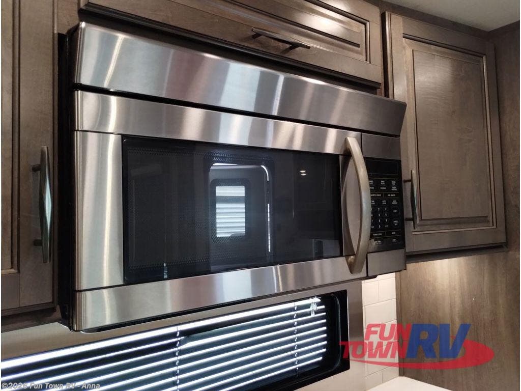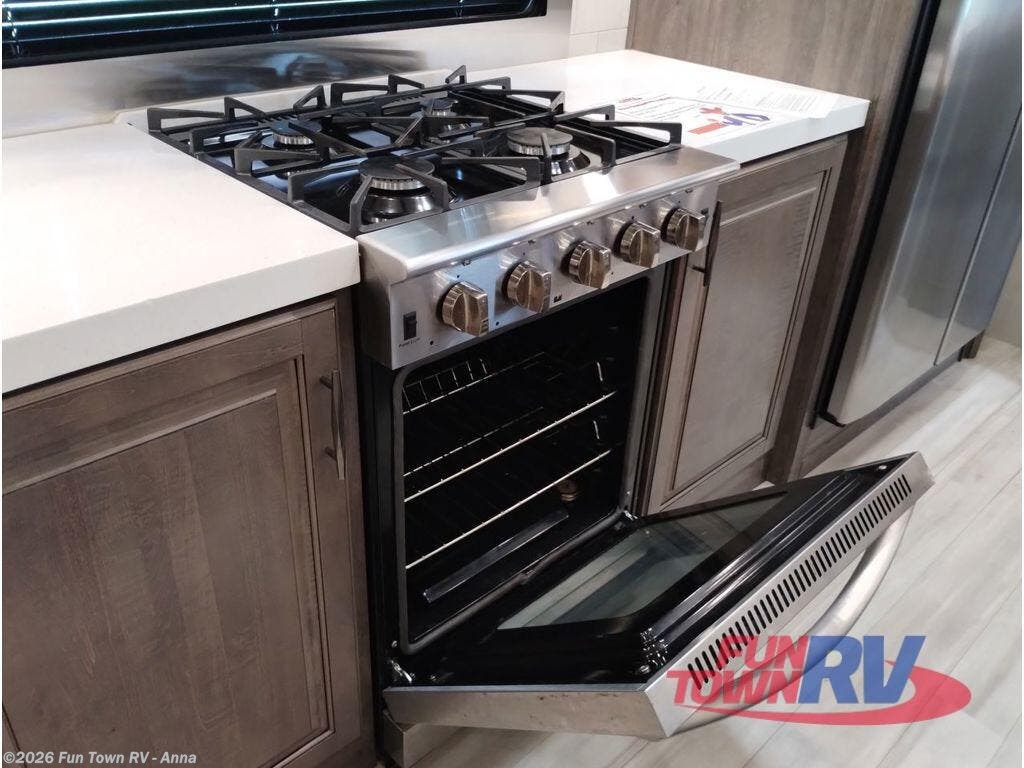 Traveling for long periods at a time is made easy with this kitchen that can feed a group a holiday meal! The professional-grade stainless steel cooktop with built-in oven, the microwave, the stainless steel 18 cu. ft. four-door refrigerator and the kitchen island offer everything you will need to enjoy cooking. Yet you might like to add the French door refrigerator option instead. You will find storage throughout including in the hutch, under the interior steps, and in the front master bedroom. There is a queen bed or choose a king, a pull-out ottoman, a closet prepped for a washer/dryer option, a larger wardrobe, plus a flip-top dresser with LED TV above. And the bathroom includes a shower with a seat and skylight. Plus you can add the exterior pull-out kitchen option to enjoy while relaxing under one of the two power awnings.