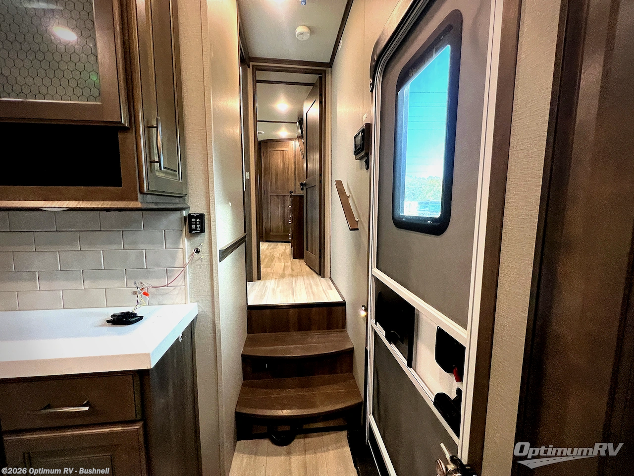 Traveling for long periods at a time is made easy with this kitchen that can feed a group a holiday meal! The professional-grade stainless steel cooktop with built-in oven, the microwave, the stainless steel 18 cu. ft. four-door refrigerator and the kitchen island offer everything you will need to enjoy cooking. Yet you might like to add the French door refrigerator option instead. You will find storage throughout including in the hutch, under the interior steps, and in the front master bedroom. There is a queen bed or choose a king, a pull-out ottoman, a closet prepped for a washer/dryer option, a larger wardrobe, plus a flip-top dresser with LED TV above. And the bathroom includes a shower with a seat and skylight. Plus you can add the exterior pull-out kitchen option to enjoy while relaxing under one of the two power awnings.