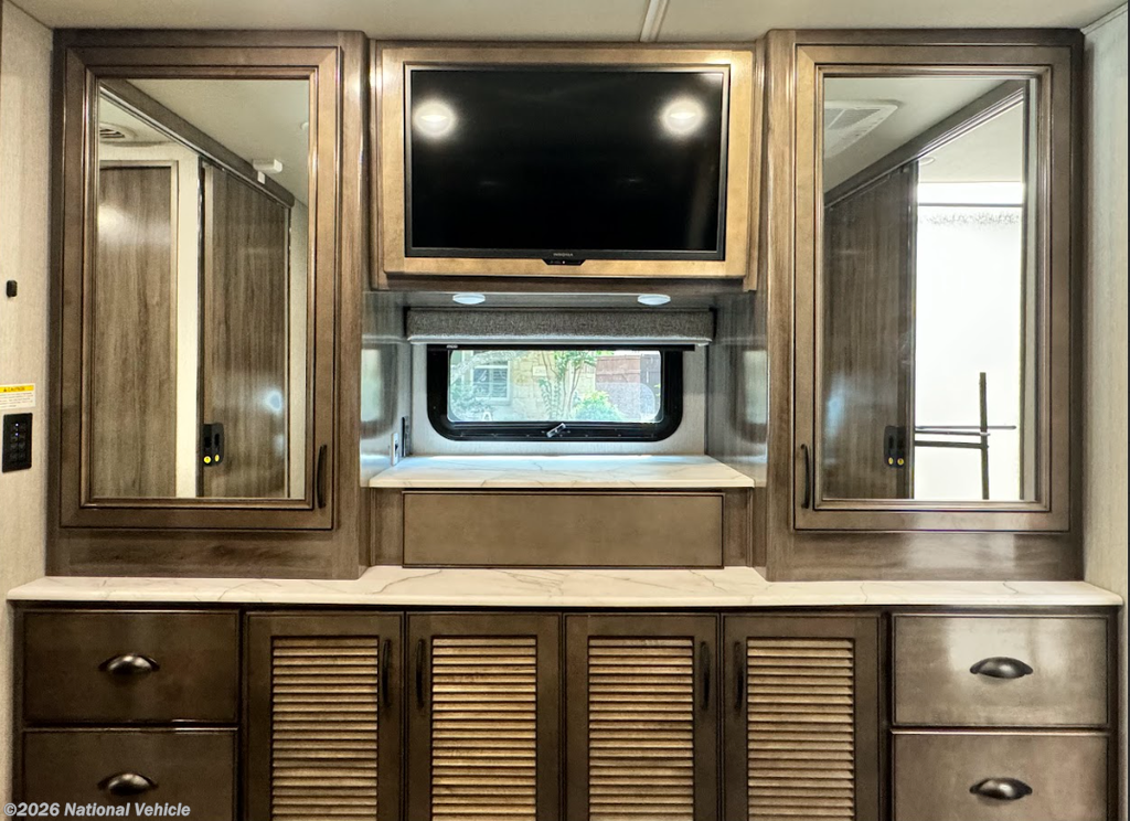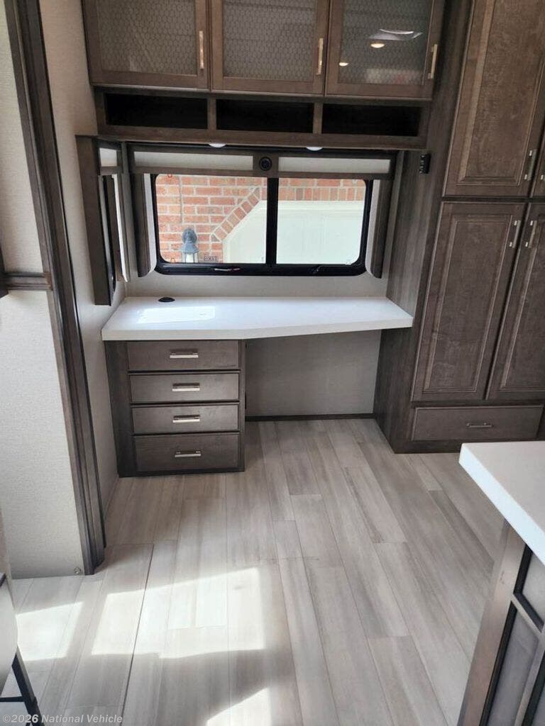 Beautifully maintained Grand Design Solitude 345GK-R designed for extended stays or full-time travel. This spacious rear-living floorplan offers residential comfort, excellent storage, and a rare rear desk workspace perfect for remote work or trip planning.