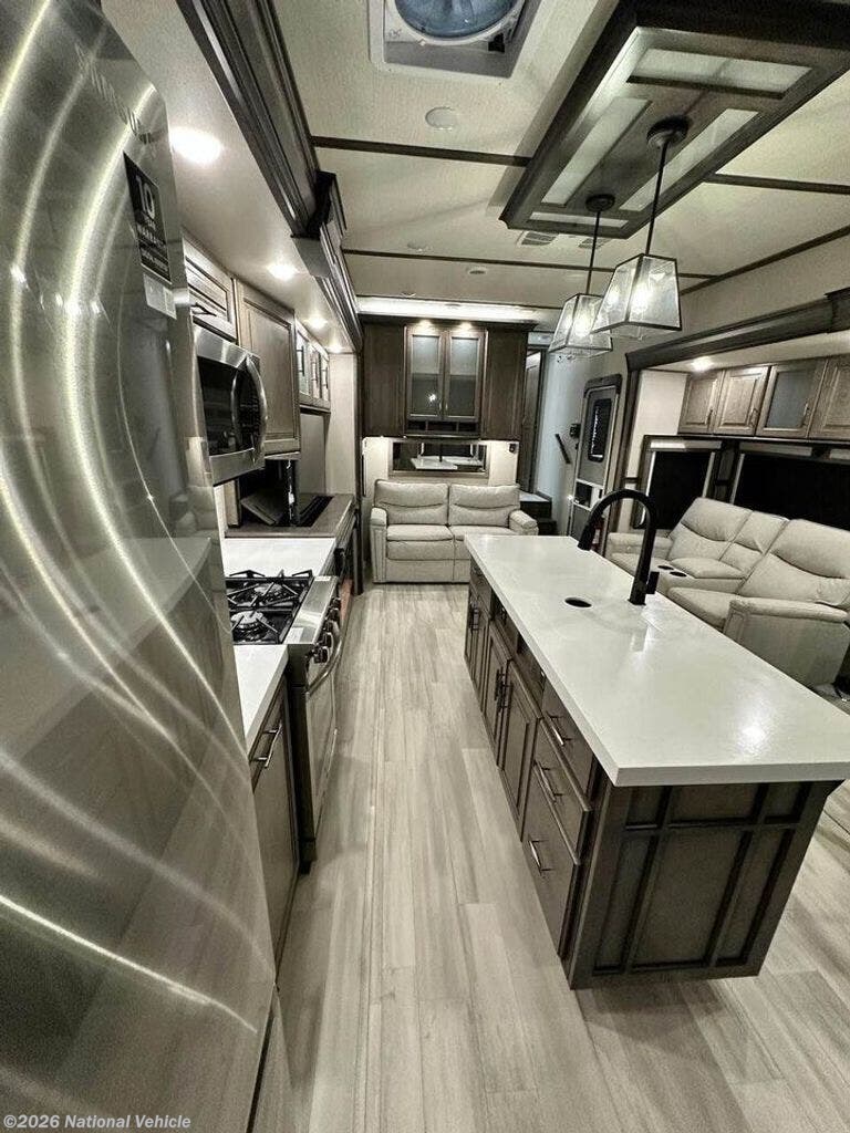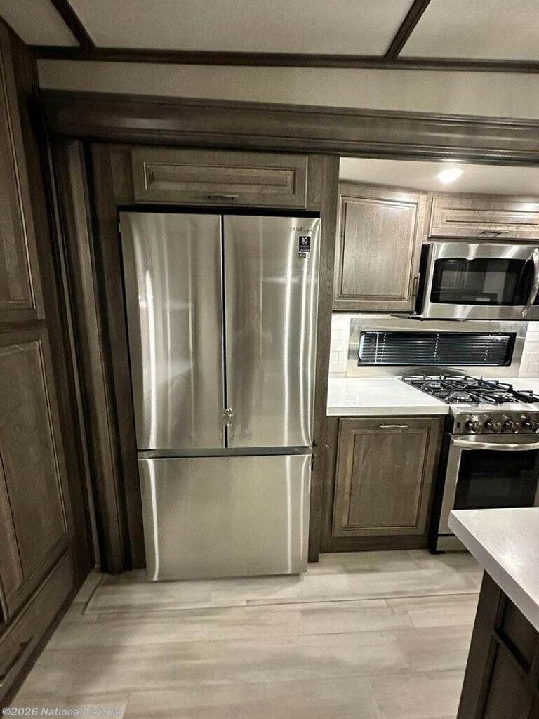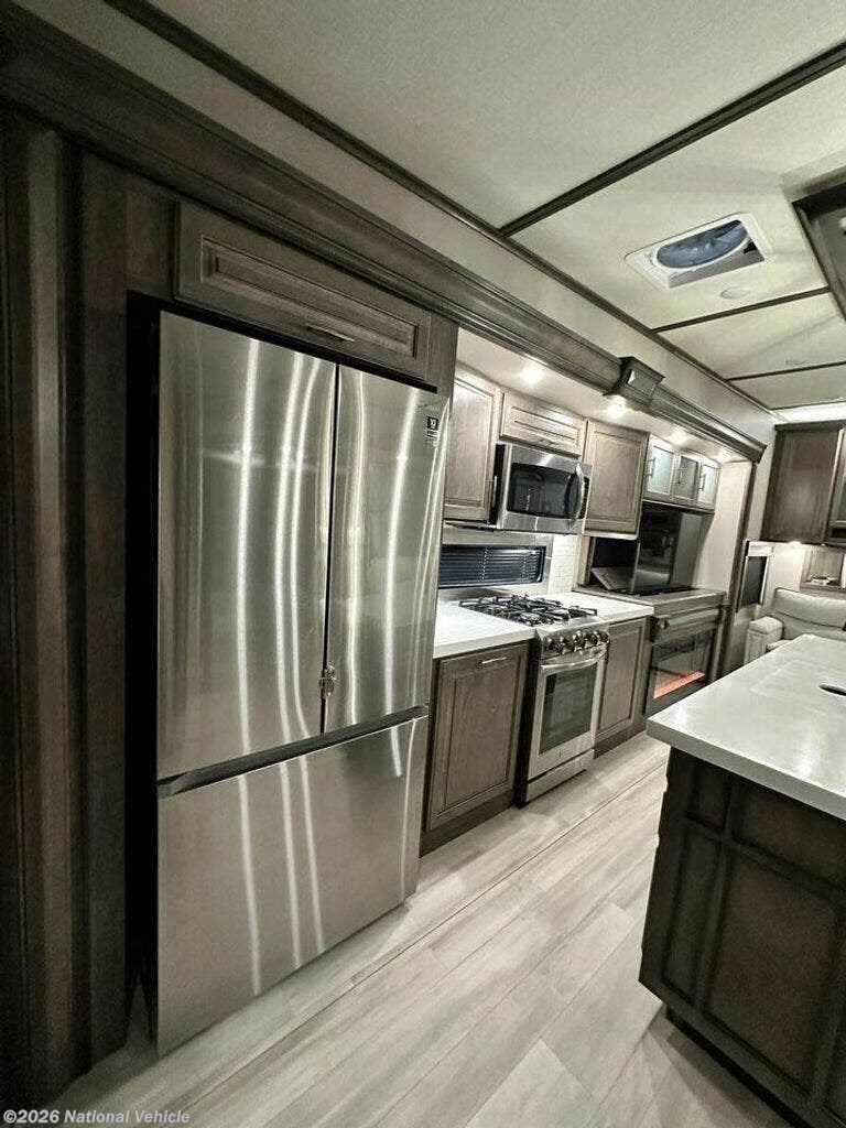 The interior features Grand Design?s high-end finishes including solid cabinetry, a residential refrigerator, large kitchen island, theater seating, and a tri-fold sleeper sofa for guests. Wide opposing slide-outs create an open living area, while the large panoramic windows bring in natural light. Entry is easy with the SolidStep quad steps, providing stability and convenience at every stop.