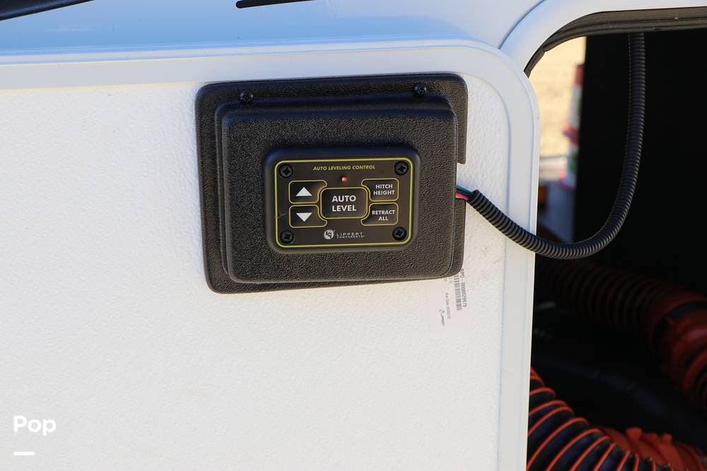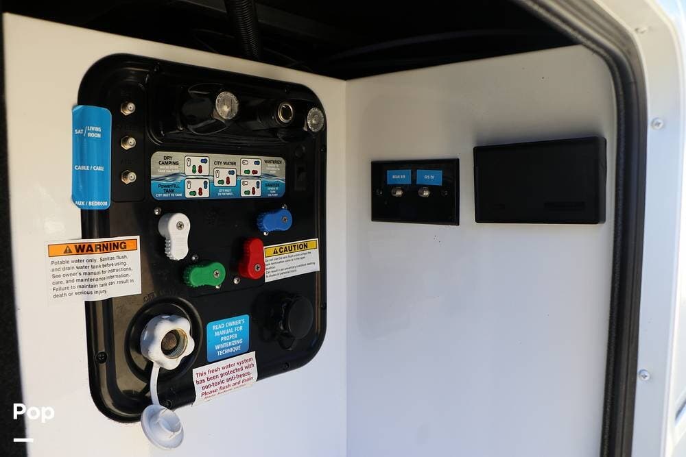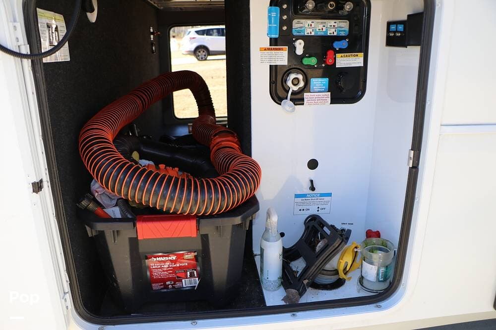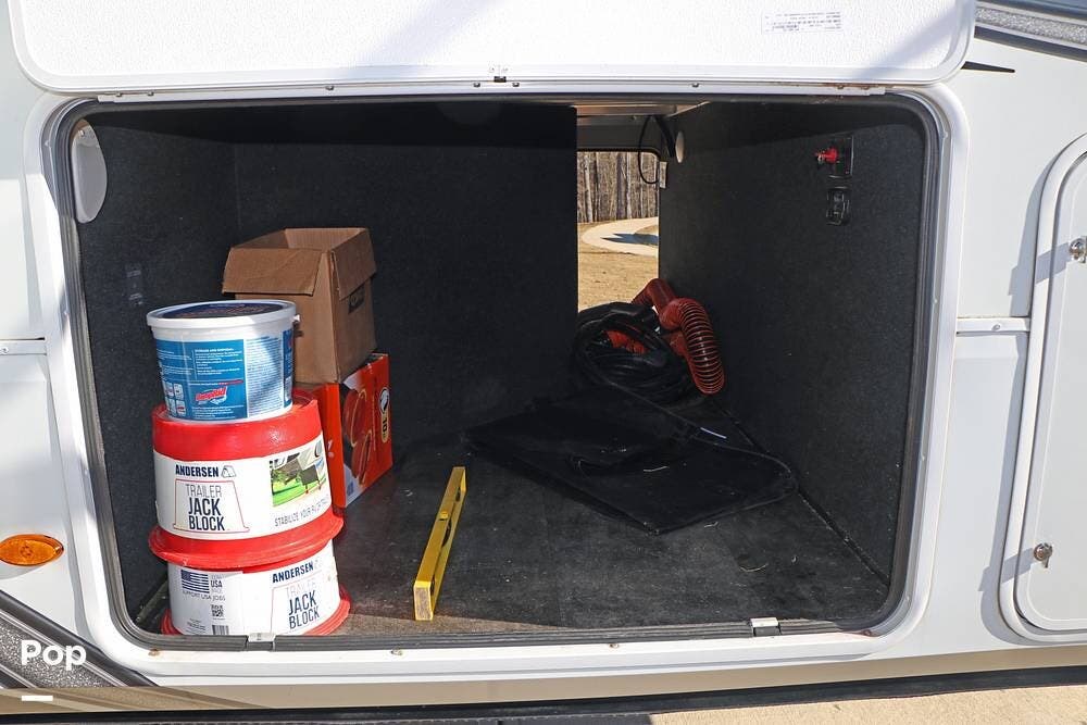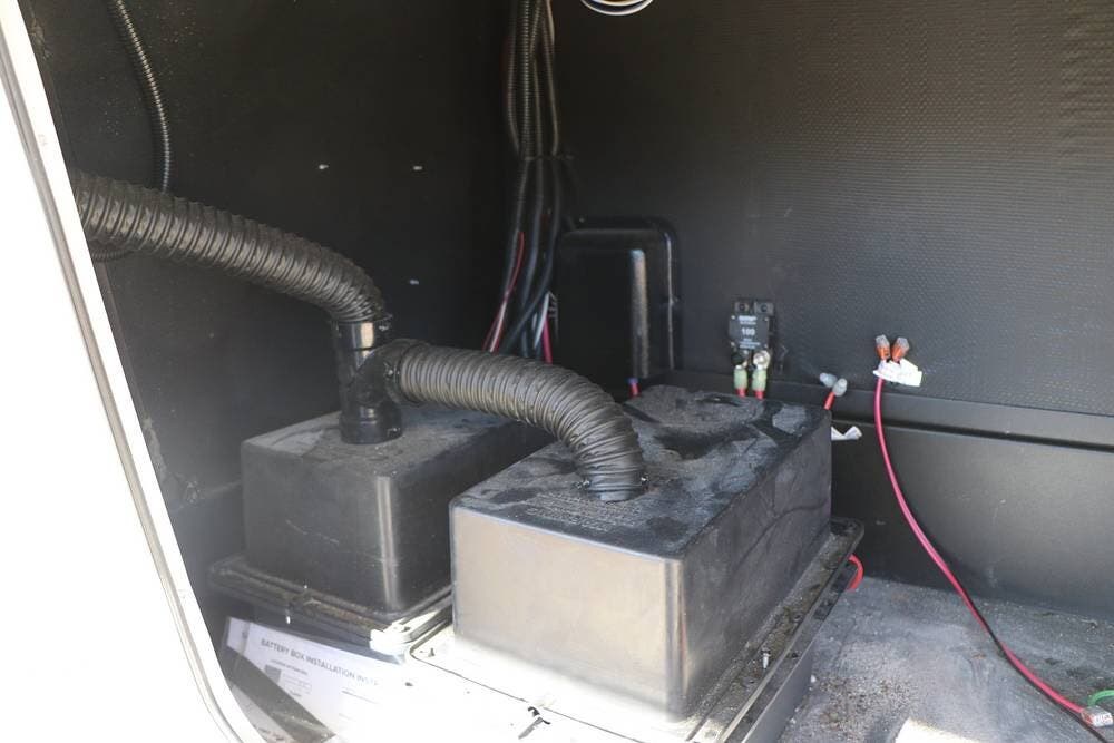 The full width storage space and front storage houses the two batteries for powering the RV with DC when not at the campsite. All of the RV systems are clearly marked, easily accessible around the RV - including a six-point auto leveling system, ten gallon hot water heater - so you never have to worry about running out of hot water, water and power connections and more.