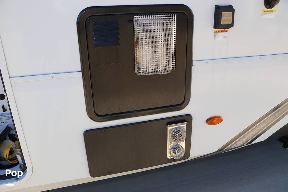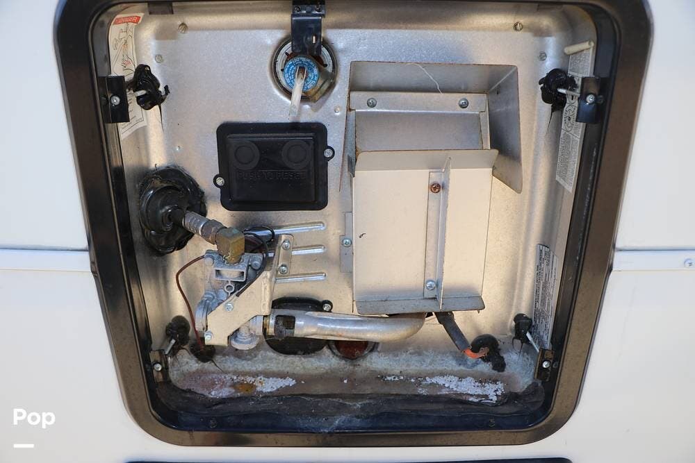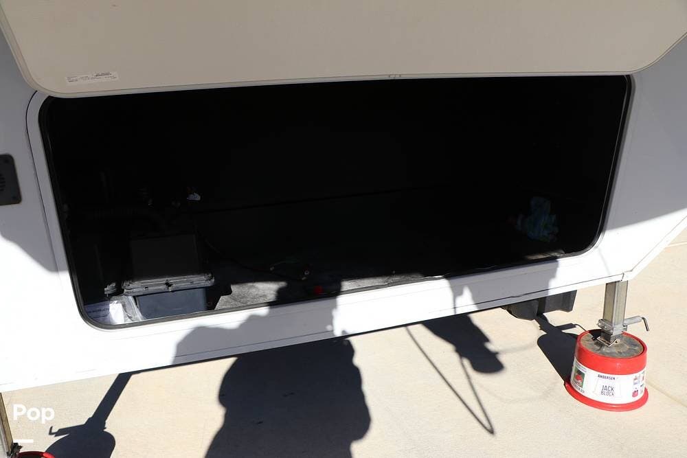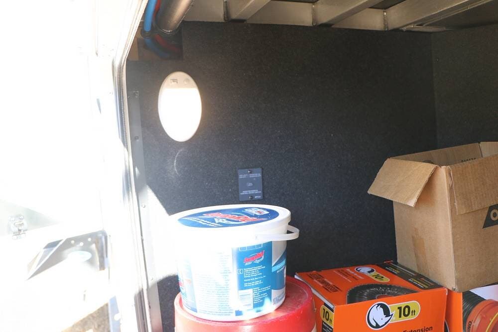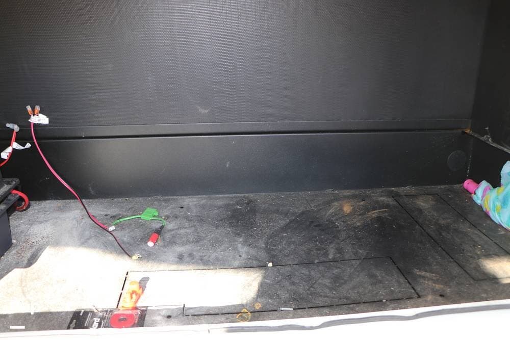 The full width storage space and front storage houses the two batteries for powering the RV with DC when not at the campsite. All of the RV systems are clearly marked, easily accessible around the RV - including a six-point auto leveling system, ten gallon hot water heater - so you never have to worry about running out of hot water, water and power connections and more.