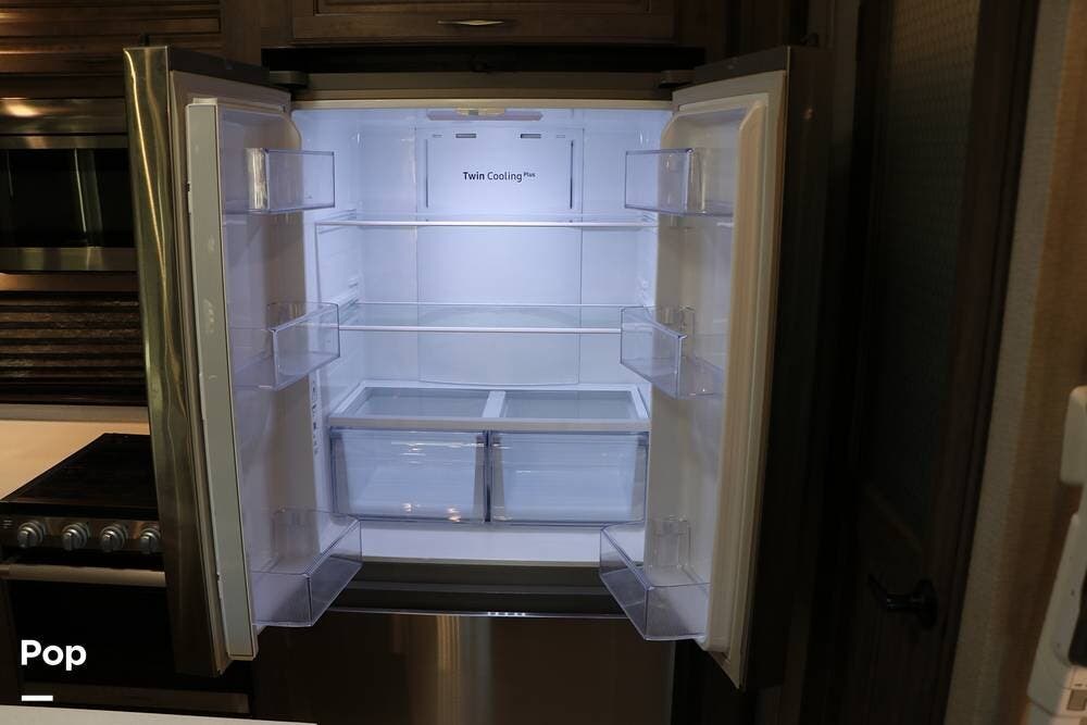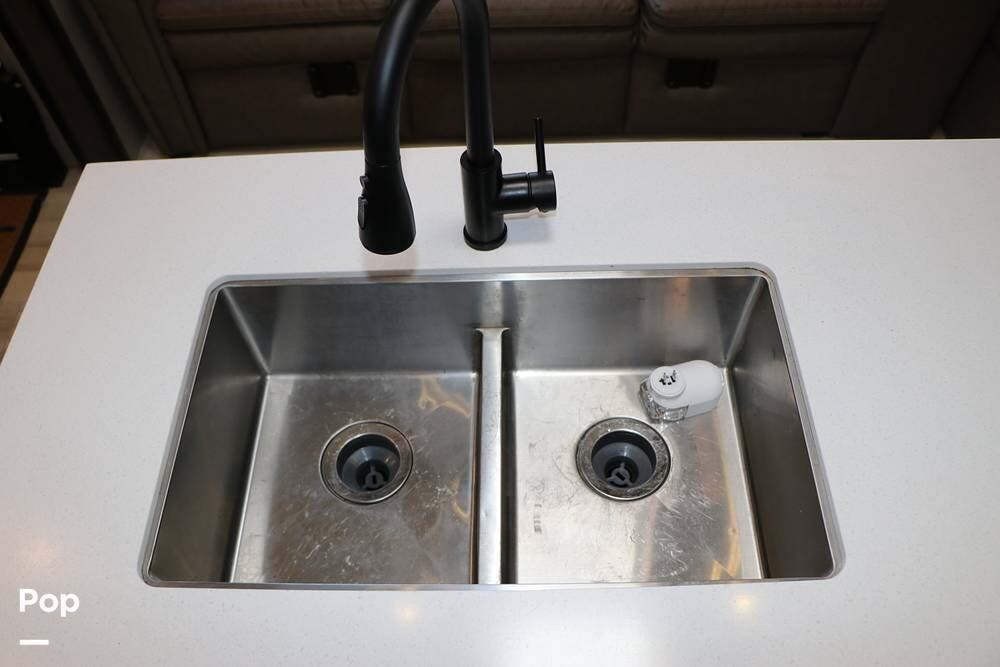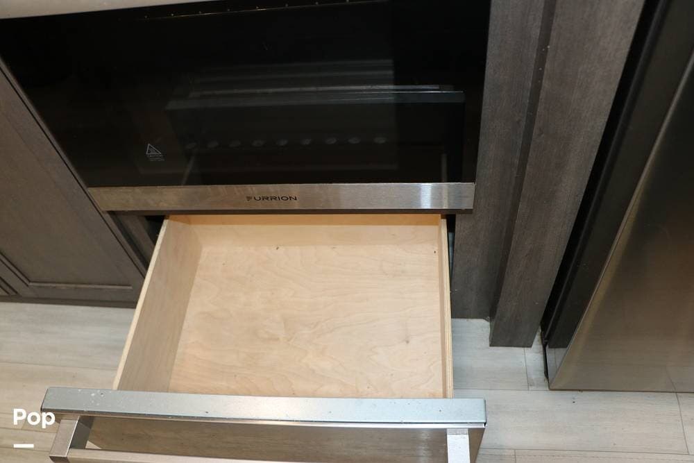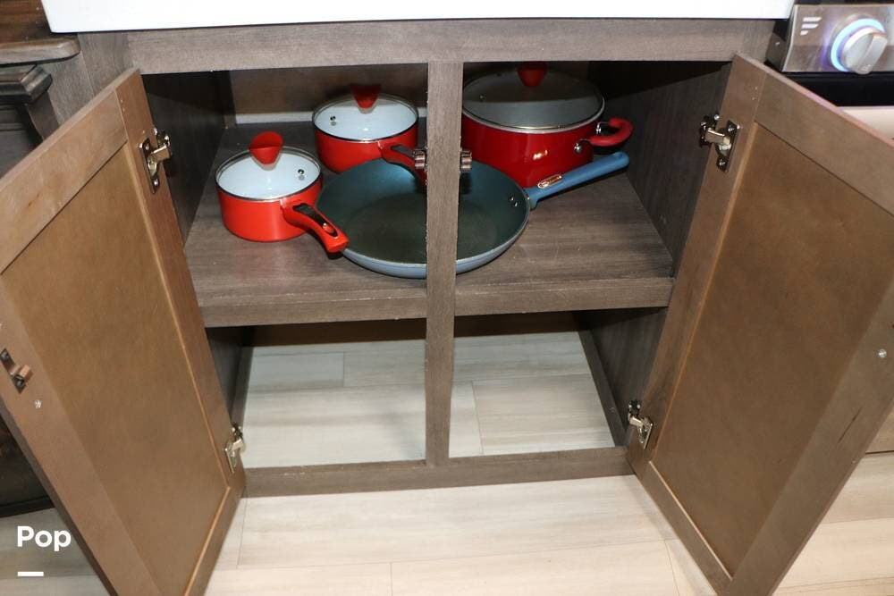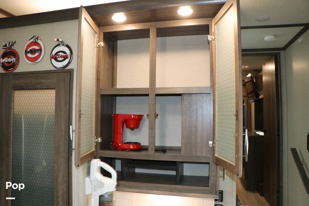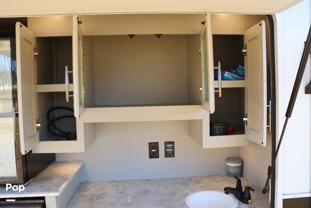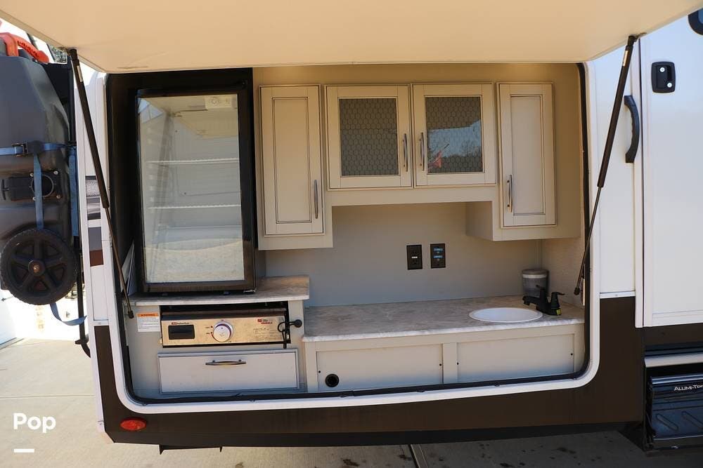 Outside the Exterior Kitchen with its own refrigerator, electric griddle, and sink with additional cabinet space and a door that also works as its own awning when opened. There are two power patio awnings for lots of outside space when at the campsite - making this a great RV for tailgating at your favorite teams events!