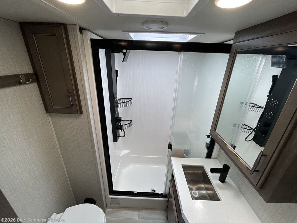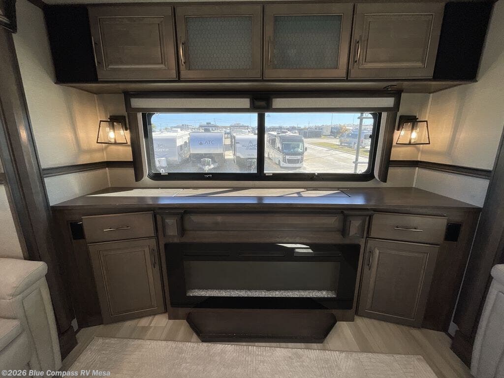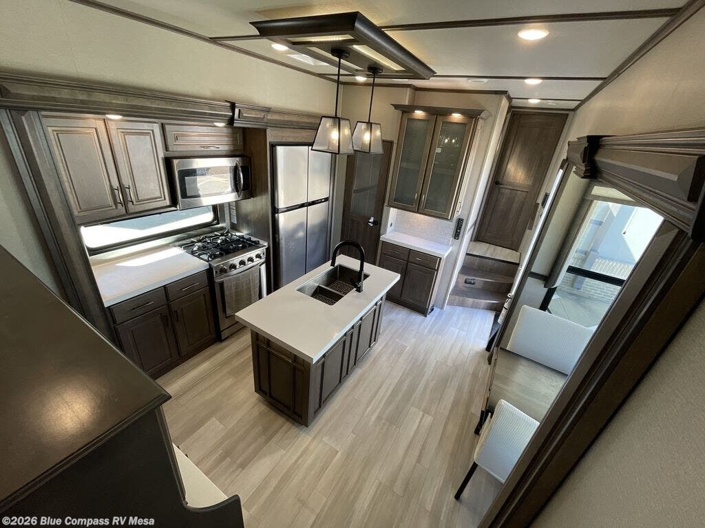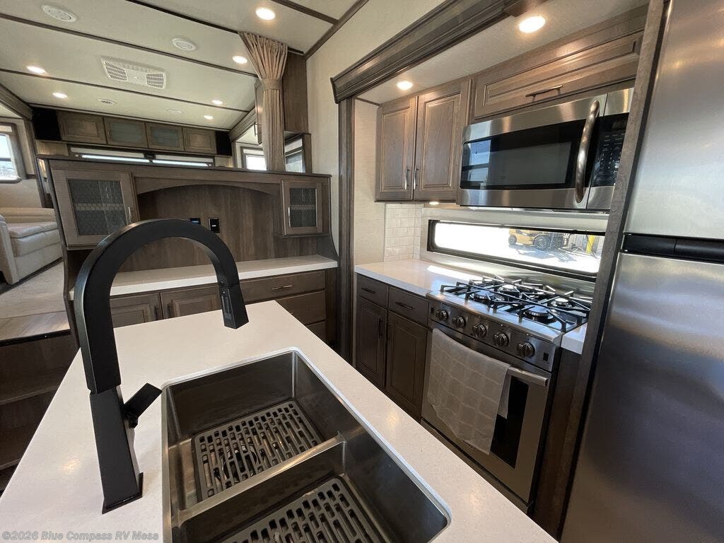 Your extended stays at any location will be enjoyable in this fifth wheel with the separate rooms, the five slide outs and the storage found inside as well as outside! The exterior rear storage with sliding tray is super handy to carry the larger camping items and totes plus there are several other compartments for items such as charcoal, outdoor games, hiking boots, fishing gear and more. The separate rear entertainment and living area provides an LED TV with fireplace below, several windows for great views, furniture to relax on as well as sleep on, plus USB charging outlets for your cellphones and such. The middle kitchen offers a buffet, a hutch, an oversized pantry, stainless steel appliances, and a free-standing dinette slide out with more views out of the windows. The full bathroom is up a few steps and before you reach the front bedroom. You will love the seated shower and linen storage. The bedroom provides a queen bed slide, a pull-out ottoman, a flip-up dresser with LED TV, and a mirrored wardrobe. There are a few more options to add if you wish such as a washer/dryer, an outside pull-out kitchen, and/or a Solitude solar system.