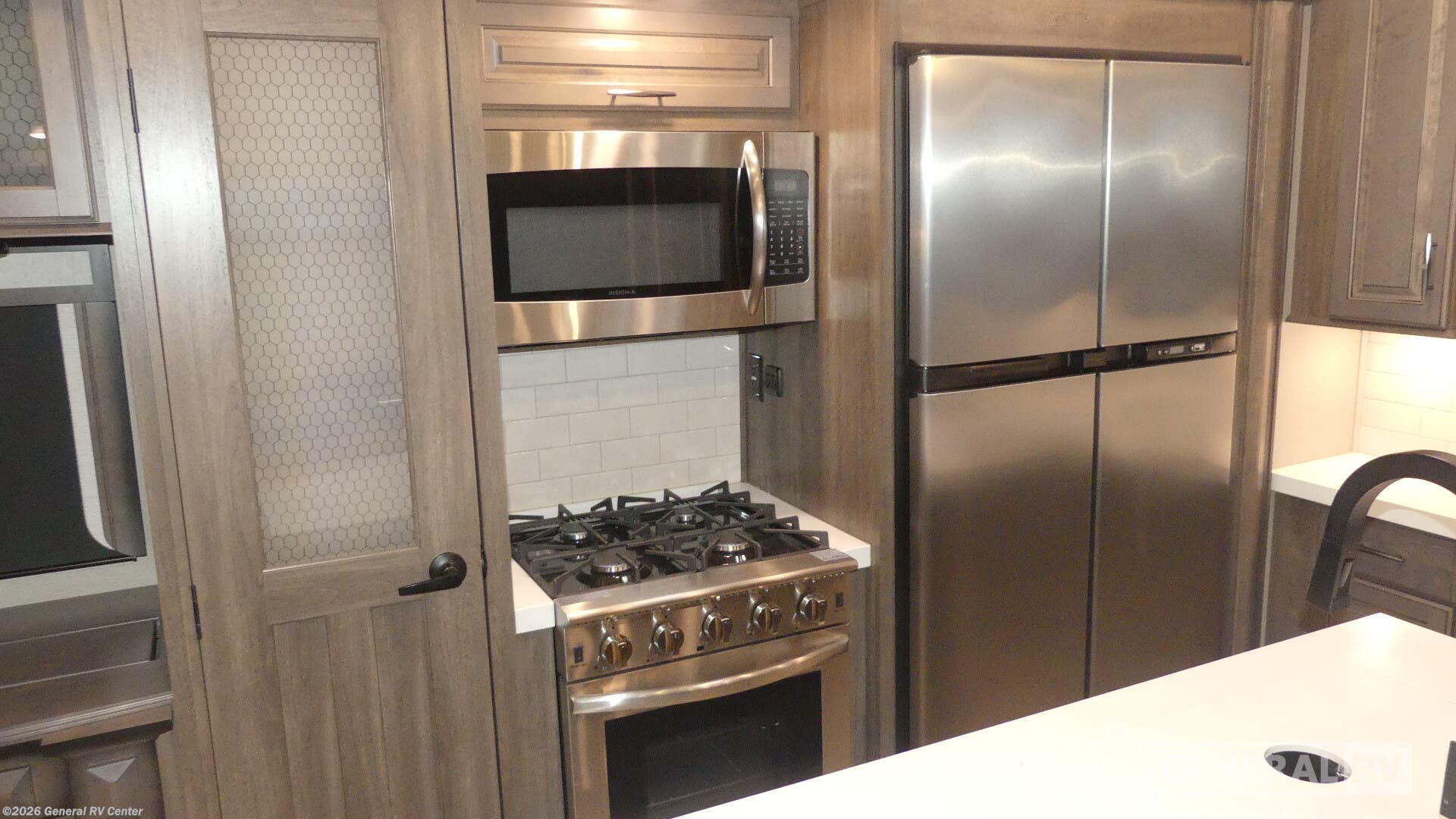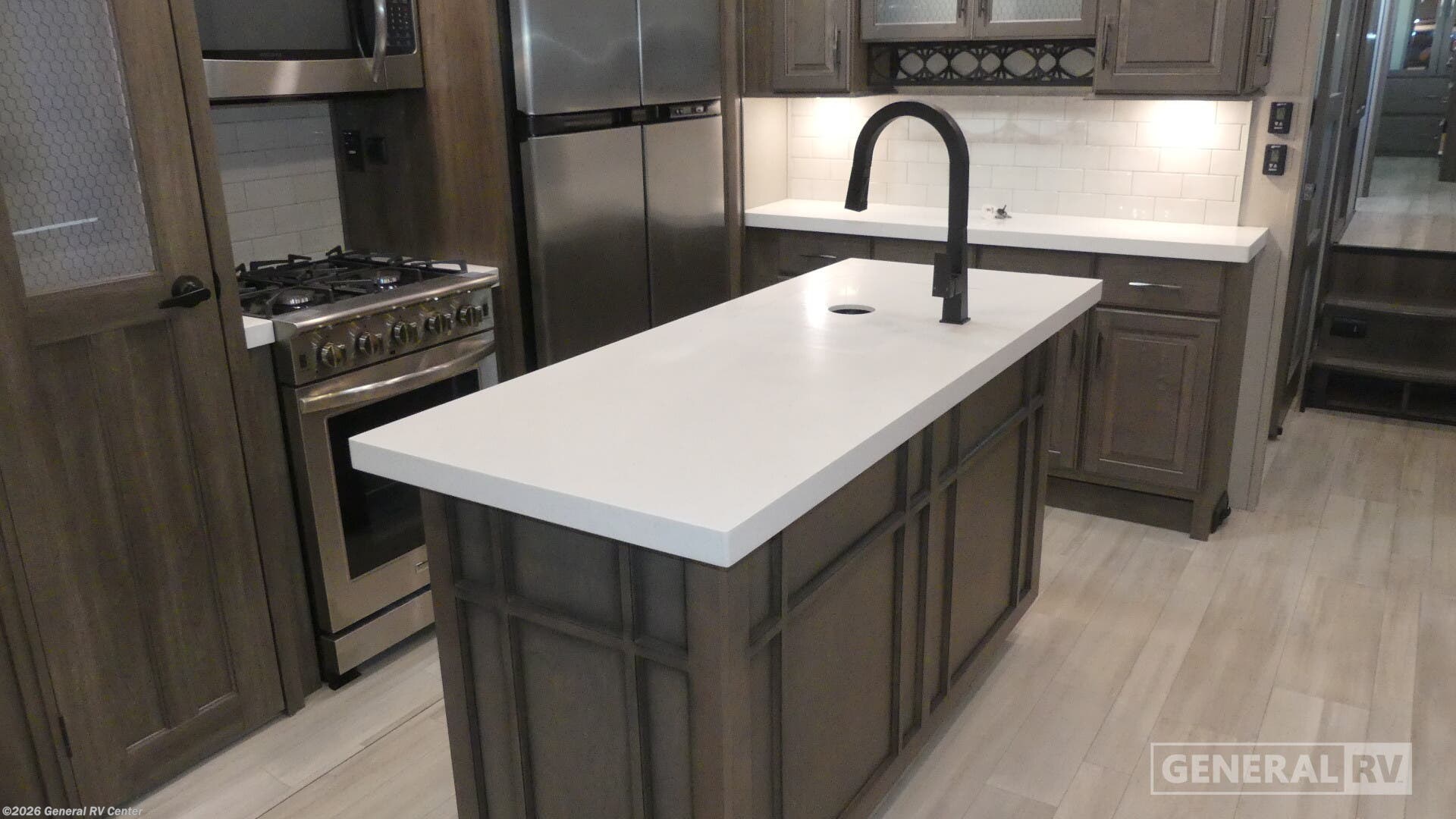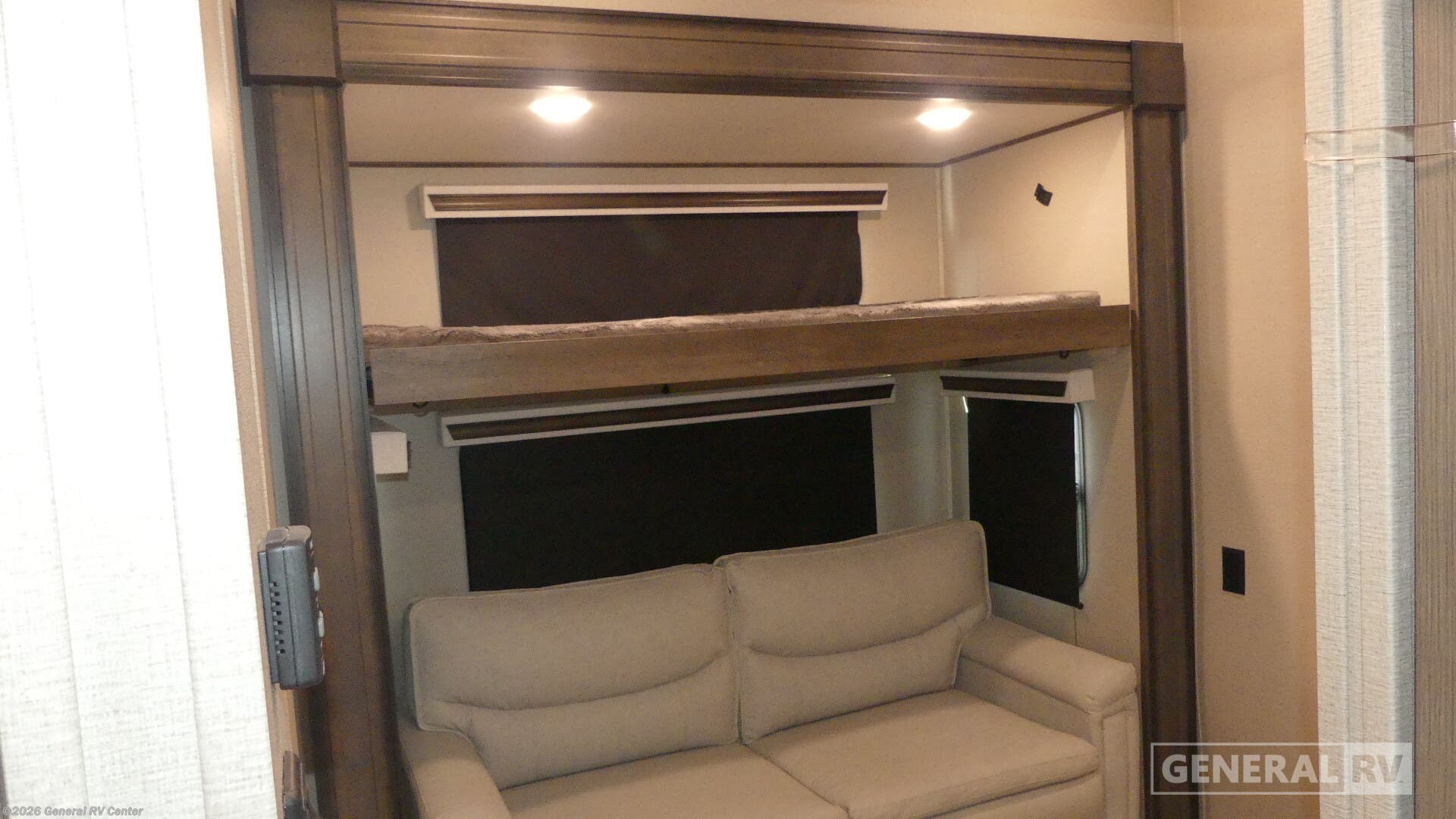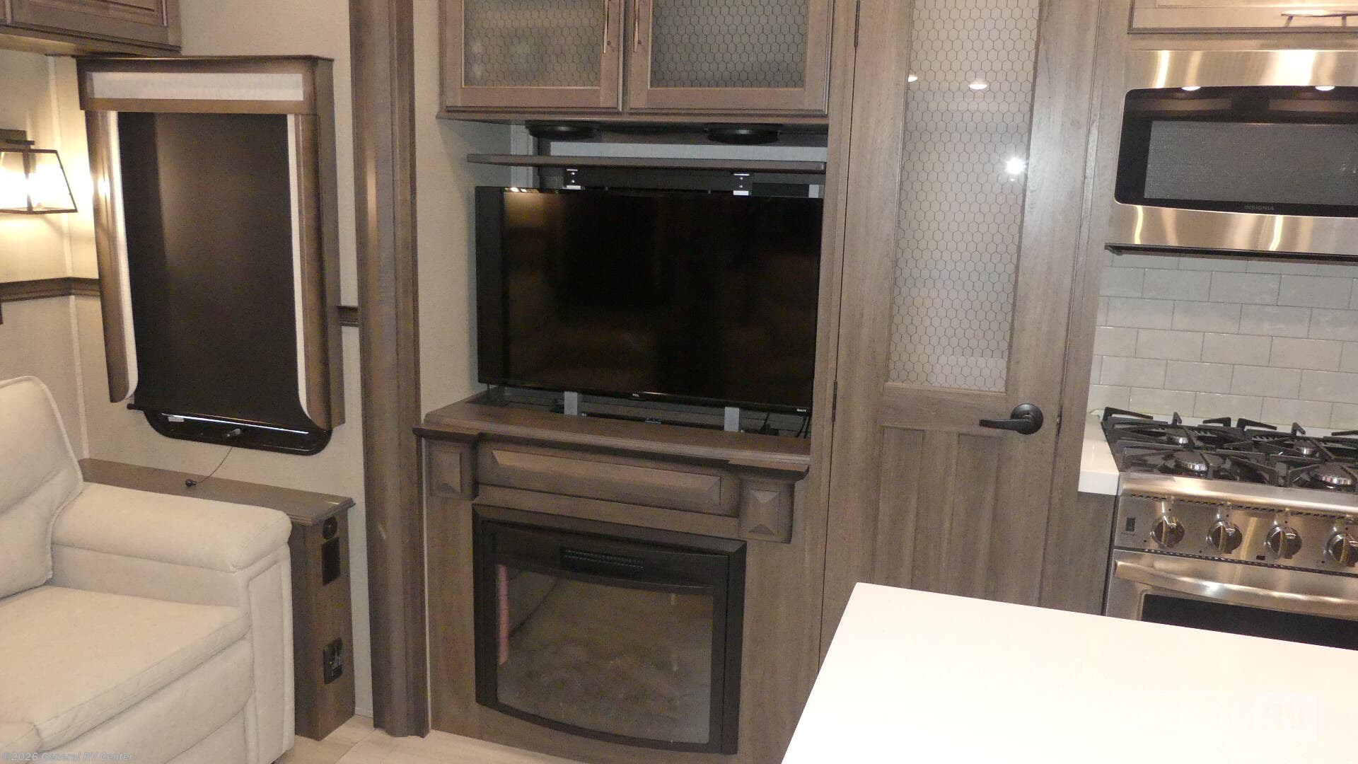 Experience the epitome of luxury and comfort with the 2022 Grand Design Solitude 378MBS. This stunning fifth wheel offers a spacious and thoughtfully designed interior that effortlessly combines style and functionality. With its ability to sleep up to seven guests, it features a cozy private bedroom, and convertible sleeping areas, ensuring everyone has a comfortable place to rest. The bunkhouse adds an extra layer of versatility, perfect for families or hosting friends. The center kitchen is a chef's delight, equipped with a full-size refrigerator and a four-burner cooktop, complemented by convection cooking. Imagine enjoying a delicious meal while basking in the warmth of the fireplace in the rear living area. The Solitude 378MBS doesn't just offer comfort; it also provides convenience with its ample storage options, including a pass-thru storage area. The dual awnings extend your living space outdoors, creating a perfect spot to relax with a beverage cooler and grill station at your disposal. Whether you're lounging in the theater seating or enjoying the freestanding dinette, every part of this RV is designed to enhance your travel experience. With its impressive water capacities and robust construction, this RV is ready for both short getaways and extended adventures. To explore this remarkable RV further, visit your nearest General RV dealership.