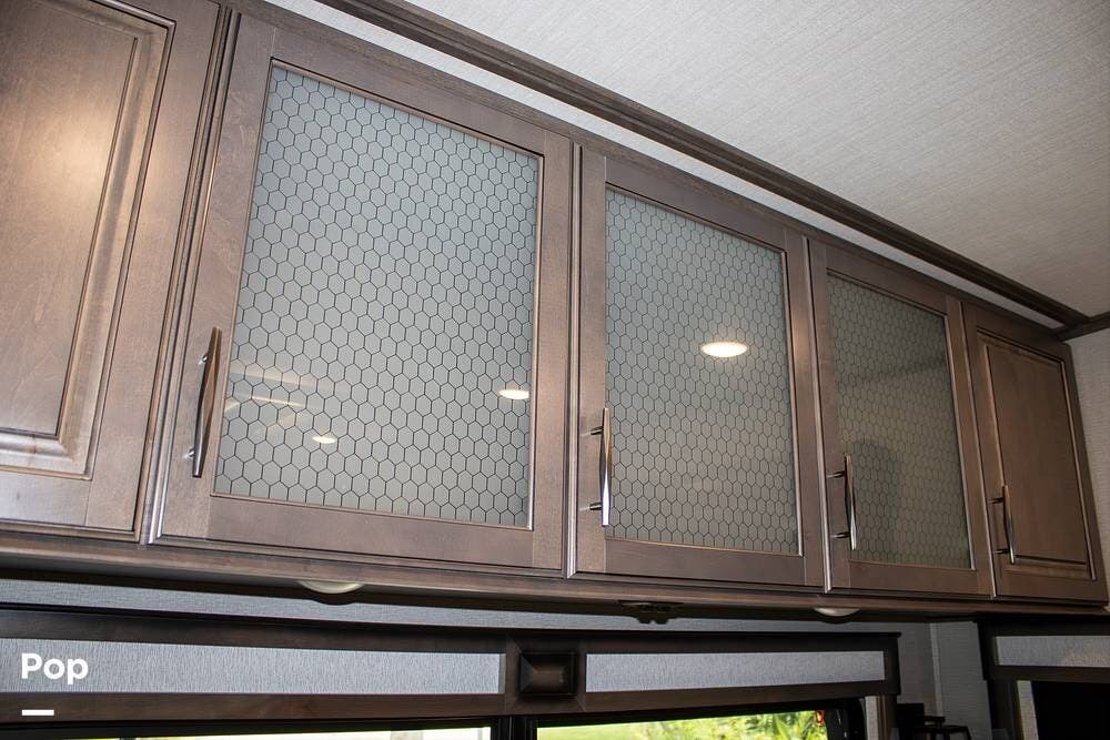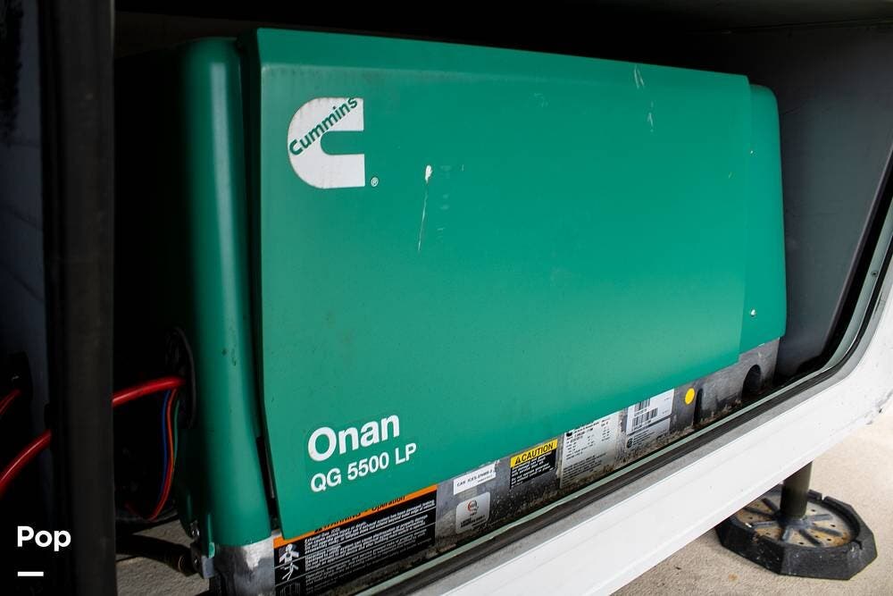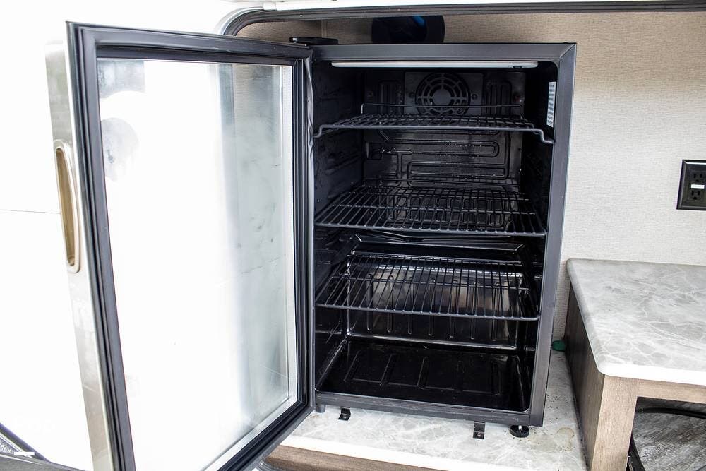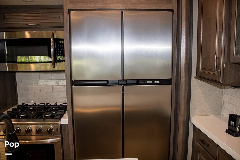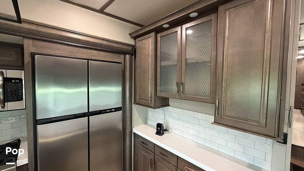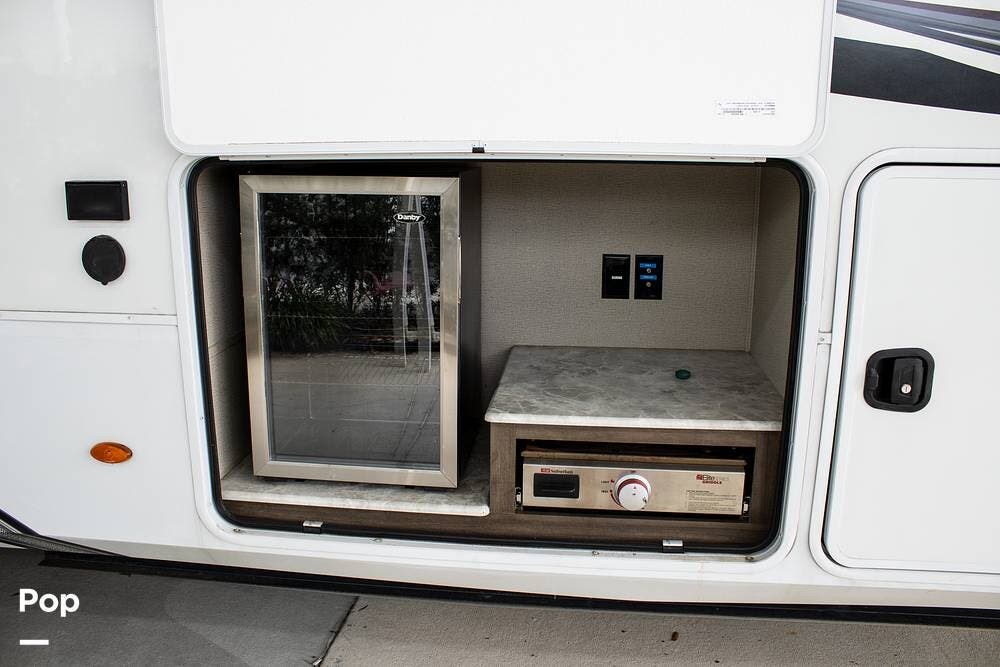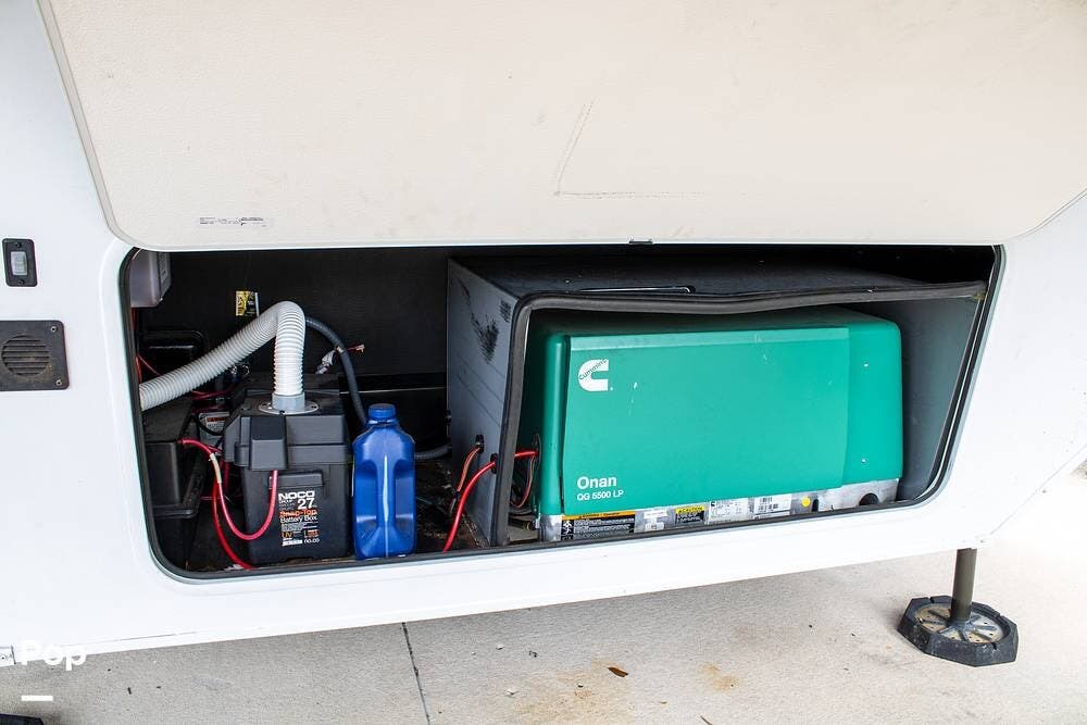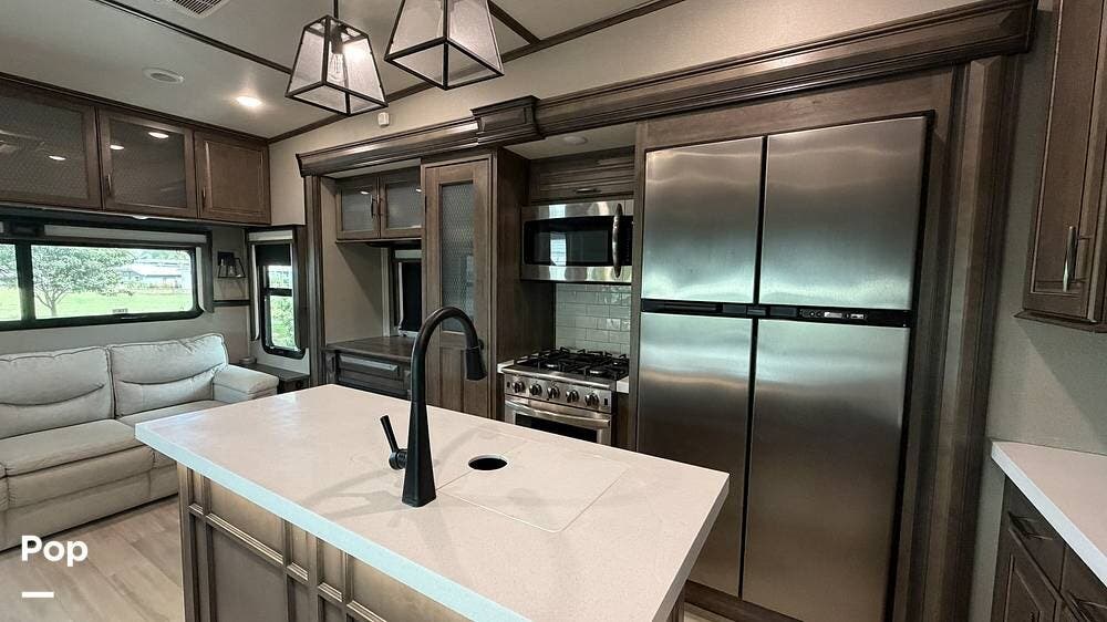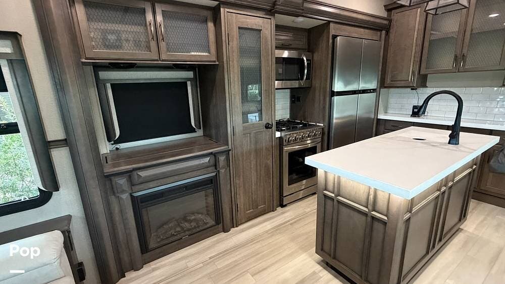 Additional features include an Onan 5500-watt generator, dual power awnings, and an outdoor kitchen with a mini fridge and a flat-top grill. The generator makes this fifth wheel fully boondocking-capable, ready for off-grid adventures.