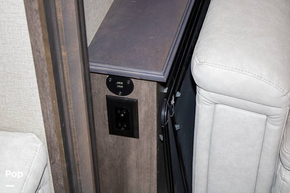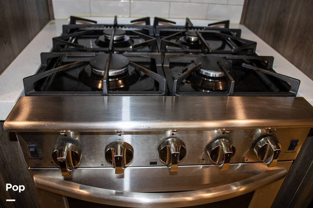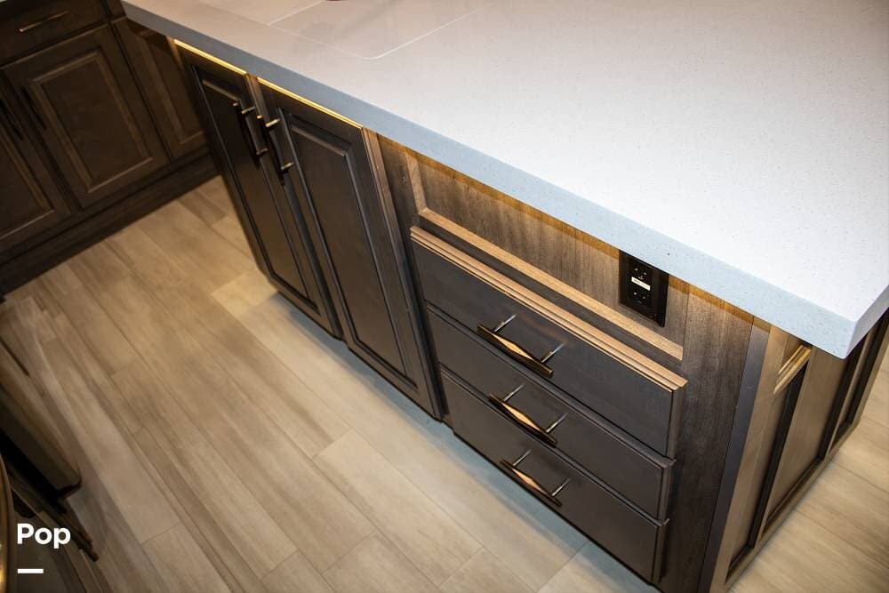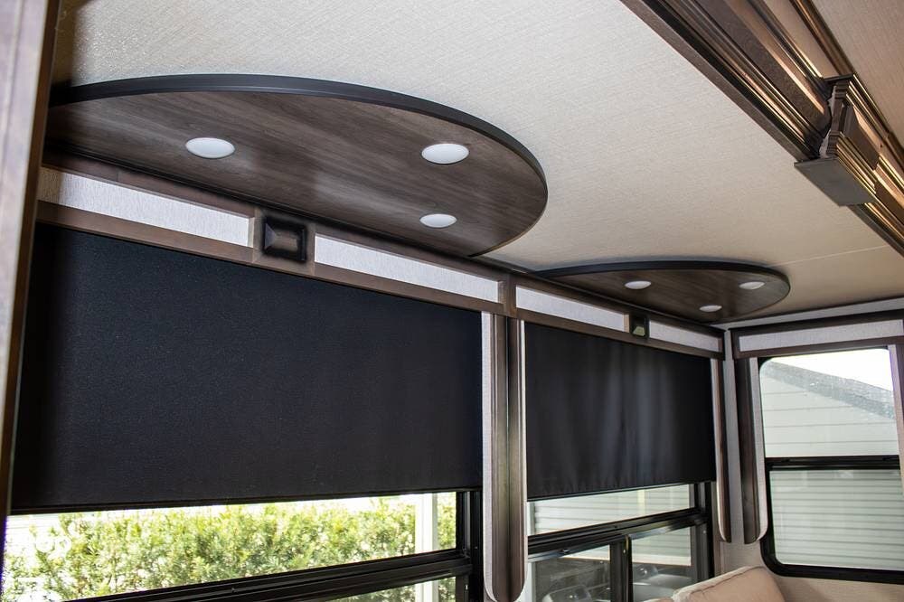 The rear living area is spacious, thanks to four slide-outs, and includes power recliners with heat and massage, a sofa sleeper, a large retractable TV, and an electric fireplace. All furniture is finished in marine-grade, durable coated fabric, built for comfort and long-term use without the maintenance of leather.