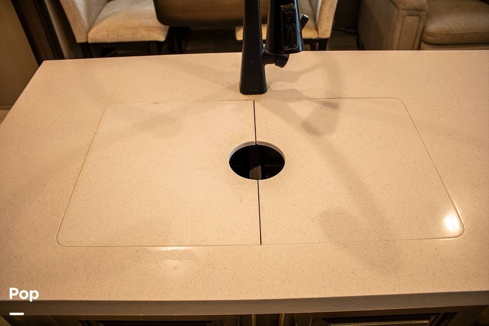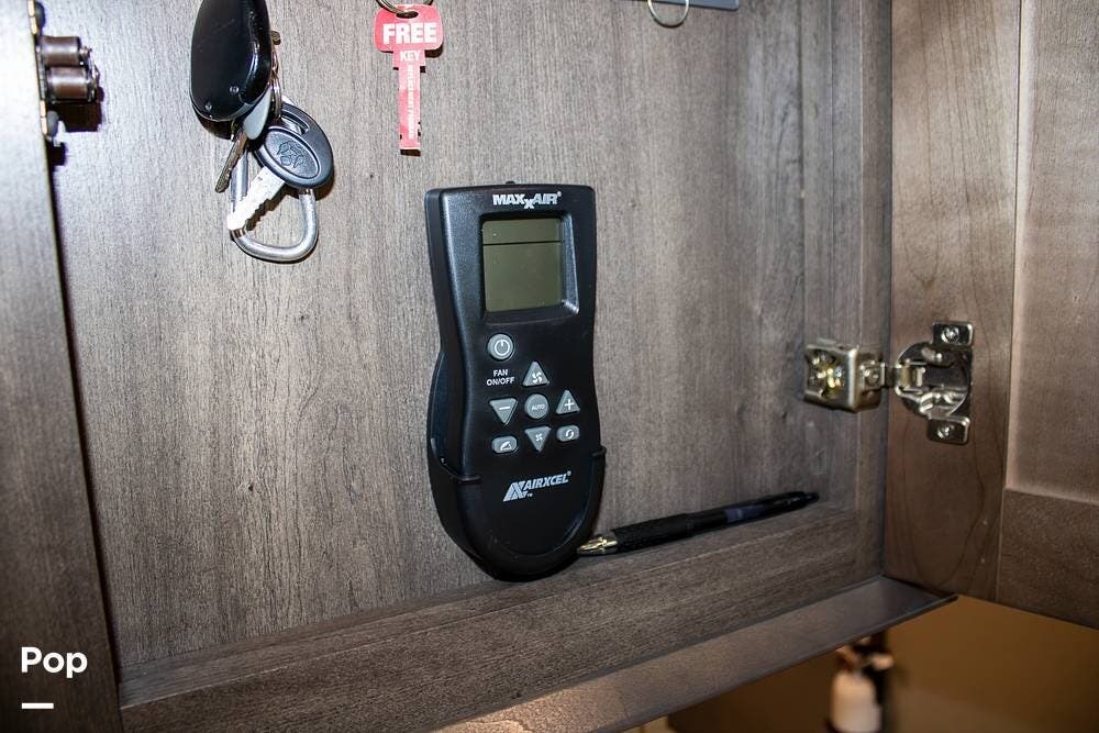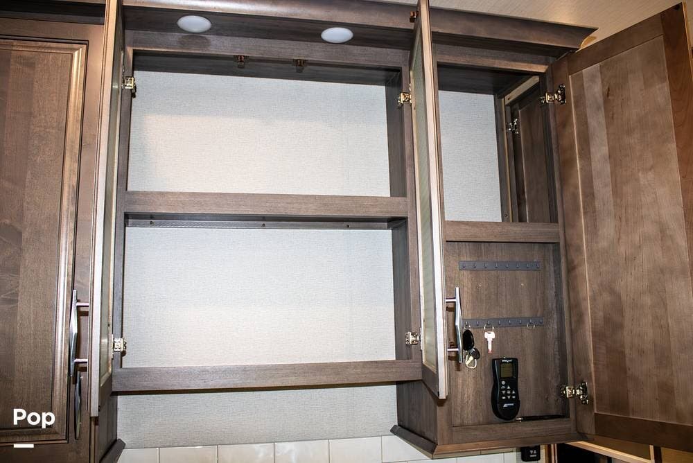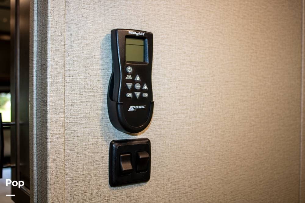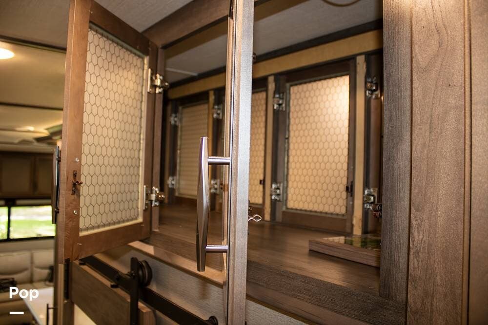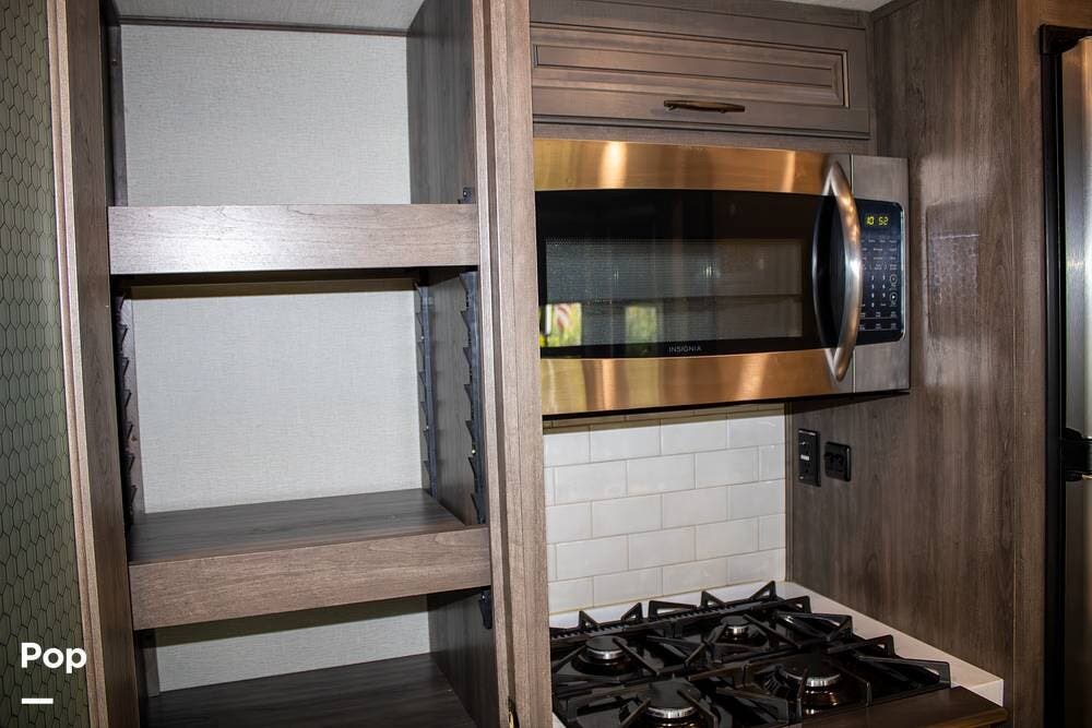 The kitchen is set up for extended stays with a full-size four-door gas/electric refrigerator, microwave, oven, island with double sink, and a pantry with slide-out shelving. Upgraded Maxxair Maxxfan Plus roof vents with remote controls are installed in the kitchen, flex room, and bathroom for improved airflow and ventilation.
