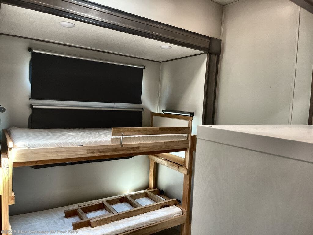 Looking for an extra room to utilize many ways in your next extended stay RV? Well you have found it in this middle bunkhouse with a fold down bunk above a tri-fold sofa that offers seating for an extra living room as well as sleeping space for a bedroom, plus there is a desk to work from and a closet for clothing and supplies making this room multi-functional. You can then retreat to your own master bedroom with a queen bed slide or choose the king option, a pull-out ottoman giving you a place to sit while taking off your shoes, an LED TV as well as a space prepped for a washer/dryer option. The main living and kitchen area is spacious with dual opposing slides and offers theatre seating and a tri-fold sofa to relax on while watching the LED Smart TV and visiting with the cook in the kitchen that offers a kitchen island, a 24" residential oven, and an oversized pantry to store lots of dry goods and snacks. You will surely enjoy the two power awnings and the outside grill plus beverage cooler while relaxing outdoors.