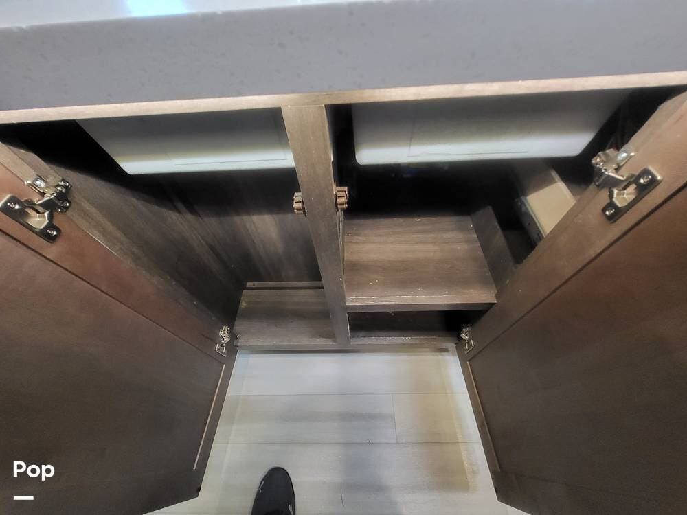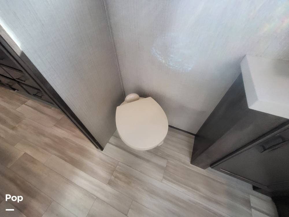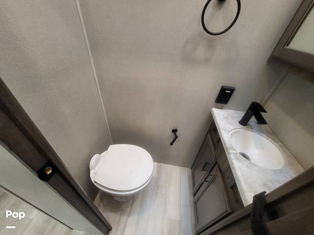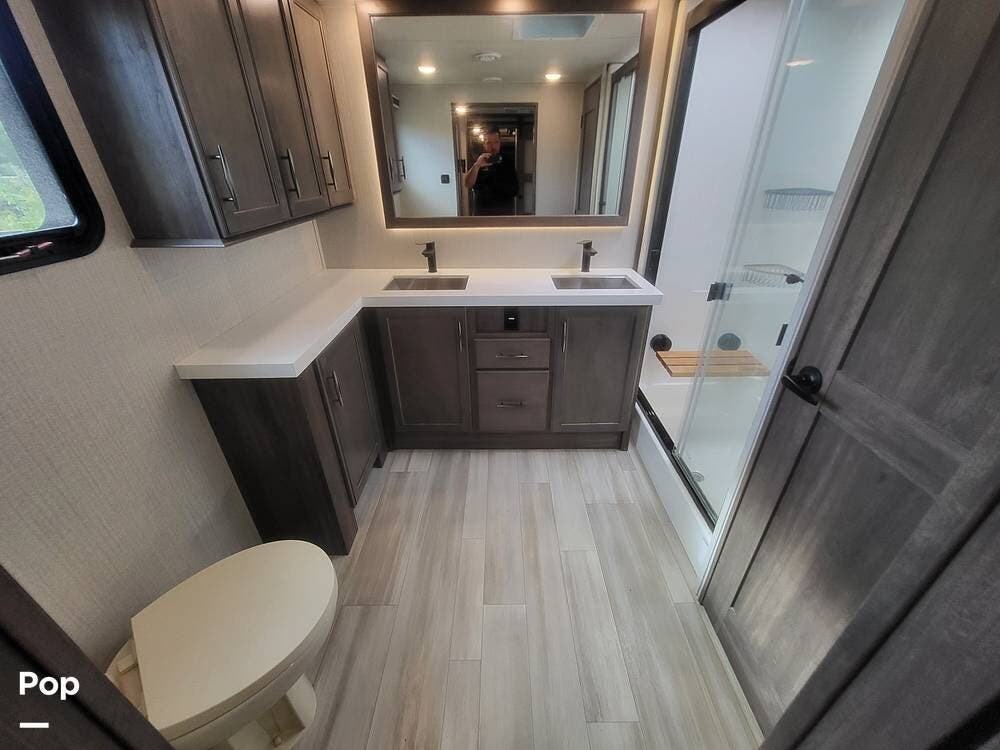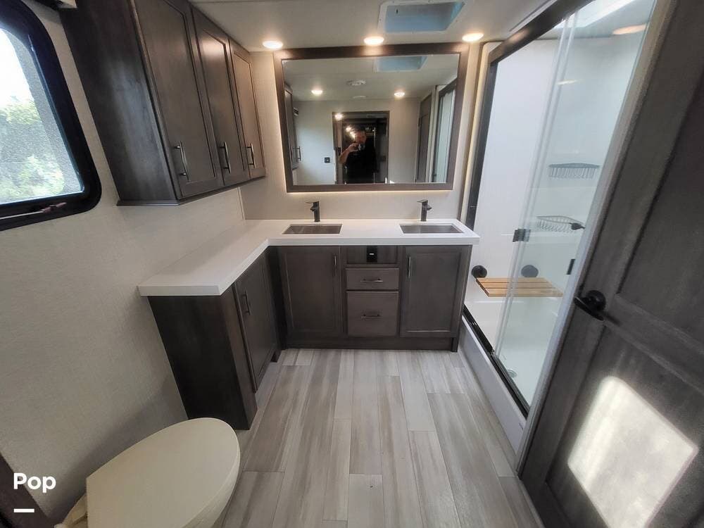 Toward the rear of the fifth wheel, you'll find the master suite, offering exceptional privacy and comfort. The spacious bedroom features a king-size bed with a premium mattress, overhead cabinets, and a large wardrobe with mirrored doors. The rear master bathroom is one of the largest in its class, featuring a double-sink vanity, an oversized residential-style shower with glass doors, a porcelain toilet, and additional storage for linens and personal items. There's also a washer and dryer prep.
