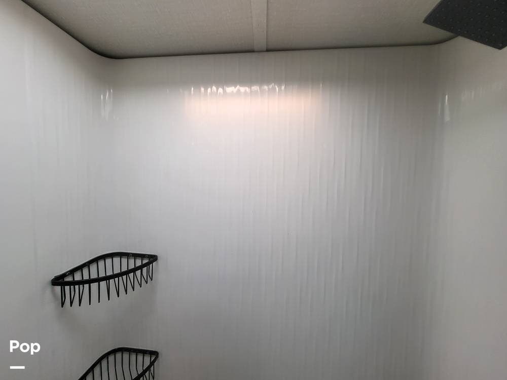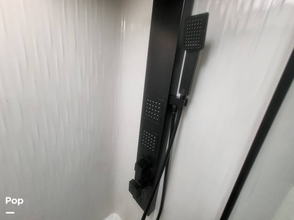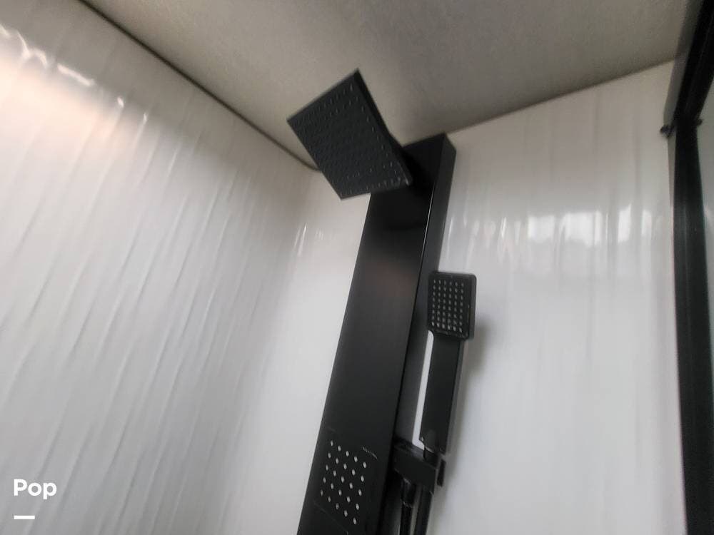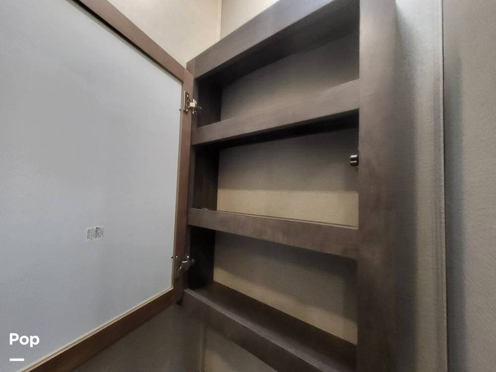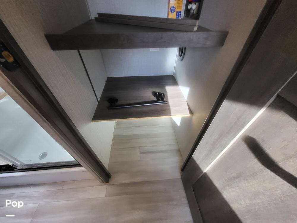 Toward the rear of the fifth wheel, you'll find the master suite, offering exceptional privacy and comfort. The spacious bedroom features a king-size bed with a premium mattress, overhead cabinets, and a large wardrobe with mirrored doors. The rear master bathroom is one of the largest in its class, featuring a double-sink vanity, an oversized residential-style shower with glass doors, a porcelain toilet, and additional storage for linens and personal items. There's also a washer and dryer prep.