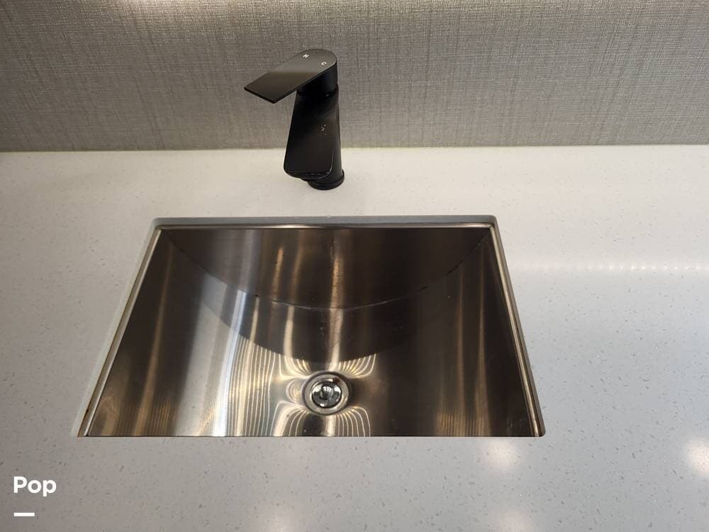 The midsection of the coach houses a half bath for guests and a beautifully designed kitchen that's both elegant and highly functional. Solid-surface countertops, a large island with a deep stainless-steel sink, and abundant cabinetry make cooking and cleanup effortless. The kitchen is equipped with a full-size residential refrigerator, a convection microwave, an oven, and a three-burner range. A free-standing dinette nearby offers a comfortable, scenic spot to enjoy your meals. The combination of practicality and aesthetic appeal in this kitchen makes it ideal for extended stays or full-time RV living.