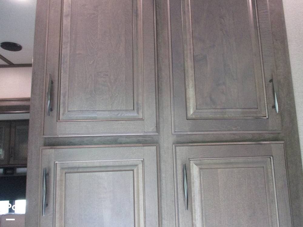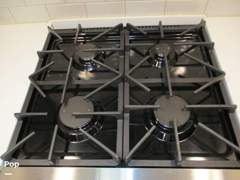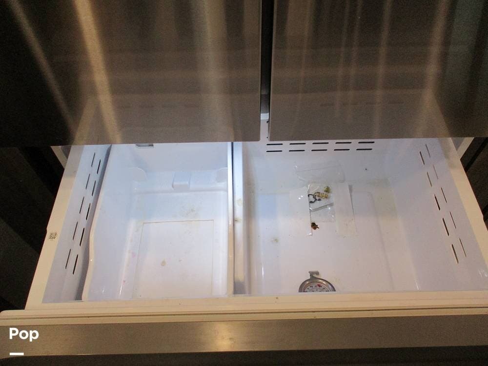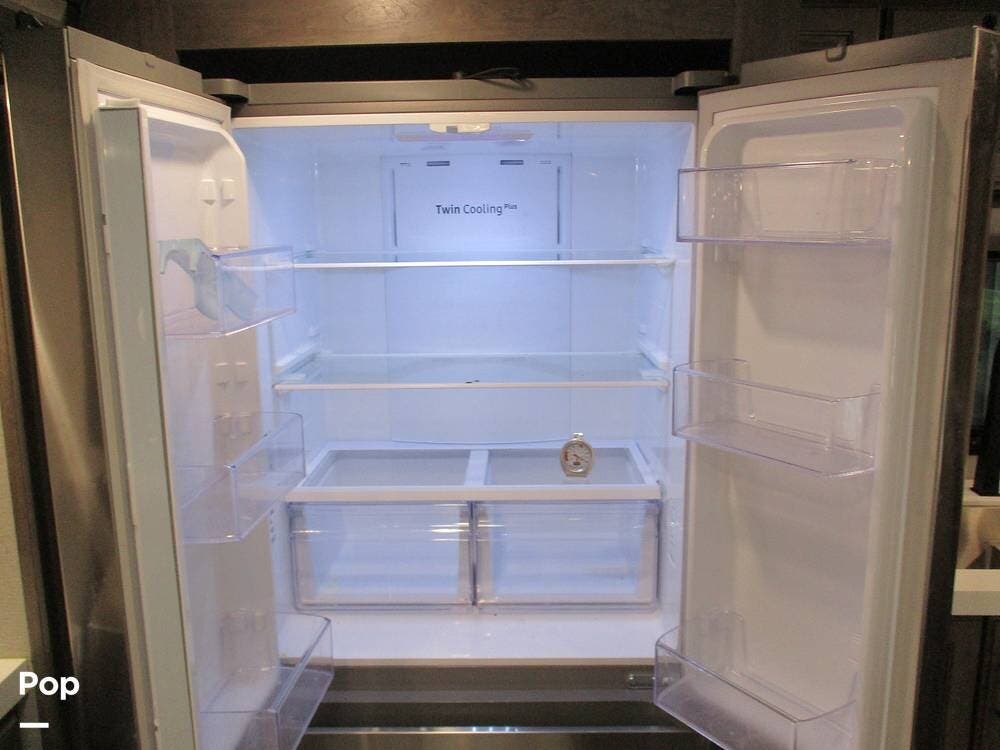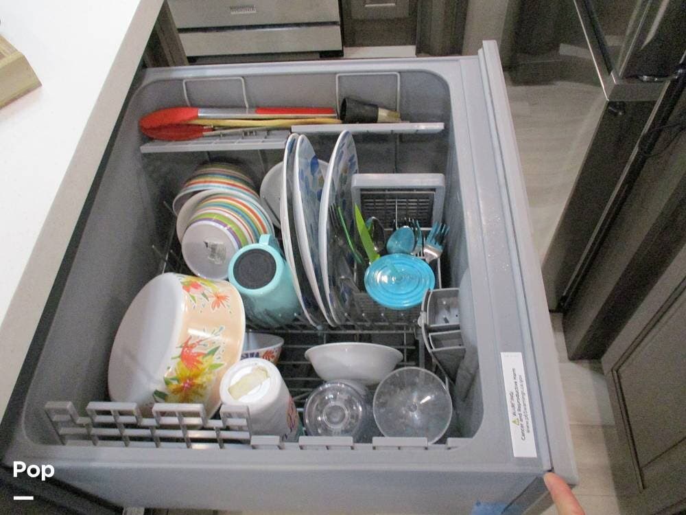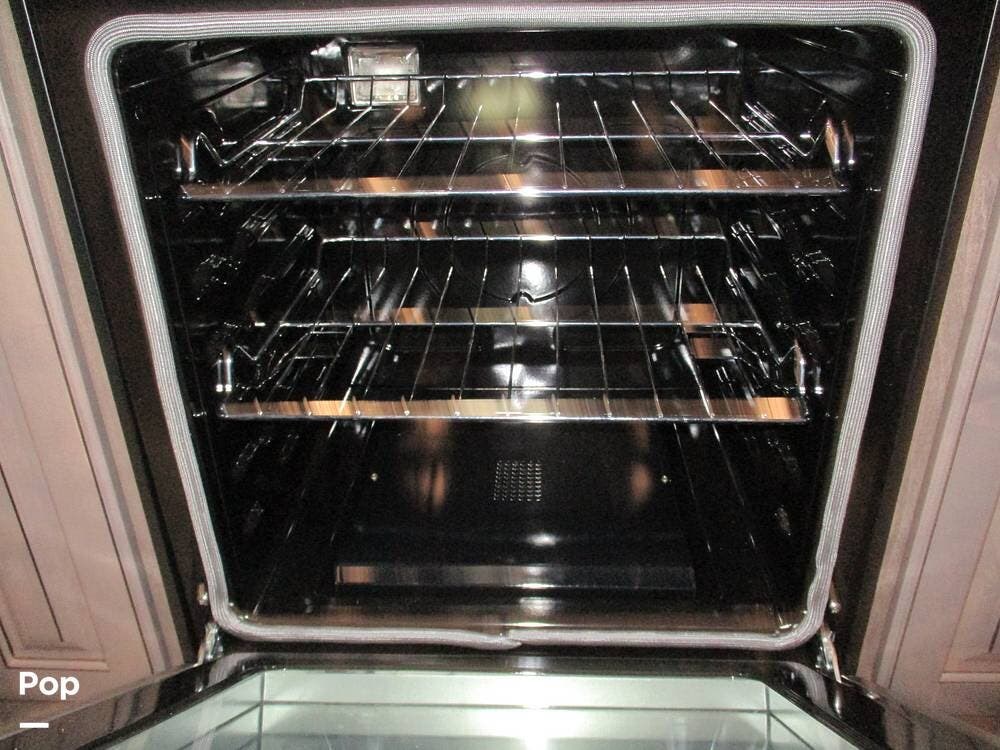 The kitchen boasts great counter space for meal prep or entertaining family and friends. It has a microwave, large sink, residential-style refrigerator/freezer with built in ice maker, and a 4-burner stove and oven. Numerous cabinets and drawer storage are also available, as is a large pantry with slide-out drawers. Cleanup is a breeze with the built-in dishwasher in the center island. There is also a central vacuum system on board.