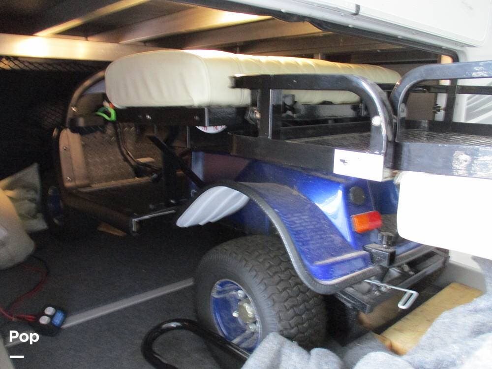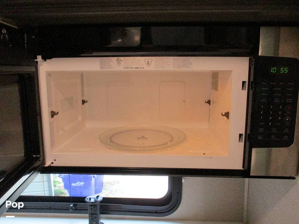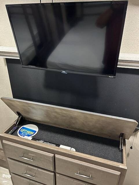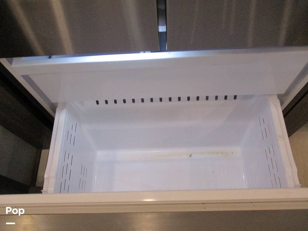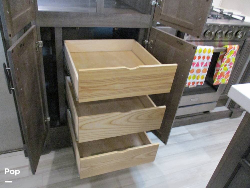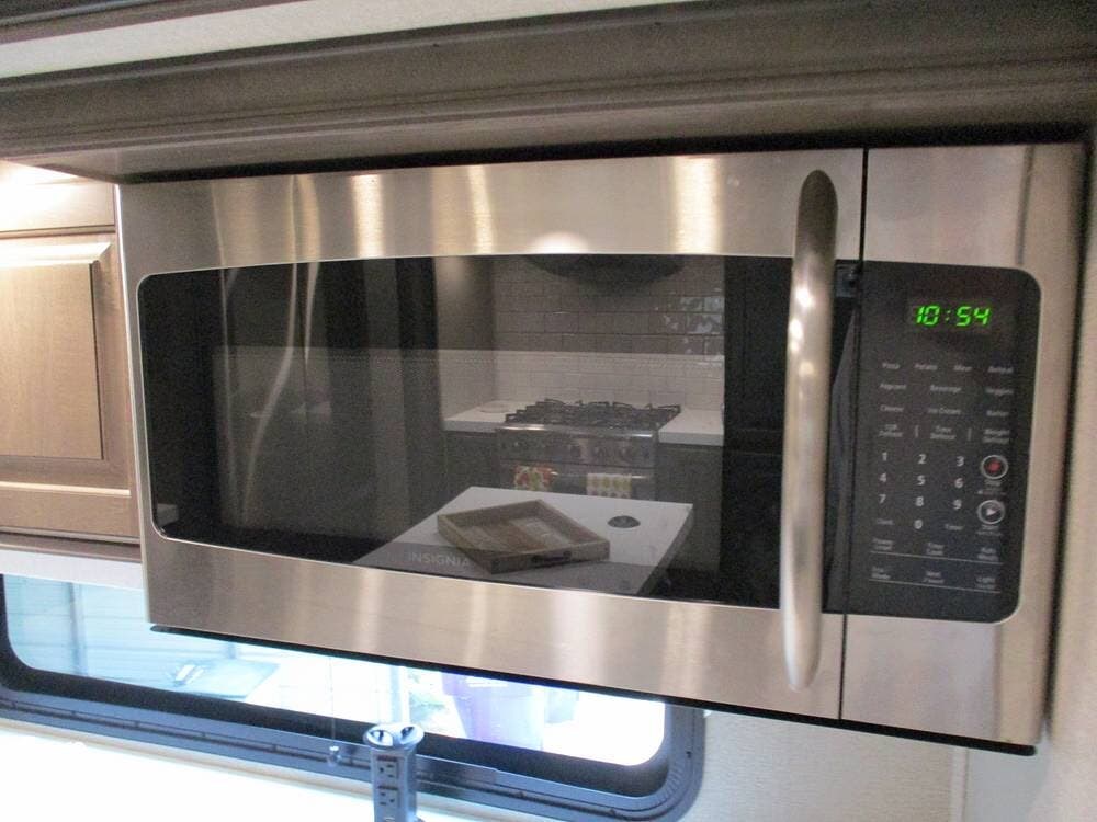 The kitchen boasts great counter space for meal prep or entertaining family and friends. It has a microwave, large sink, residential-style refrigerator/freezer with built in ice maker, and a 4-burner stove and oven. Numerous cabinets and drawer storage are also available, as is a large pantry with slide-out drawers. Cleanup is a breeze with the built-in dishwasher in the center island. There is also a central vacuum system on board.
