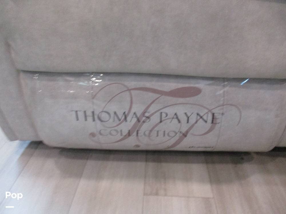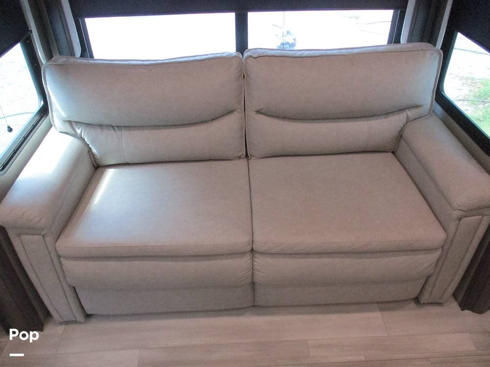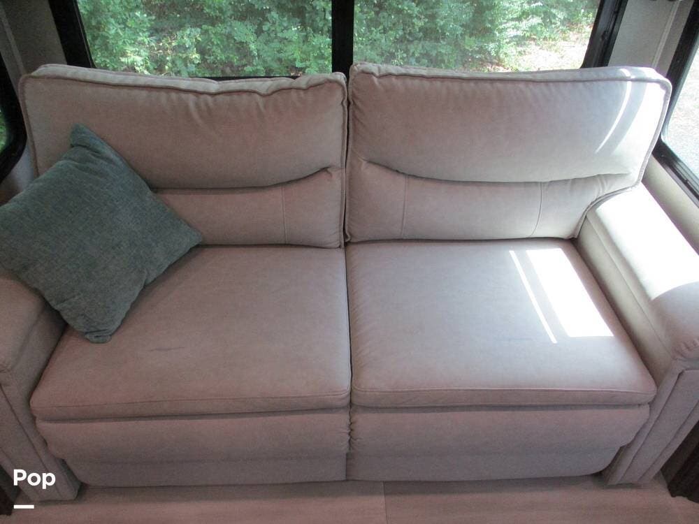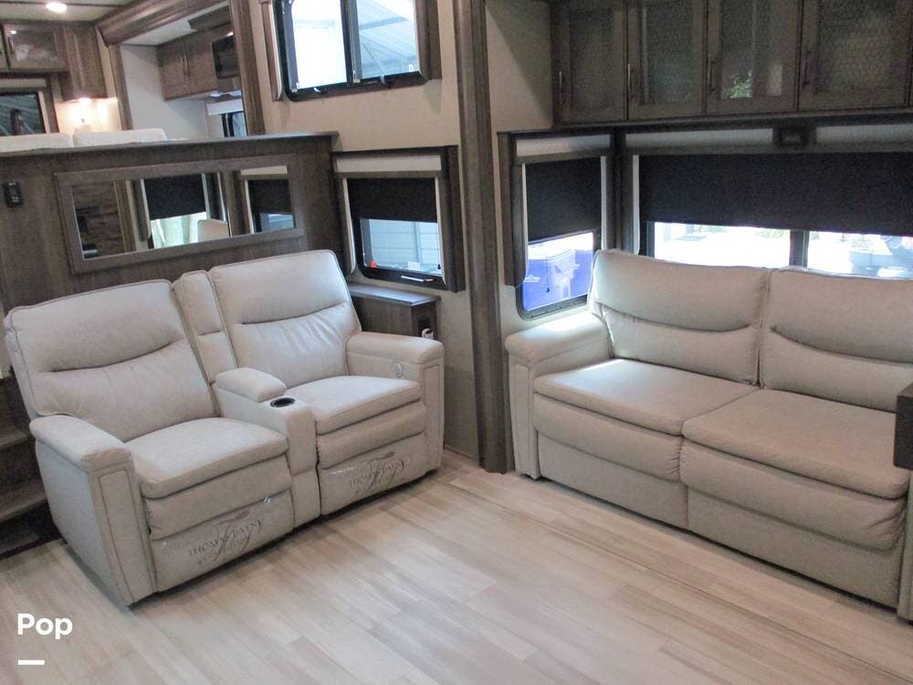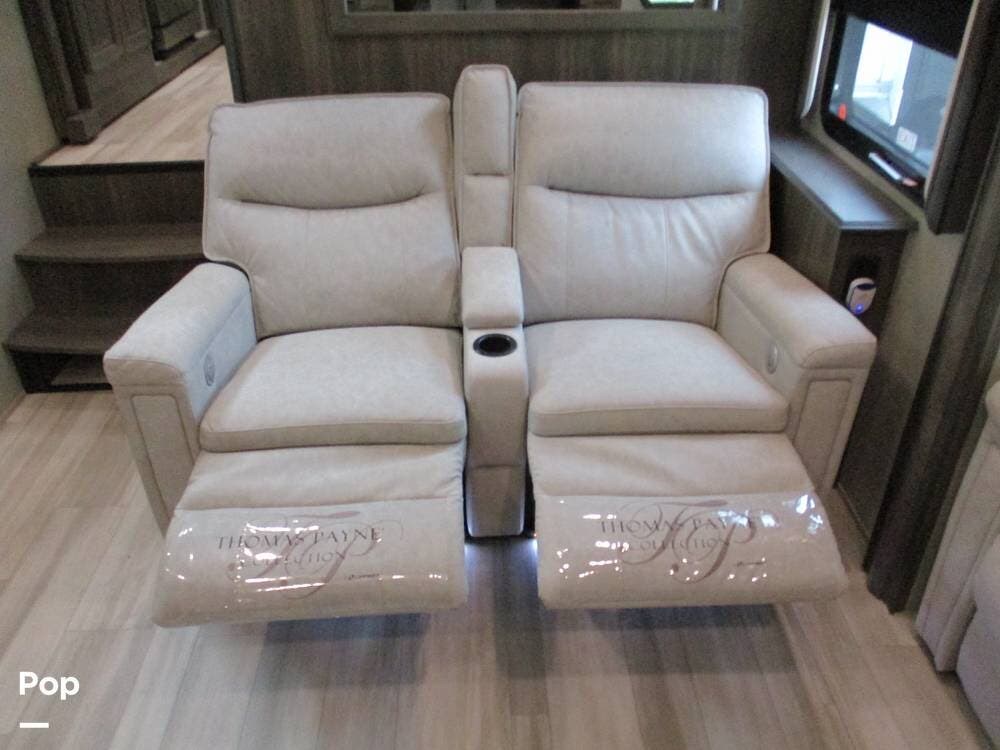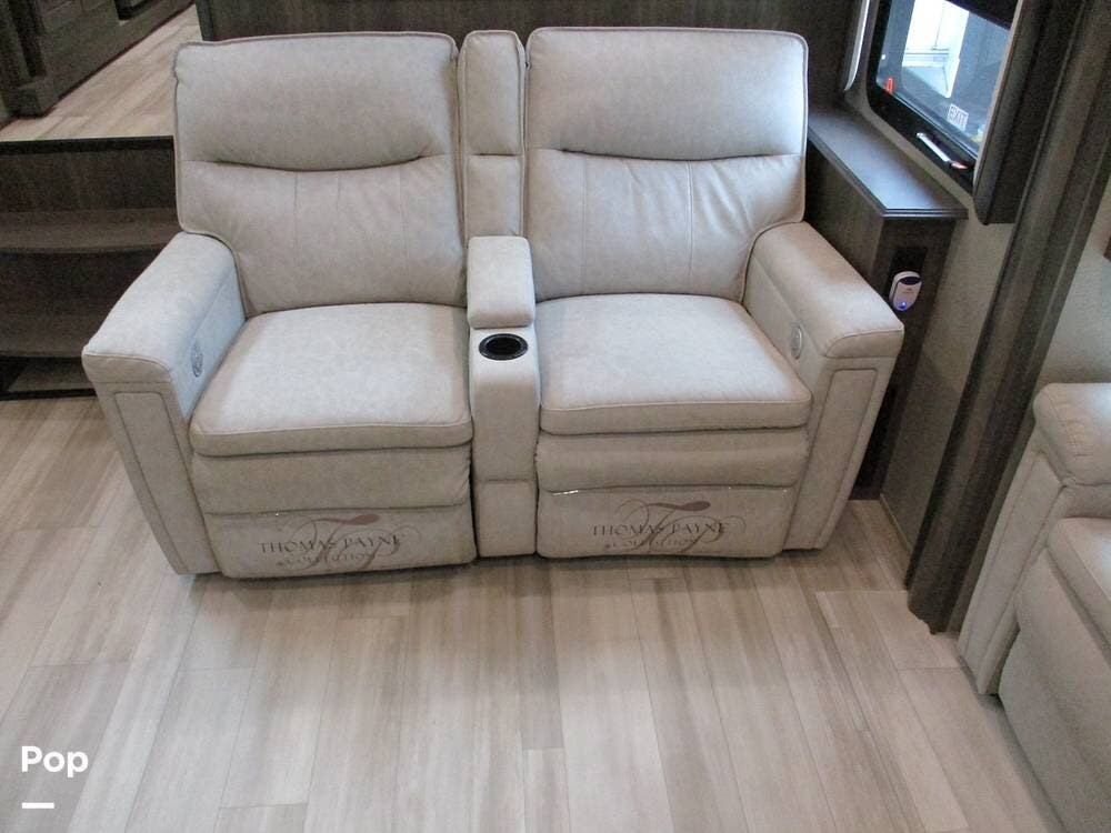 Enjoy a meal at the table, which overlooks the living room area. There are two sofas/sleepers and two theater-style power recliners. Enjoy the large flat-screen TV, stereo, or fireplace. A Winegard 360 has also been installed.