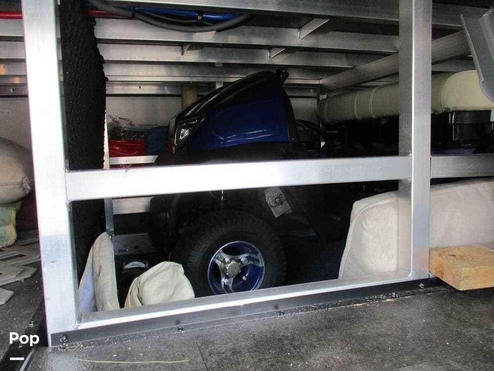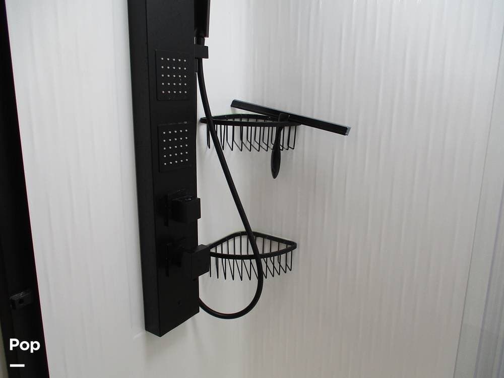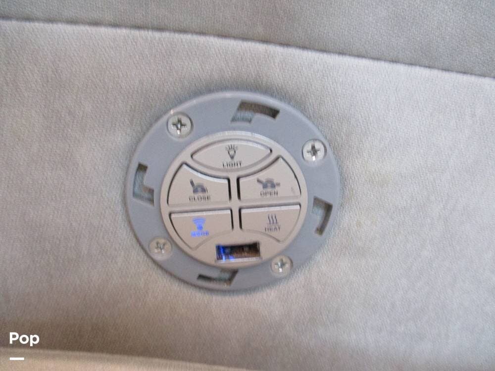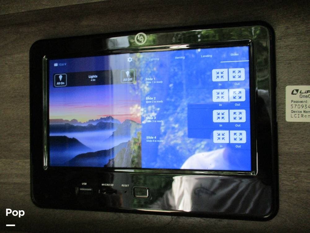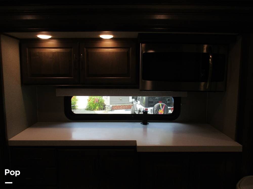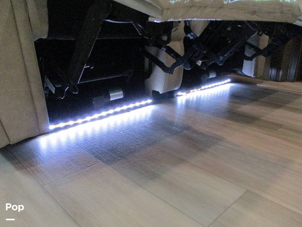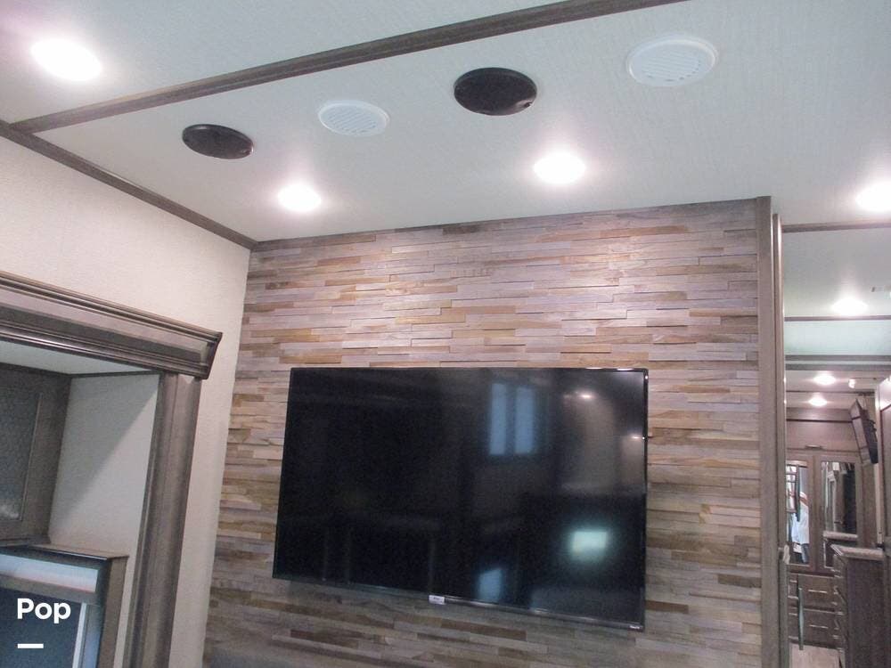 Enjoy a meal at the table, which overlooks the living room area. There are two sofas/sleepers and two theater-style power recliners. Enjoy the large flat-screen TV, stereo, or fireplace. A Winegard 360 has also been installed.