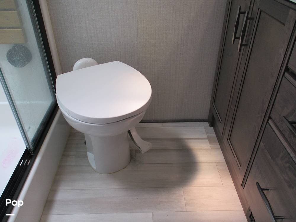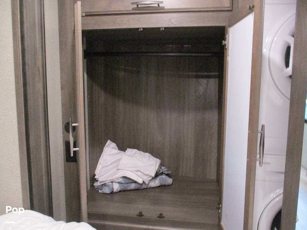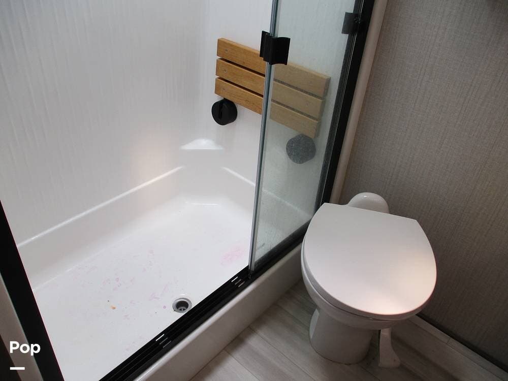 Moving forward in the RV, the large bathroom is equipped with 2 sinks, a large vanity, a toilet, and a large shower with a fold-down seat. A nice-sized linen closet is also in the bathroom.