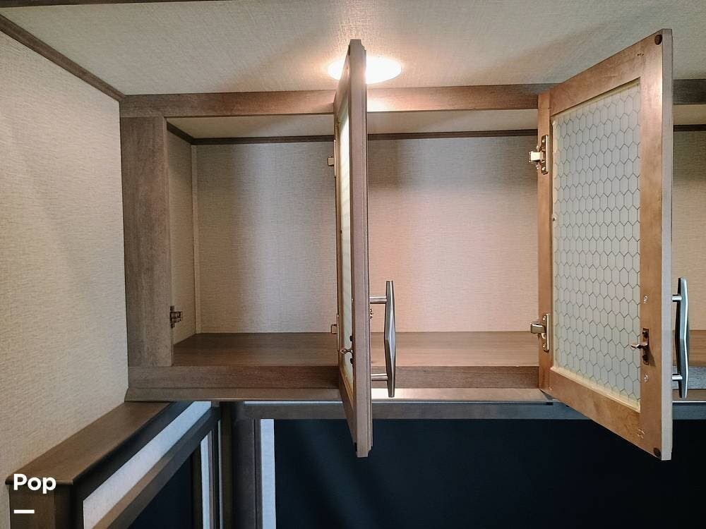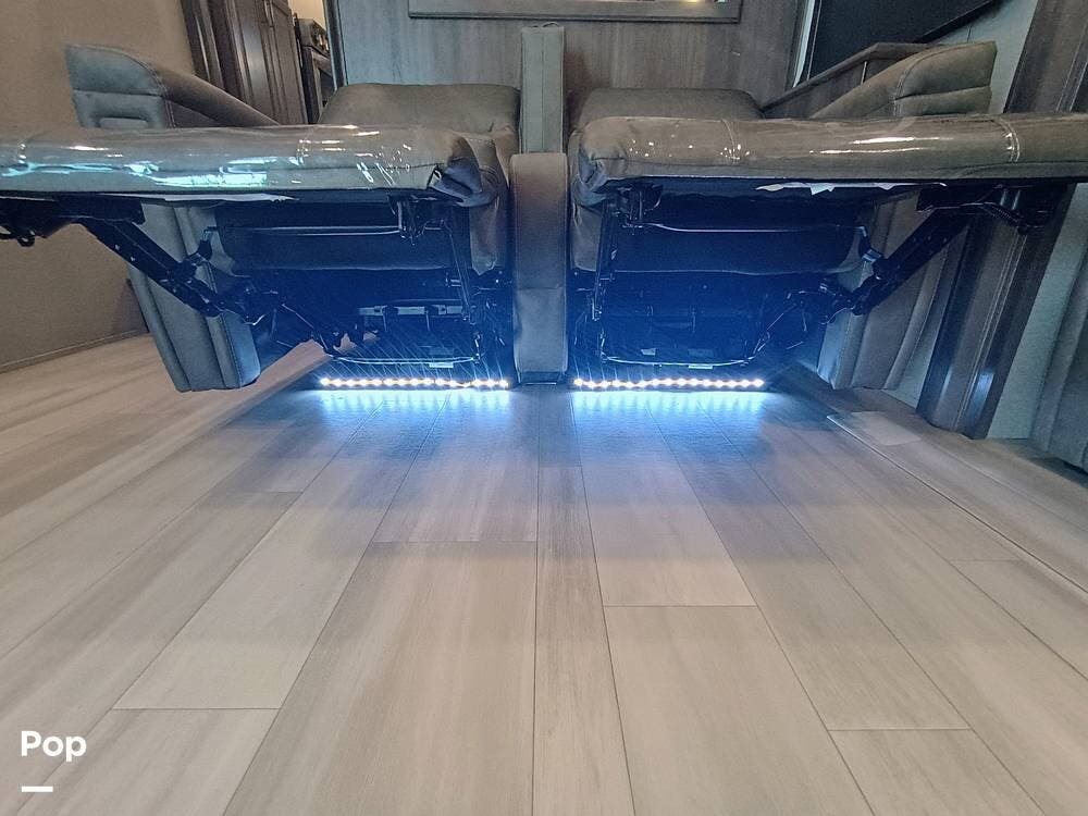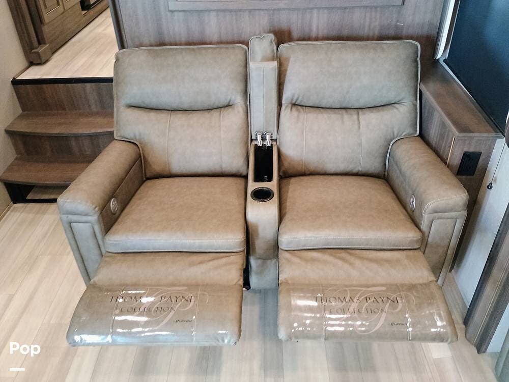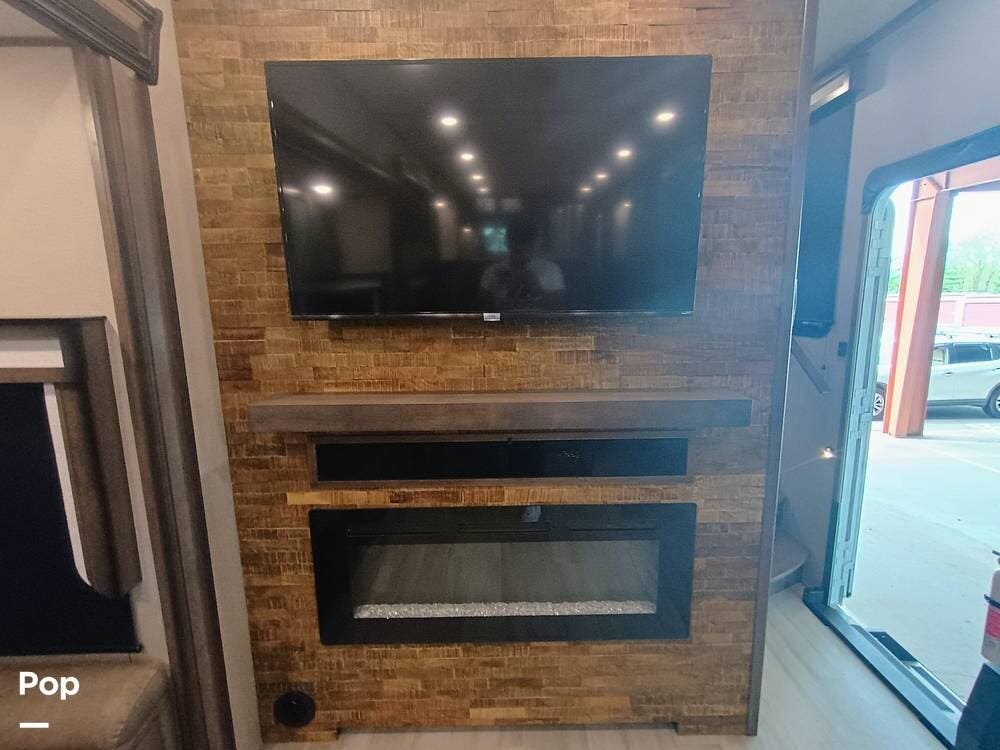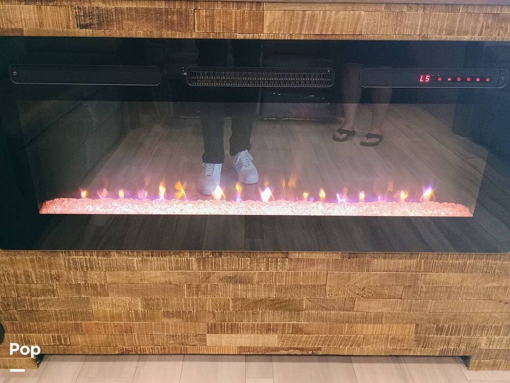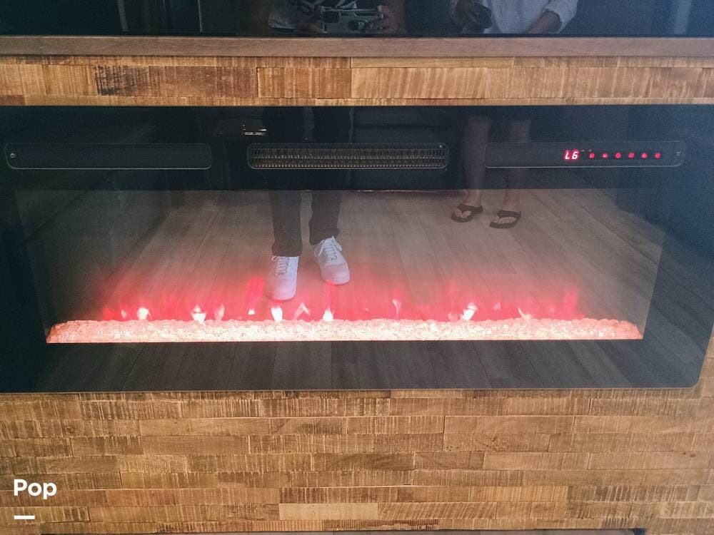 The living area welcomes you with residential-style comfort, featuring dual opposing tri-fold sofas and a pair of power reclining theater seats, perfect for lounging in front of the large entertainment center, complete with a 50" LED Smart TV and an electric fireplace. Panoramic windows let in tons of natural light. The living room provides functionality and elegance, whether entertaining guests or enjoying a quiet night in.