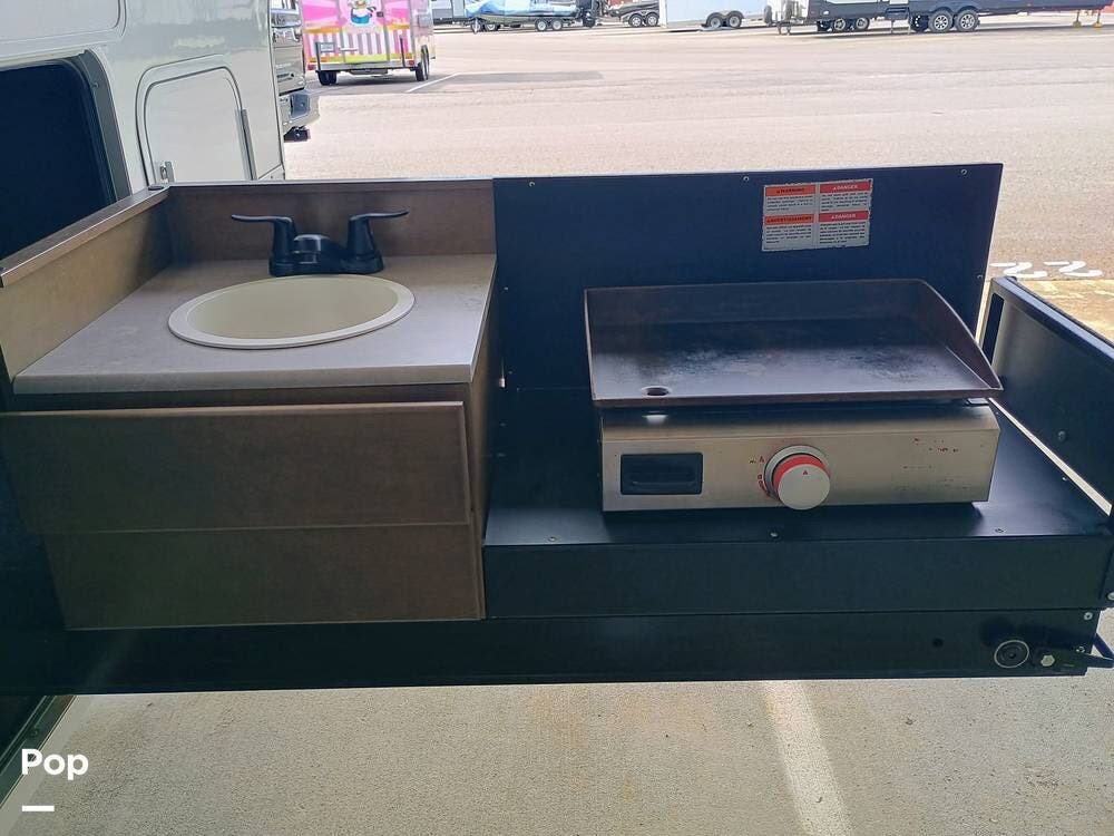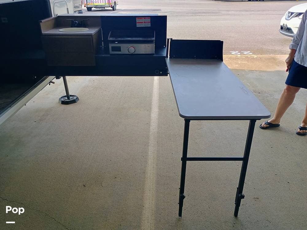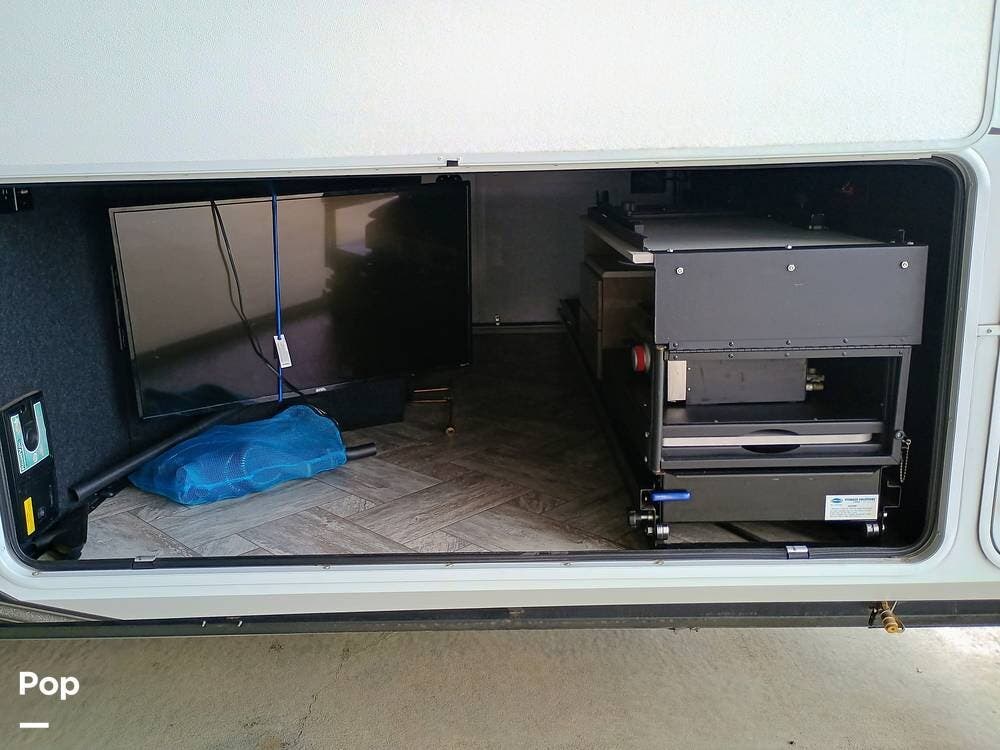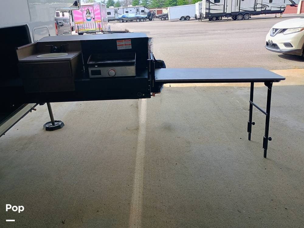 The Solitude 390RK features a pass-through basement storage compartment, offering unmatched exterior storage capacity. It also has a large outdoor kitchen that folds out, a large desk attached right next to it, and an exterior TV.