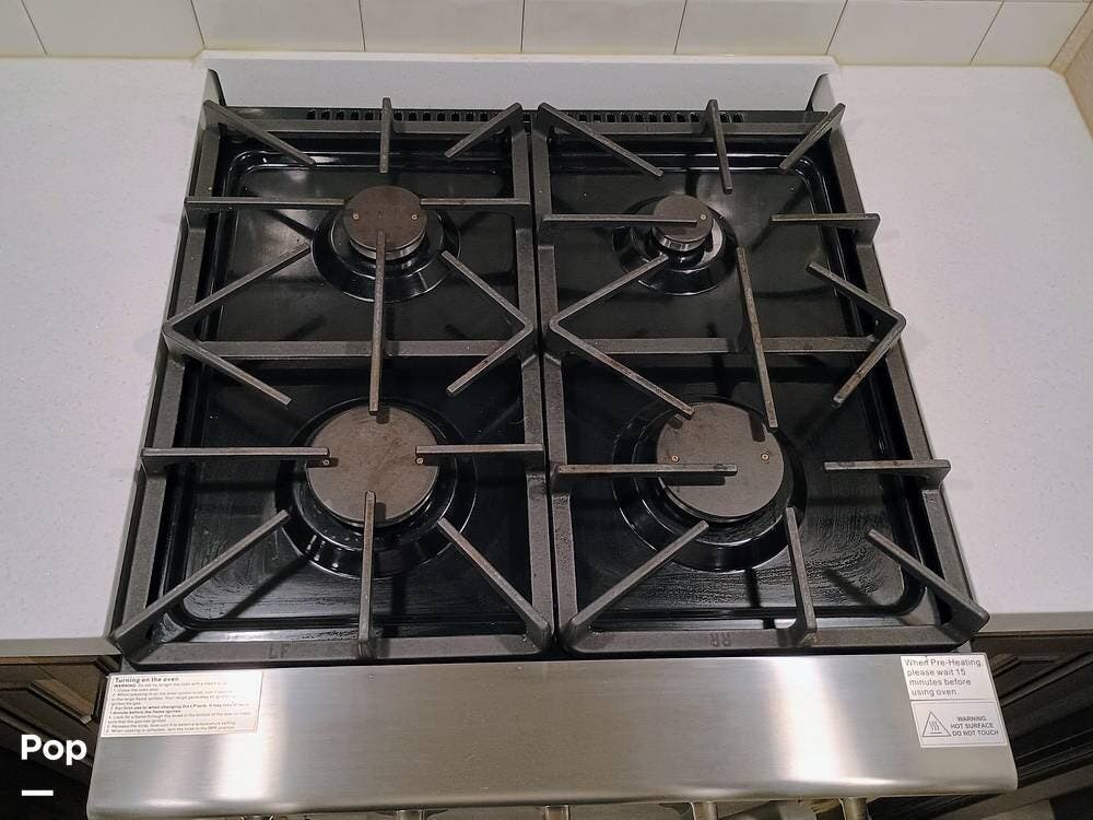 The raised kitchen is at the rear of the coach. It contains solid-surface countertops, a large stainless steel residential refrigerator, a double sink, and an oven with a four-burner range. The cabinets and deep drawers provide plenty of storage. A free-standing dinette with chairs is also in the kitchen, giving a full view of the living room and providing a great dining experience.