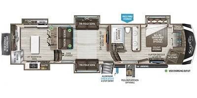 The 2022 Solitude 390RK by Grand Design is a fifth wheel crafted for extended stays, full-time RV living, or weekend getaways in style. It is approximately 40" long and has five slide-outs. This model is all about expansive living and great design.