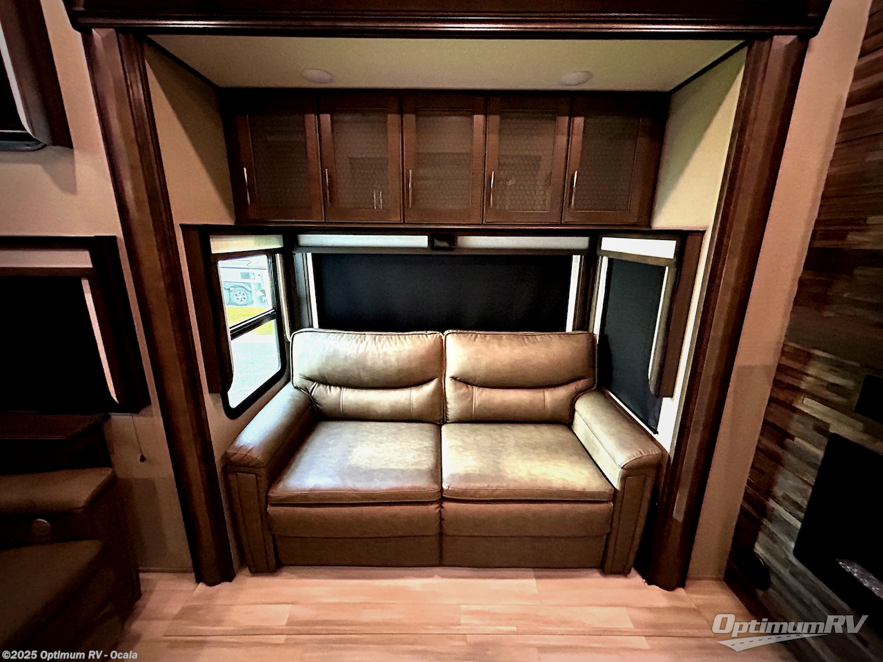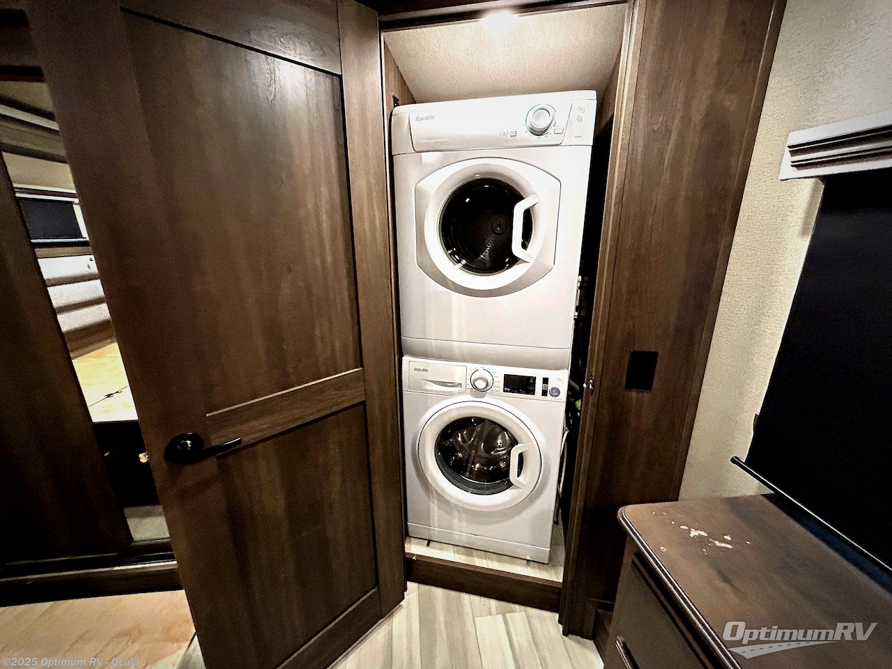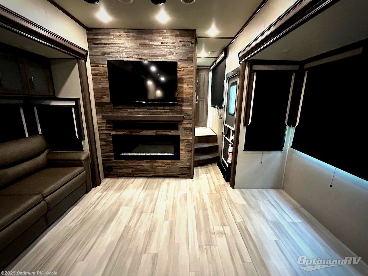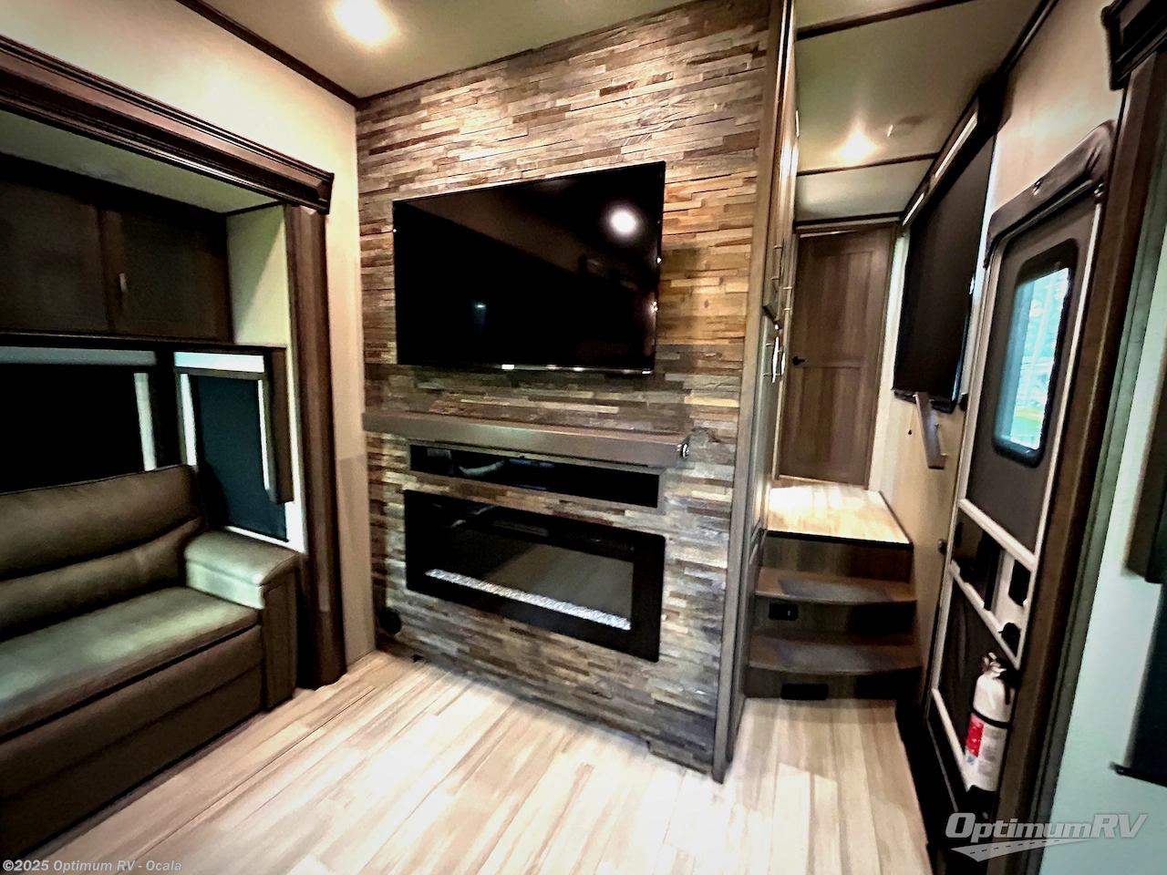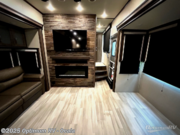 Enjoy each and every vacation, month-long trip or even extended stay at an RV park in this fifth wheel that is spacious from the front to the rear! The raised kitchen gives the cook plenty of room to whip up any type of meal using the stainless steel appliances including the 24" residential oven, the oversized pantry and the raised bar top will provide you even more counter space on top of dining with two chairs that overlook the middle living area. Relaxing is made easy with the two tri-fold sofas and theatre seating while watching the big game on the LED Smart TV and enjoying the fireplace below. Dual sinks in the full bathroom allow two people to easily get ready at once, and the seat in the shower is a nice convenience. At night, retire to your own queen bed slide after sitting on the pull-out ottoman to take your shoes off, and enjoy a show on the LED TV above the flip-top dresser, or wash some linens in the closet with a washer/dryer if you added that option.