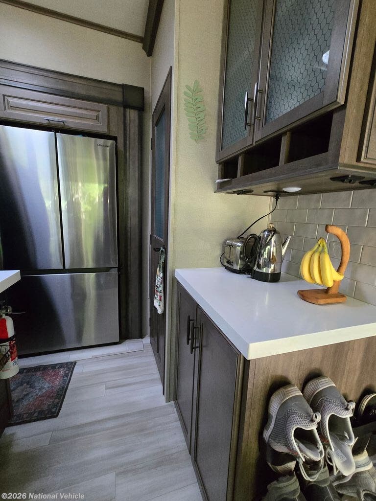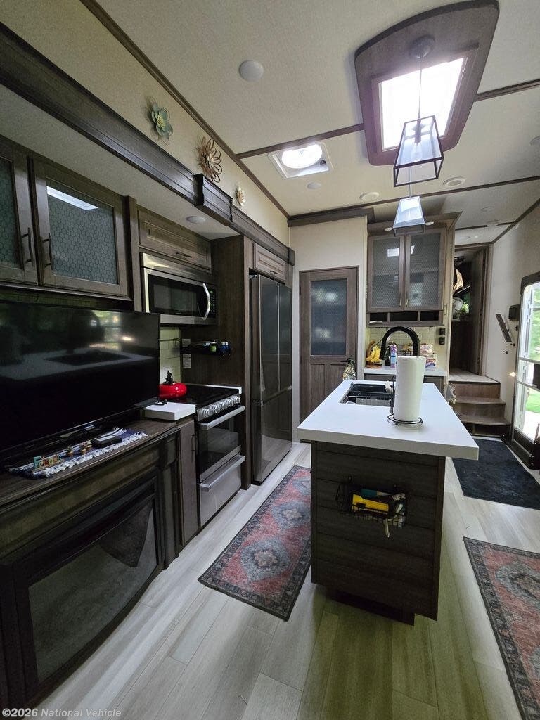 The kitchen is built for home-style living?with a center island, solid-surface finishes, a large residential refrigerator, and ample storage. The living room invites you to linger with theater-style seating, entertainment options, and big windows that bring in natural light. Dual entry doors make access easy, and the outdoor kitchen adds versatility when you want to entertain outside.