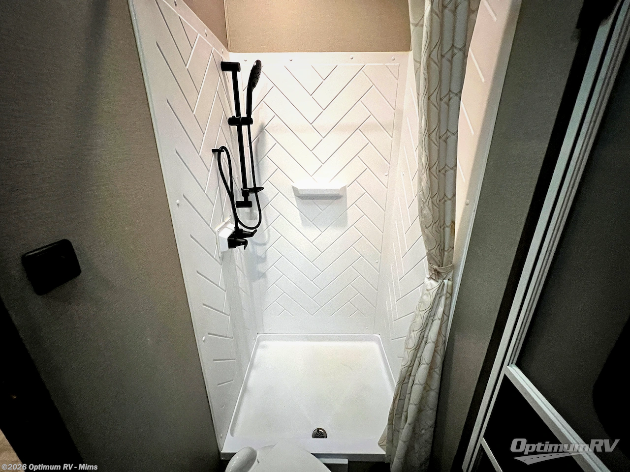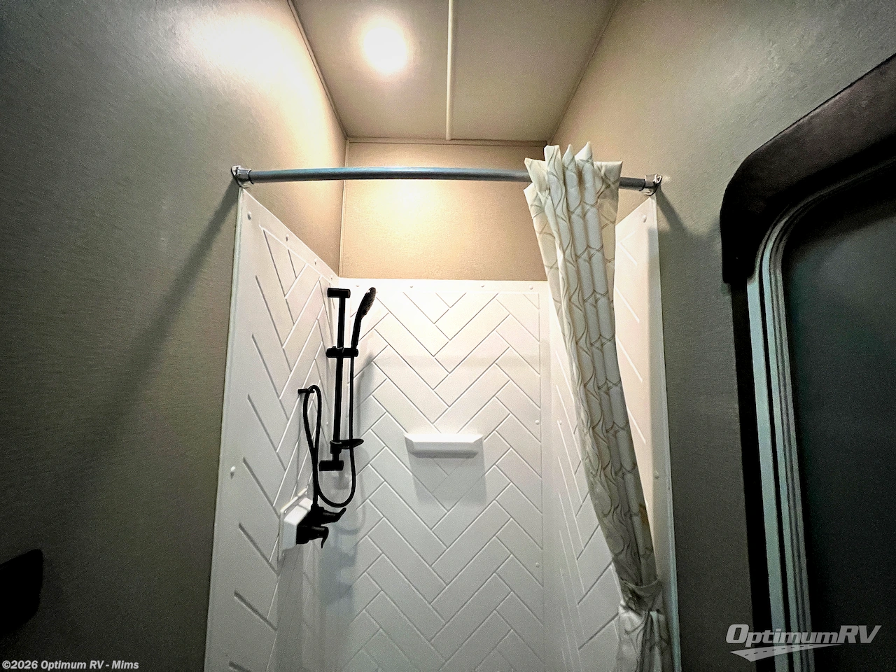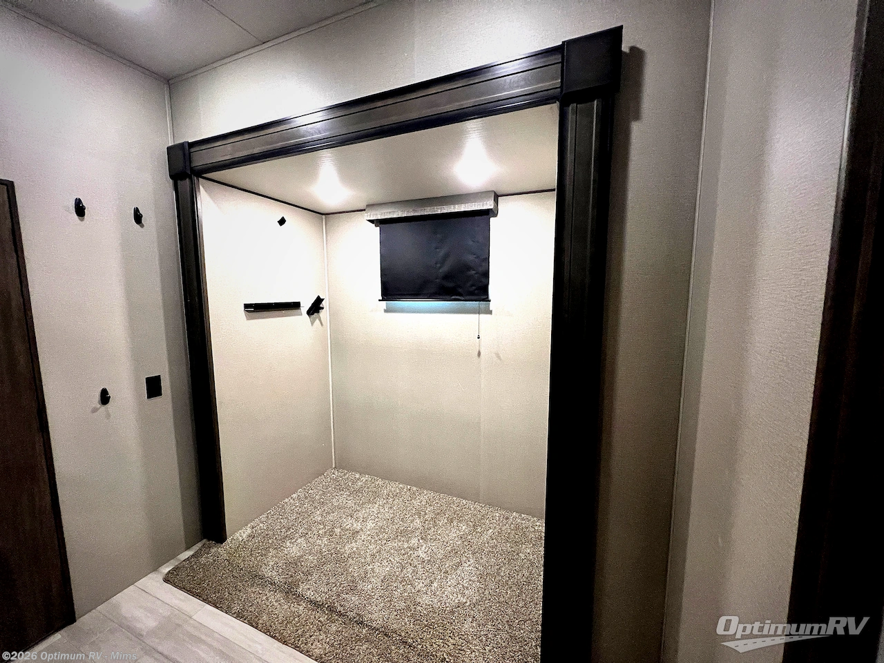 One look at this spacious fifth wheel and you'll be hooked! There are two full baths; one up front by the private bedroom, and one in the private bunkhouse. The rear bath also features a unique rear entry door for convenience. The chef of your group will love the outdoor kitchen that includes a beverage cooler, a sink, and an outdoor griddle for hot dogs and burgers. If the weather is raining on your parade, take the conversations inside to relax on the theatre seating or play a game at the free-standing dinette. There is also an LED TV here and a fireplace. This model includes plenty of storage space, including a large bedroom closet, a pantry in the kitchen, plus an exterior pass-through storage for larger camp gear!