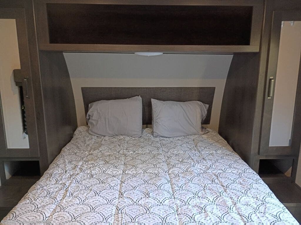 ? Private Front Bedroom: Retreat to a quiet bedroom with a walk-around queen bed, wardrobe storage on both sides, overhead cabinets, and a solid sliding door for privacy.