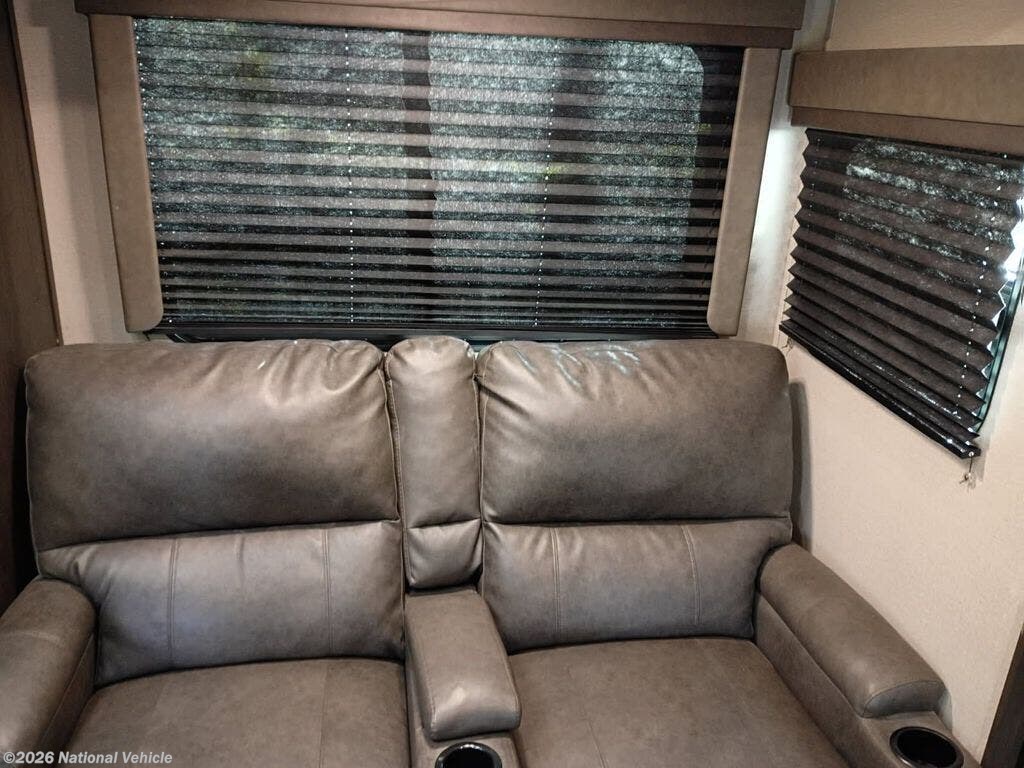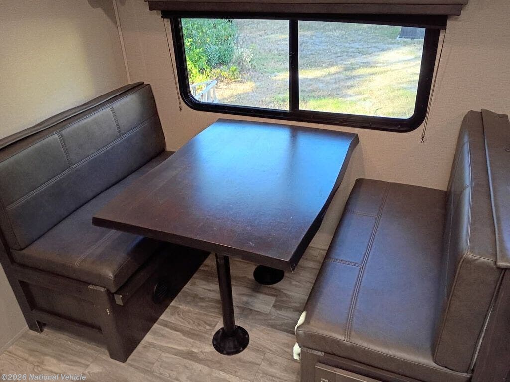 ? Relaxing Living Area: A comfortable booth dinette and theater seating sit beside oversized windows, bringing in natural light and creating a warm, open feel.