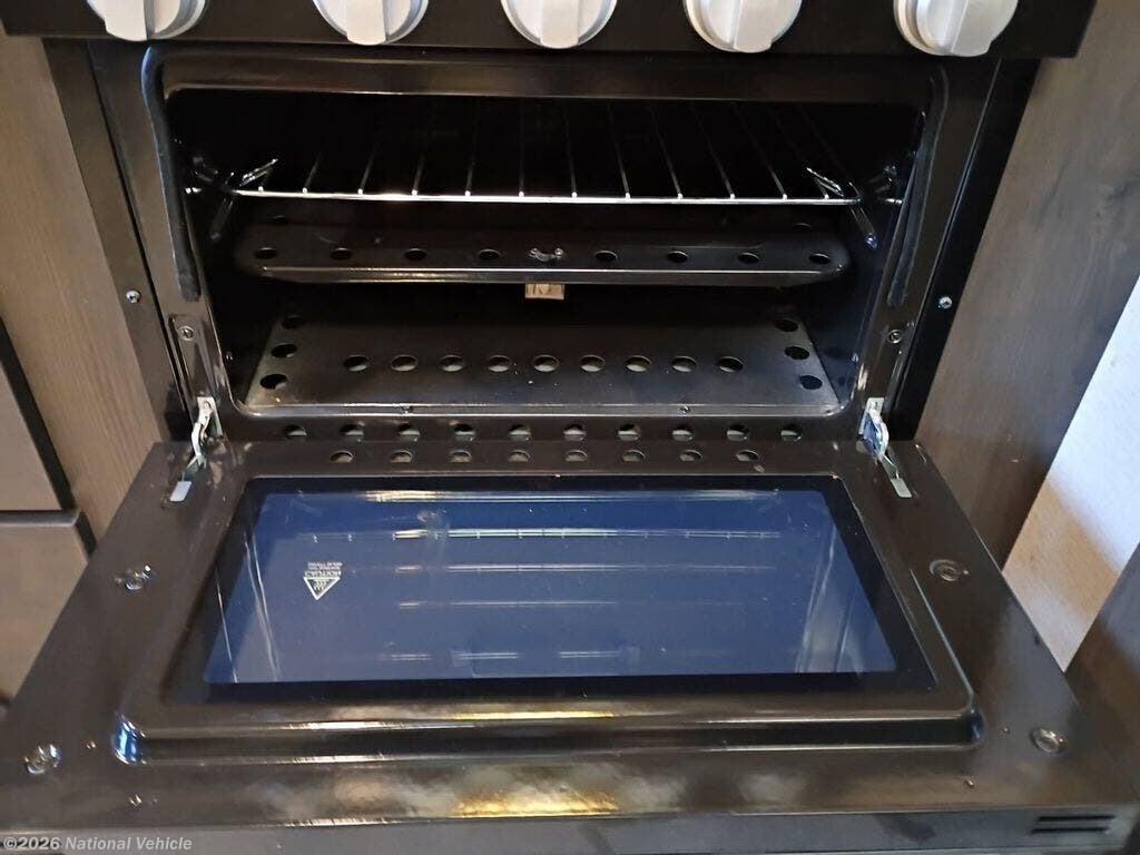 ? Rear Kitchen Layout: A beautifully arranged kitchen featuring ample counter space, large stainless-steel sink, three-burner range, oven, microwave, and generous storage. Perfect for travelers who love to cook on the road.