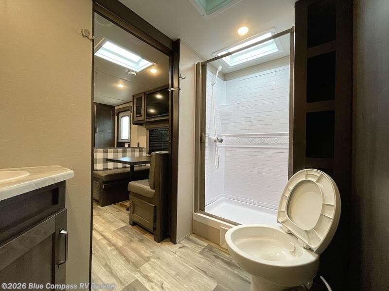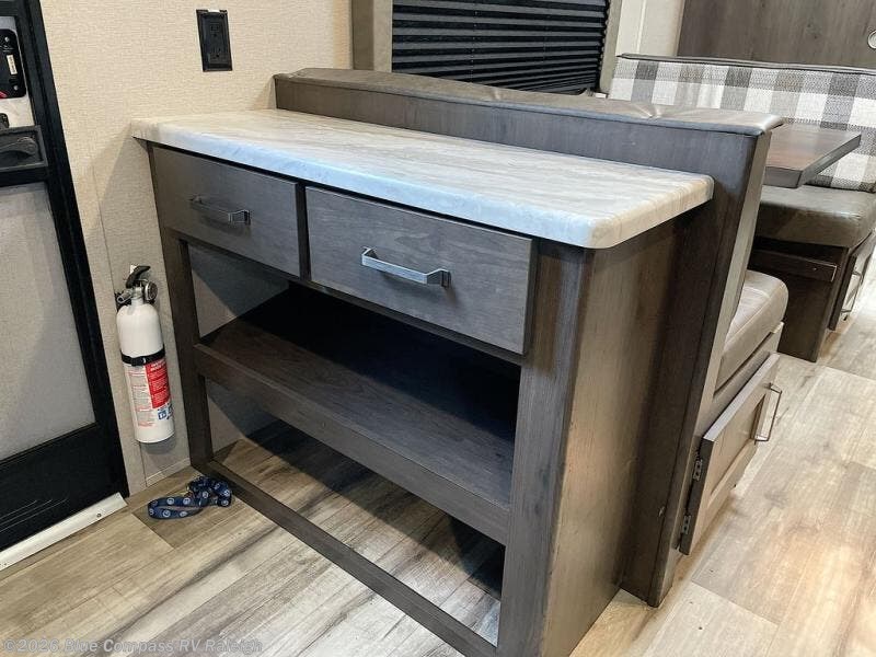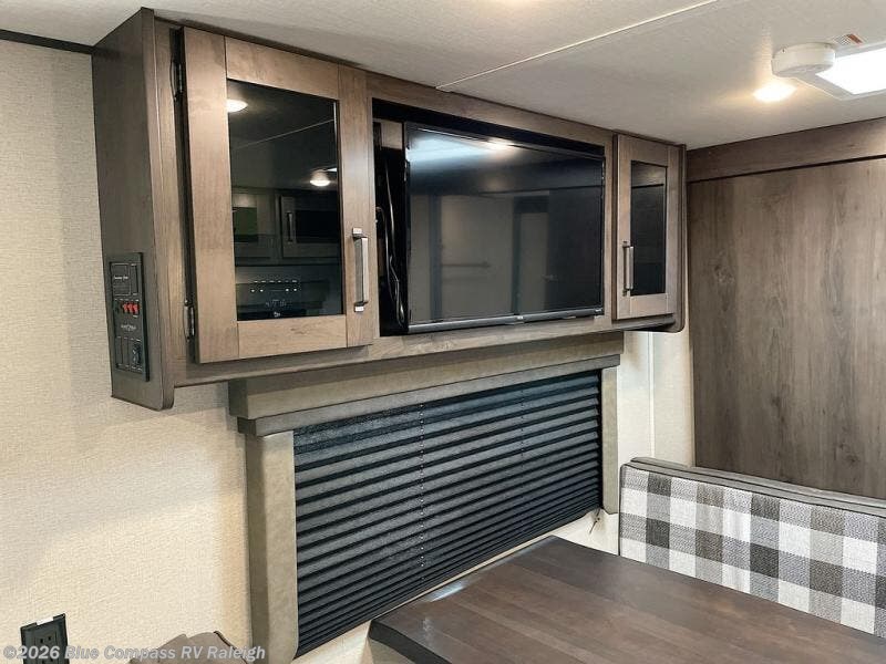 This Transcend Xplor travel trailer is a perfect trailer for couples who are looking to get away with each other! It has a large walk-through bathroom that leads right into the rear private bedroom, so you'll have an easy time getting ready in the morning. The large windows offer great airflow, and the front pass-through storage has plywood backing for different storage options. You can relax on the 69" rollover sofa across from the LED HDTV, and there is also seating at the booth dinette which is directly below the TV. To your left when you enter this trailer, you'll find a countertop with shoe rack, so you can set your wallet and keys down when you come and go.