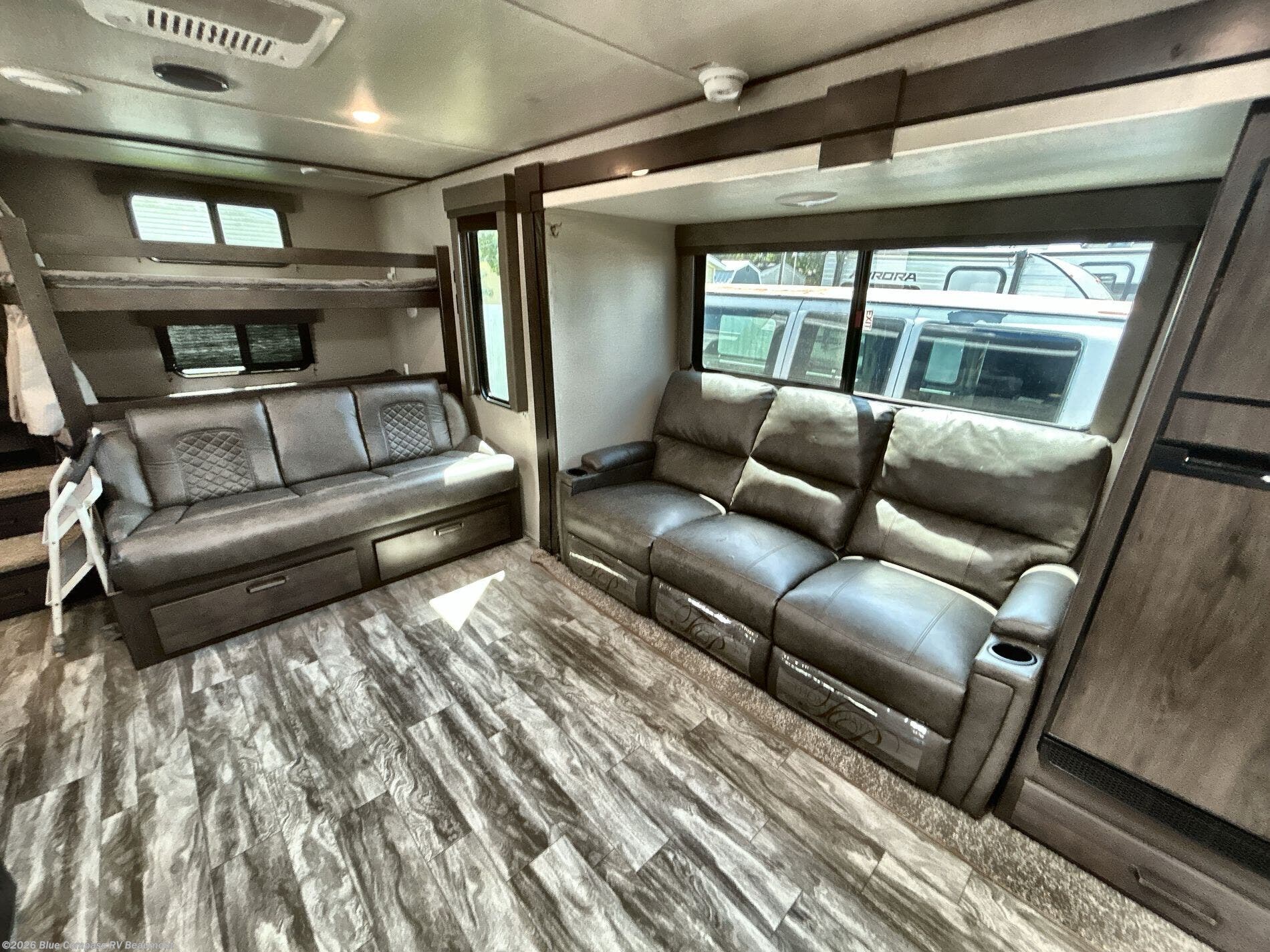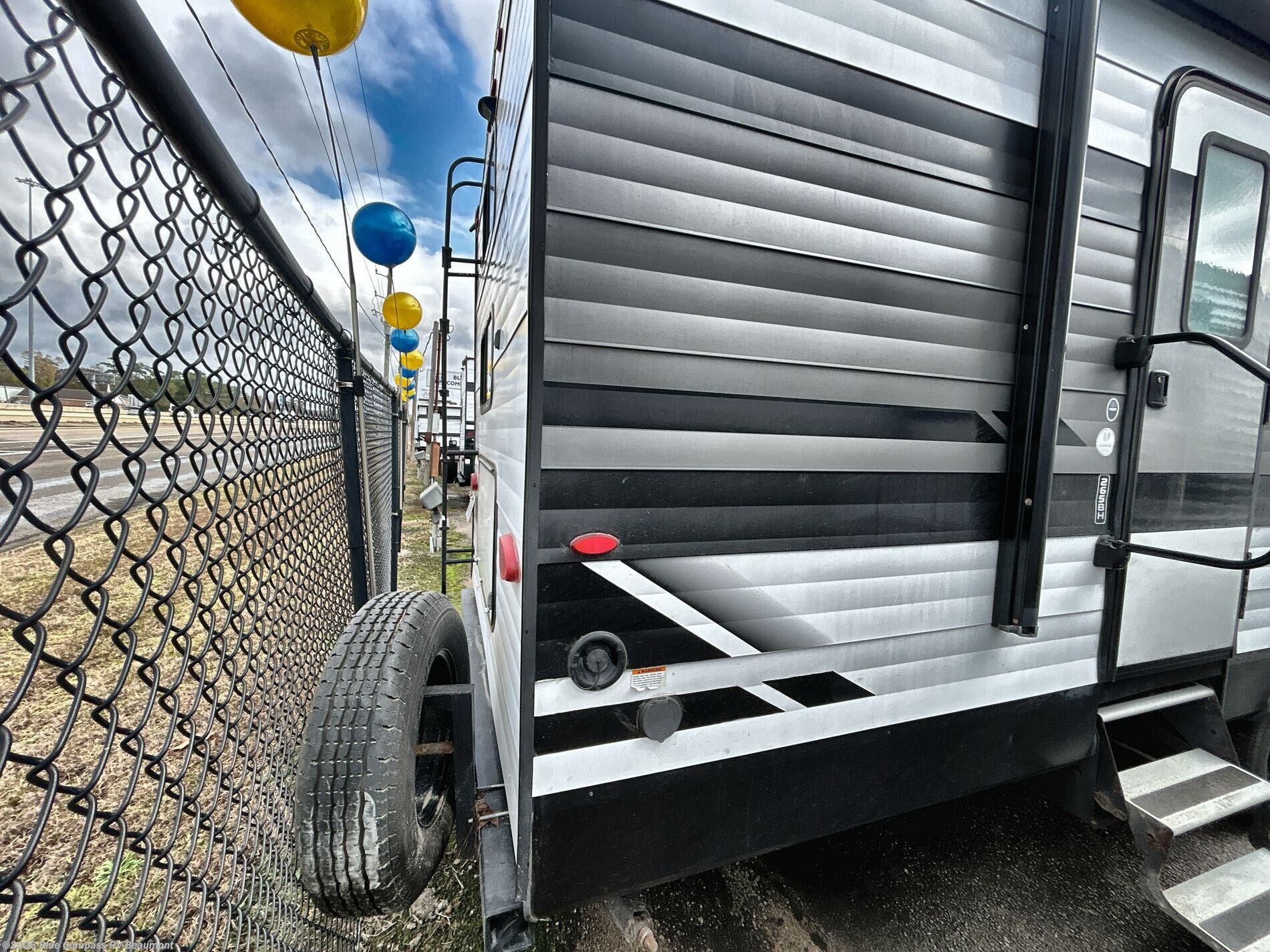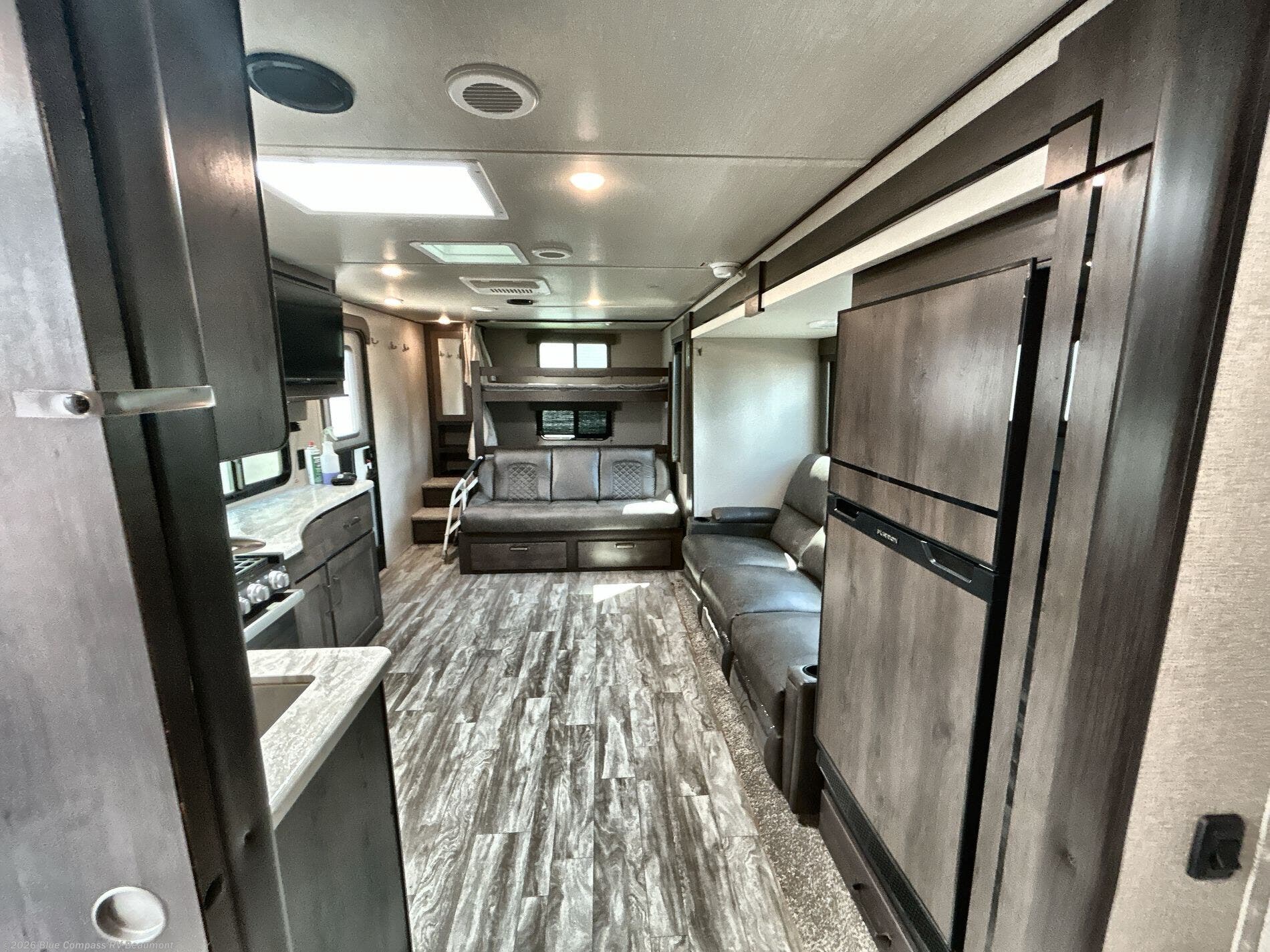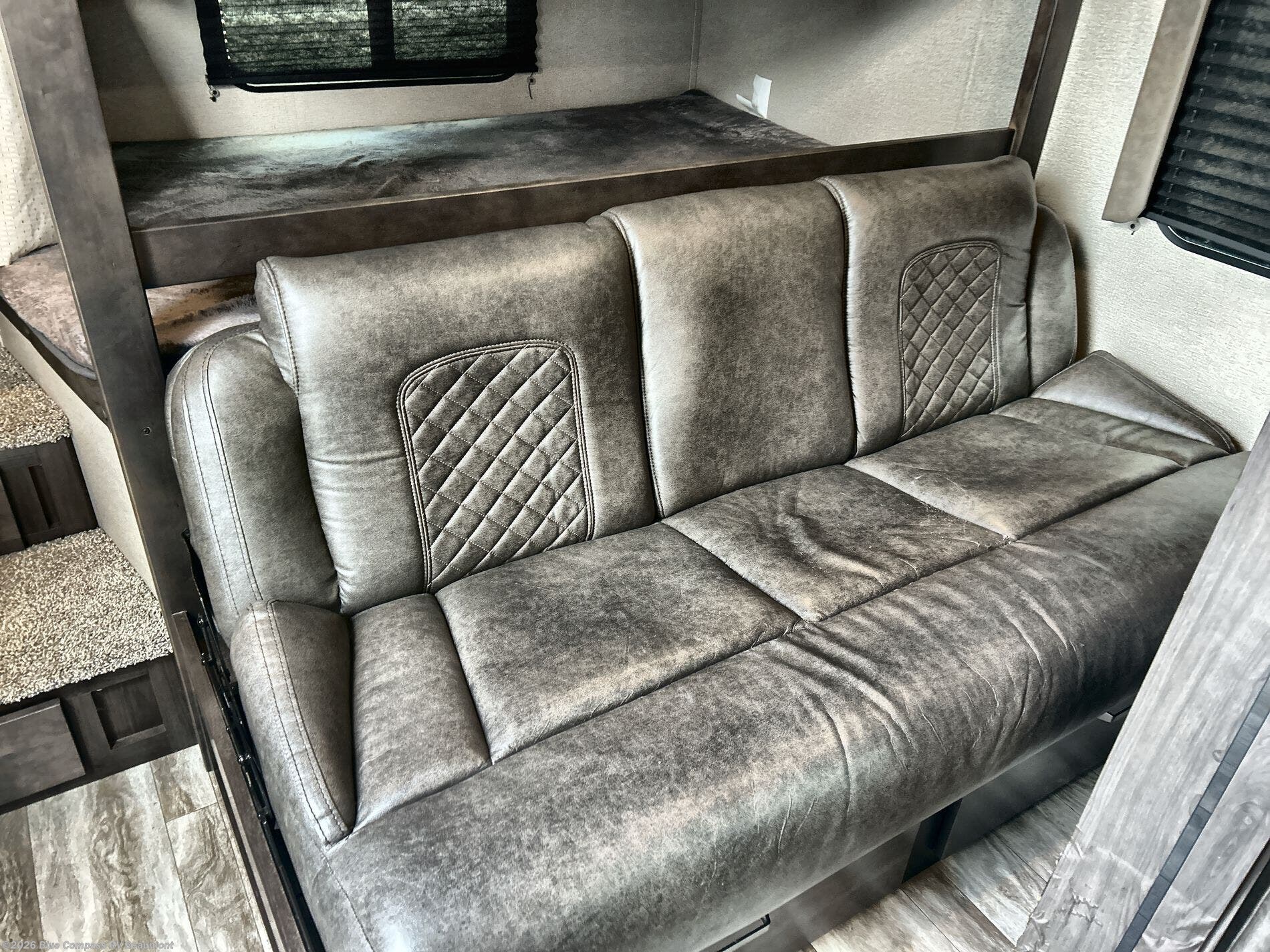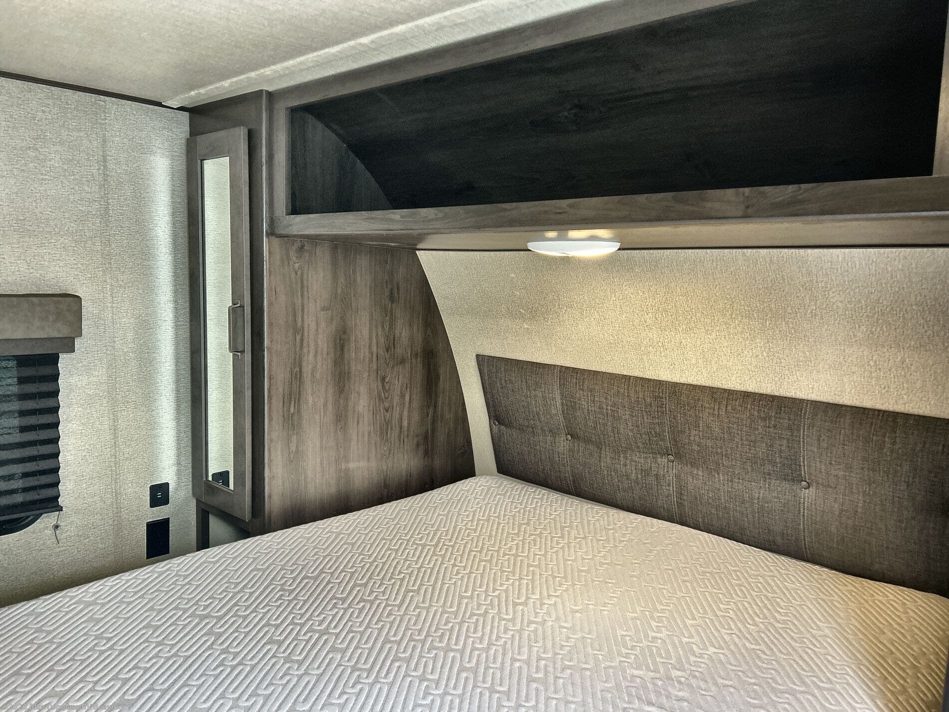 Are you ready to camp in comfort with your family or friends? This travel trailer allows you to do just that! There are double-size bunks in the back with two steps that have storage for books or board games. There is also a closet here to keep clothes wrinkle-free. The U-shaped dinette within the slide out can be switched out for the optional theatre seats, and the jackknife sofa will be the perfect spot to visit with your crew. This model features a walk-through bath that leads to the front master bedroom. You'll love the queen bed here, overhead storage, and your own exterior entry door for convenience.