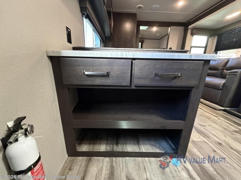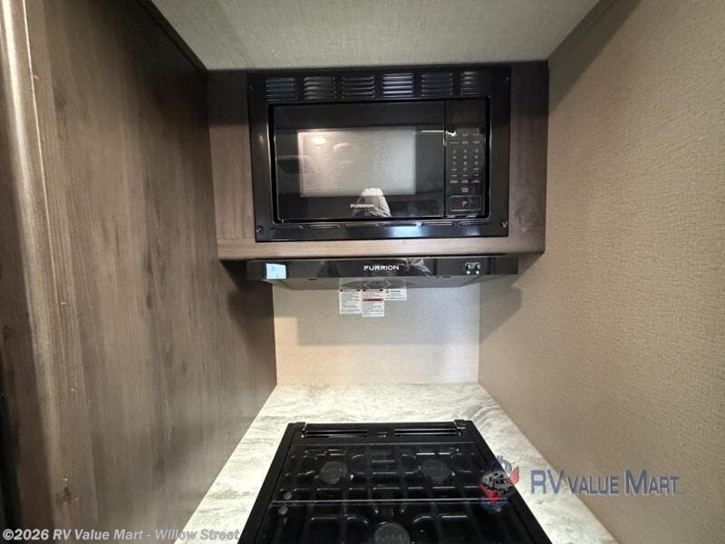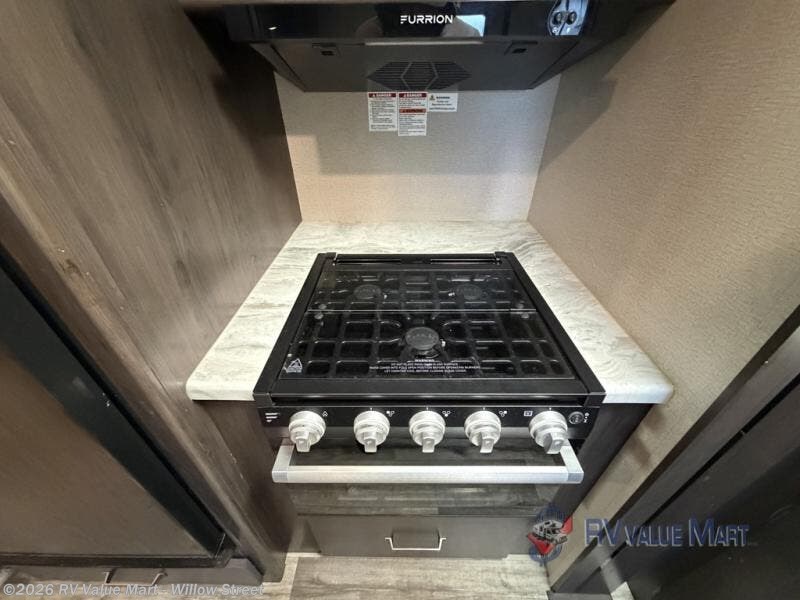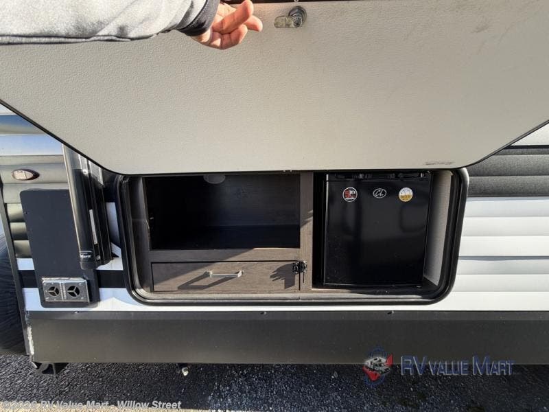 A rear private bunkhouse plus a front private bedroom make this the perfect family-friendly trailer. There are two bunks, a residential full bed, plus three dressers to store clothes in the bunkhouse. The 42" x 22" rear storage will be great for hiking gear or extra lawn chairs, and you'll find tons of interior storage throughout for all your belongings. Head to the main living area to relax on the tri-fold sofa or booth dinette, or you may just want to visit with the cook outside as they use the outdoor kitchen! There is an LP quick connect, an exterior spray port, a two-burner cooktop, plus a 1.6-cu. ft. exterior refrigerator. Now that's a convenient outdoor kitchen!