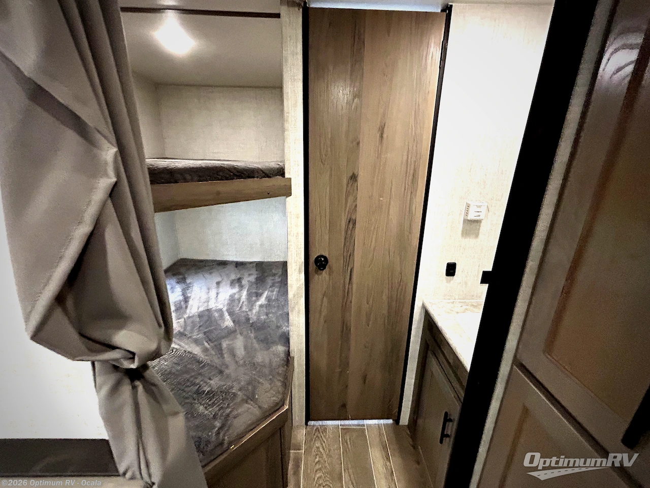 Invite more along with double-size bunks in this travel trailer! The private shower and toilet is close to the bunks if you're camping with little ones, and there is a sink just outside the door so two people can freshen up at once. You and your spouse will get comfortable on the front queen bed, or you can choose the optional Murphy bed to enjoy more seating space during the day. This model includes a booth dinette to dine at each day, or you can sit outside under the electric awning!
