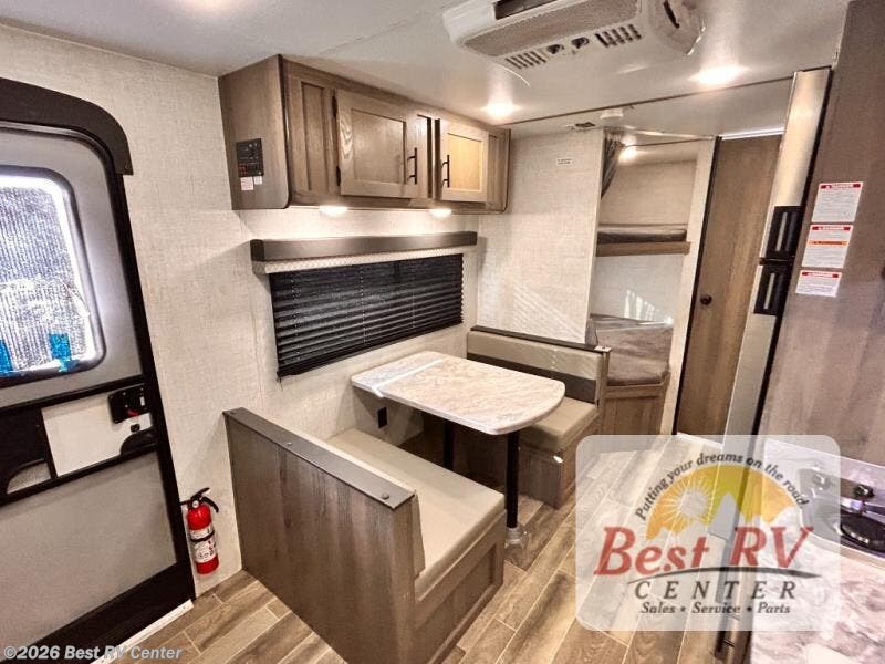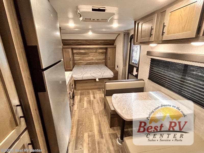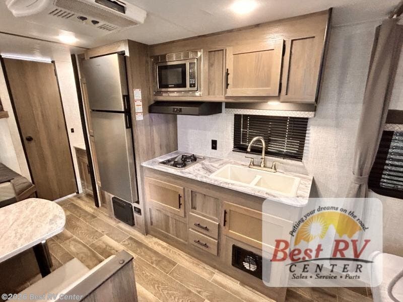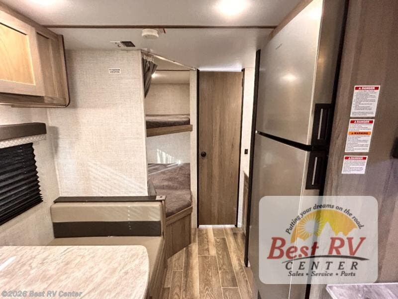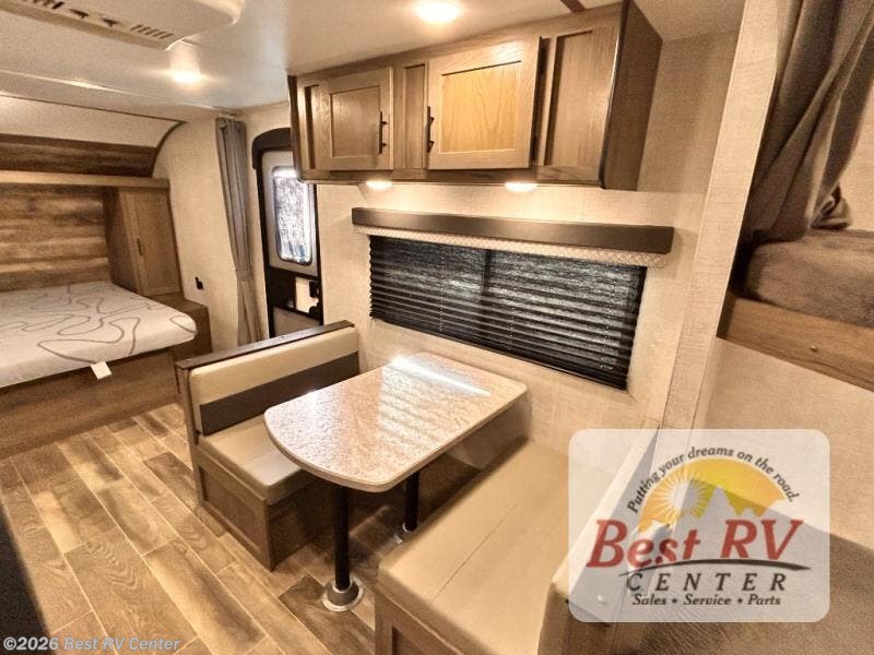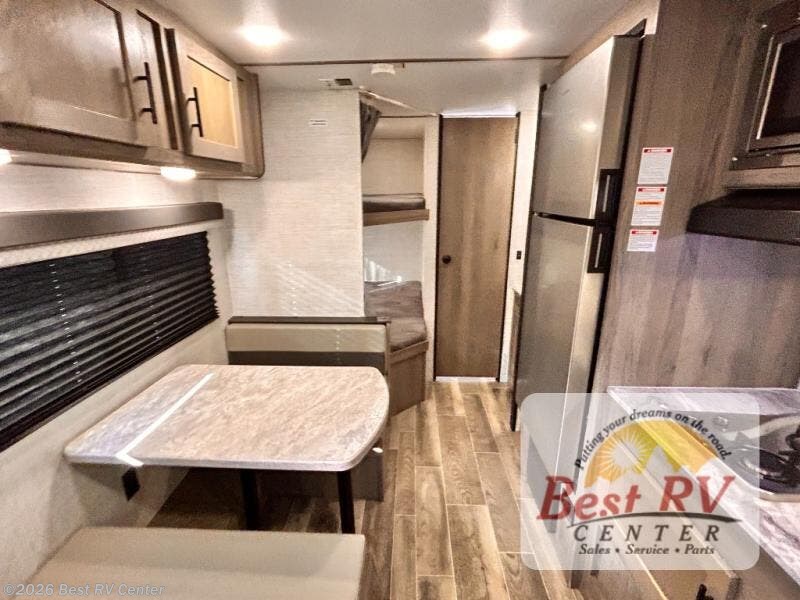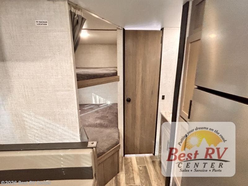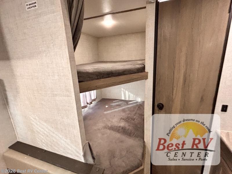 Invite more along with double-size bunks in this travel trailer! The private shower and toilet is close to the bunks if you're camping with little ones, and there is a sink just outside the door so two people can freshen up at once. You and your spouse will get comfortable on the front queen bed, or you can choose the optional Murphy bed to enjoy more seating space during the day. This model includes a booth dinette to dine at each day, or you can sit outside under the electric awning!