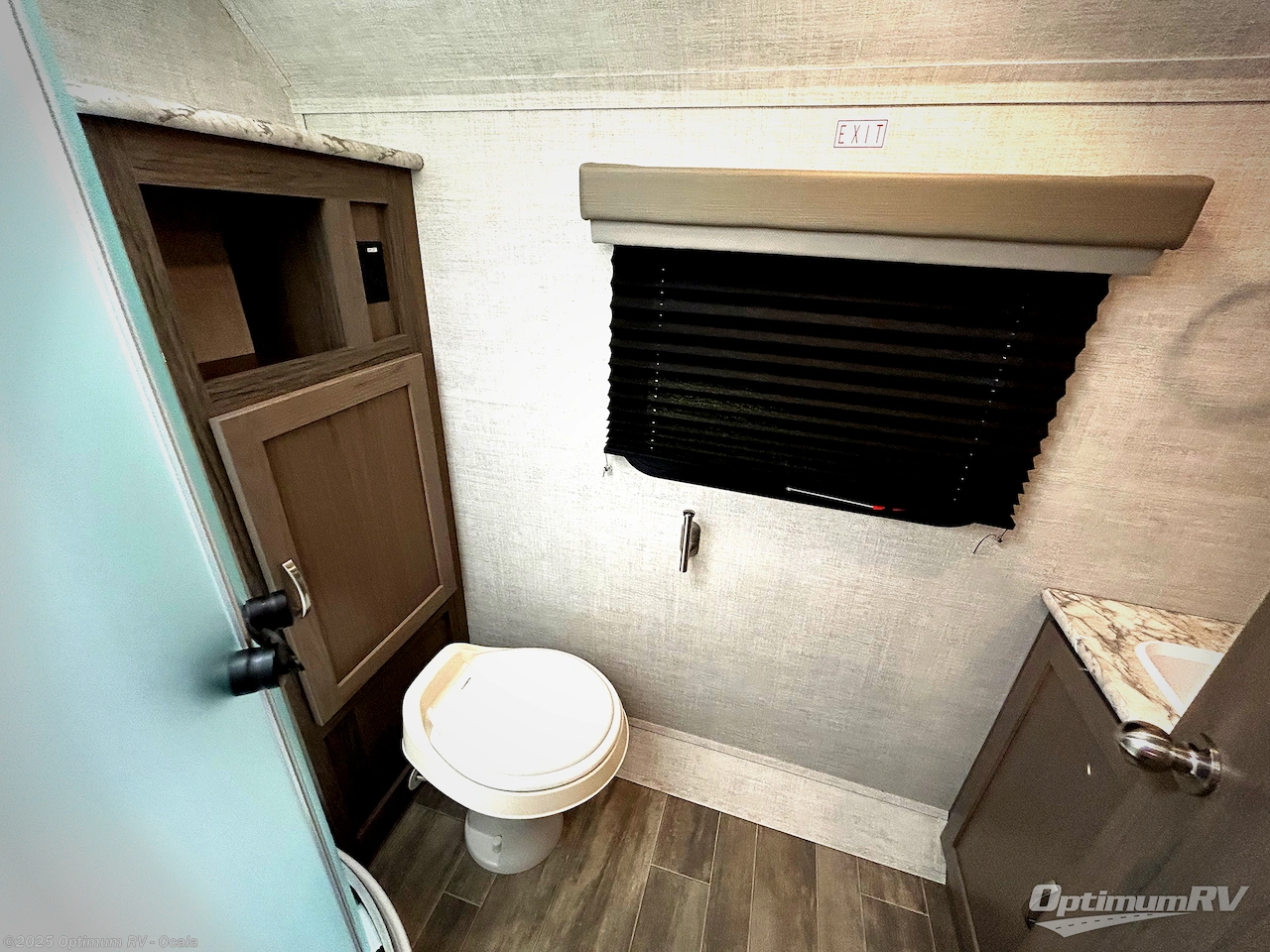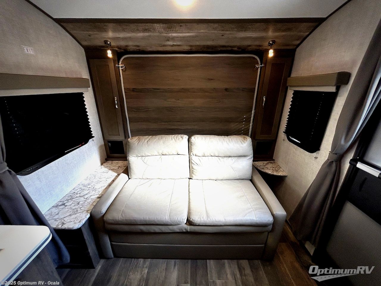 A flat floor entry helps you to safely enter and exit this travel trailer! The front jackknife sofa converts into a Murphy bed so you can have versatile living, and there is a privacy curtain to draw at night. The booth dinette can also transform into a sleeping space for one adult or maybe two small children when you're not using it to enjoy a meal or play a card game. Stay clean and fresh in the rear full bathroom with a shower, a linen closet, and plenty of countertop space around the sink!