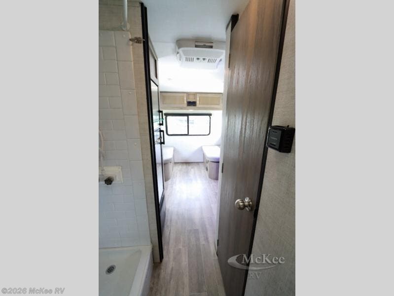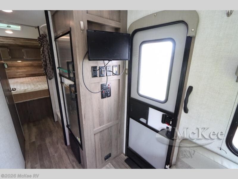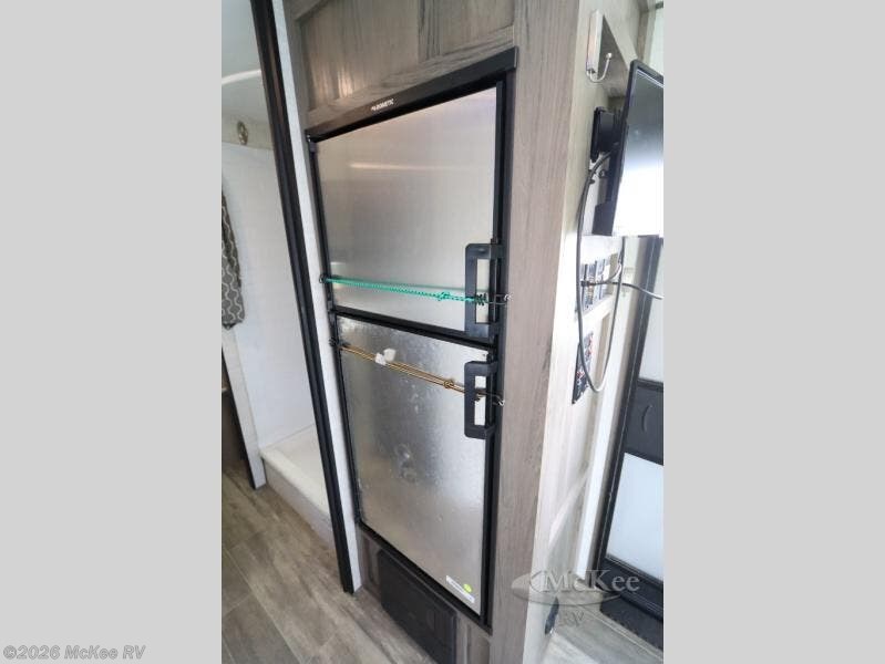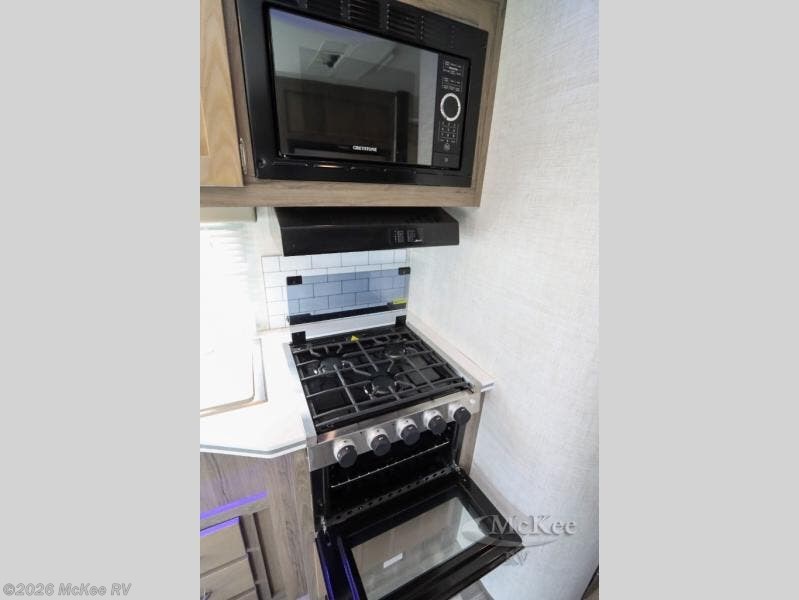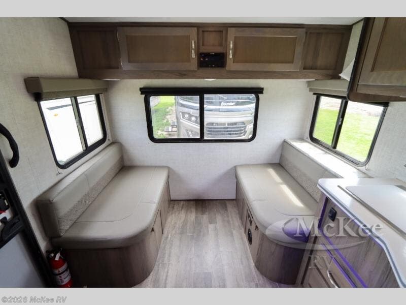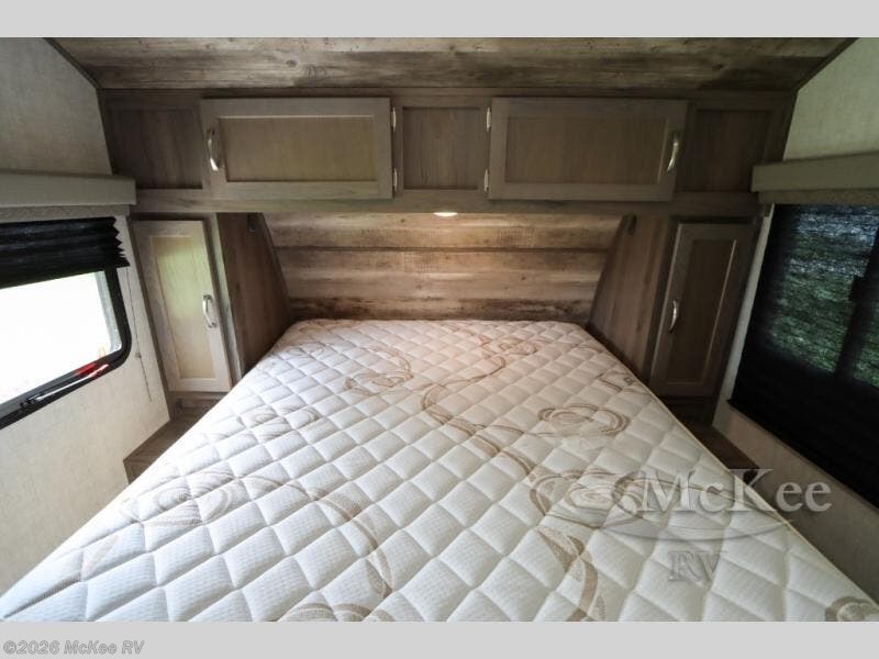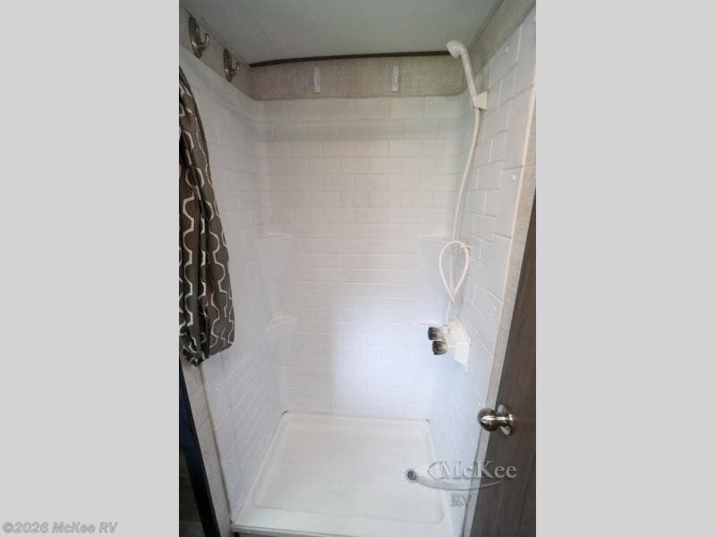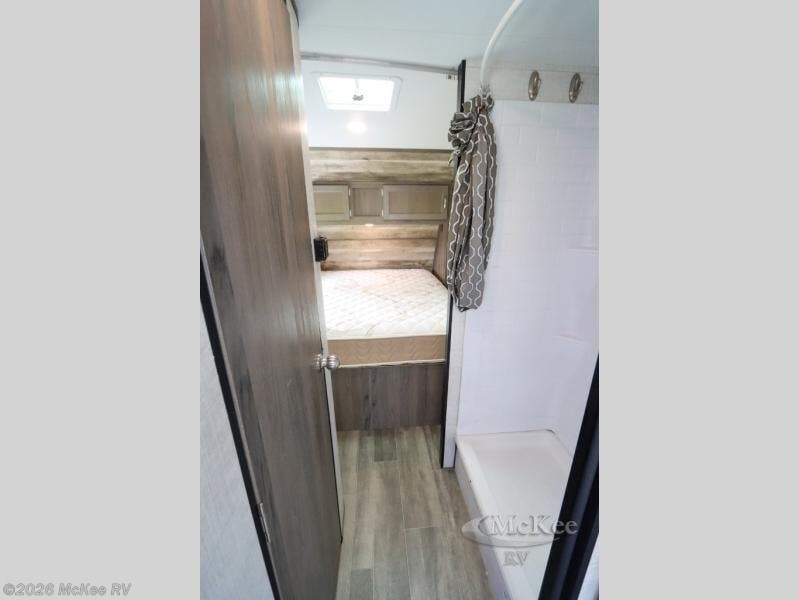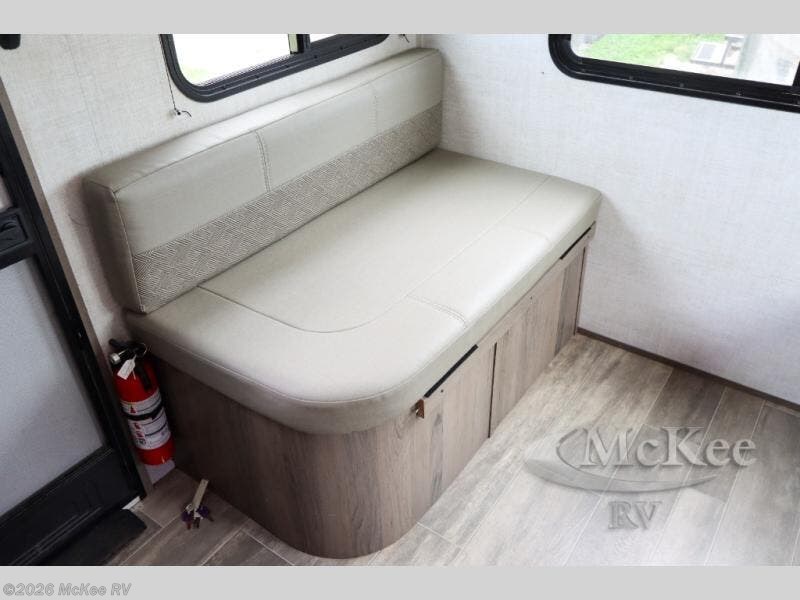 You will feel right at home in this travel trailer with the front queen bed that has privacy curtains to draw at night and shirt closets! The separated bathroom makes it easy for one to take a hot shower while another washes up for dinner. You can prepare delicious home cooked meals with the two burner cooktop and enjoy them at the rear booth dinette. The dinette can also transform into an extra sleeping space and there is a TV mount location diagonal to it too!
